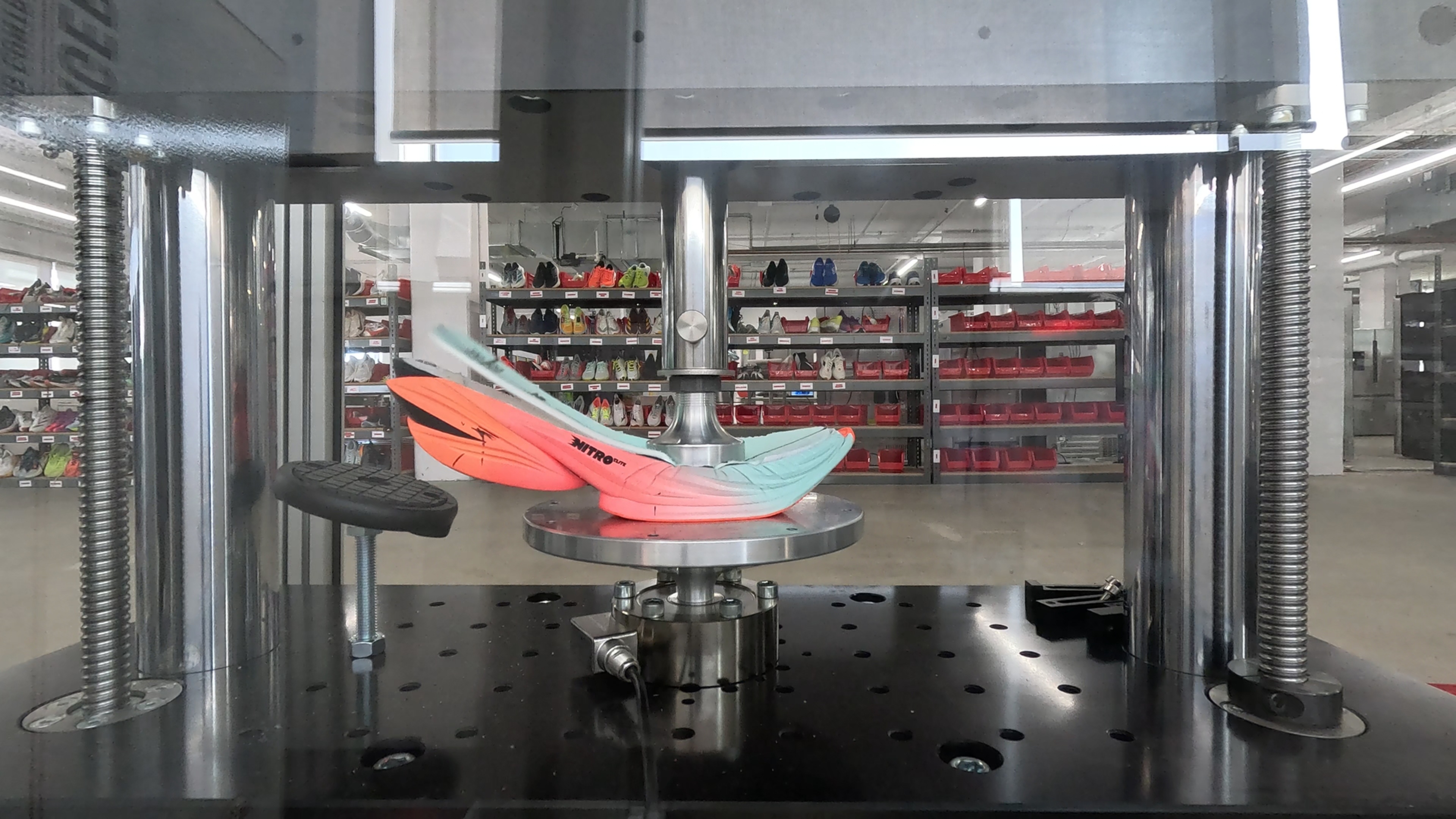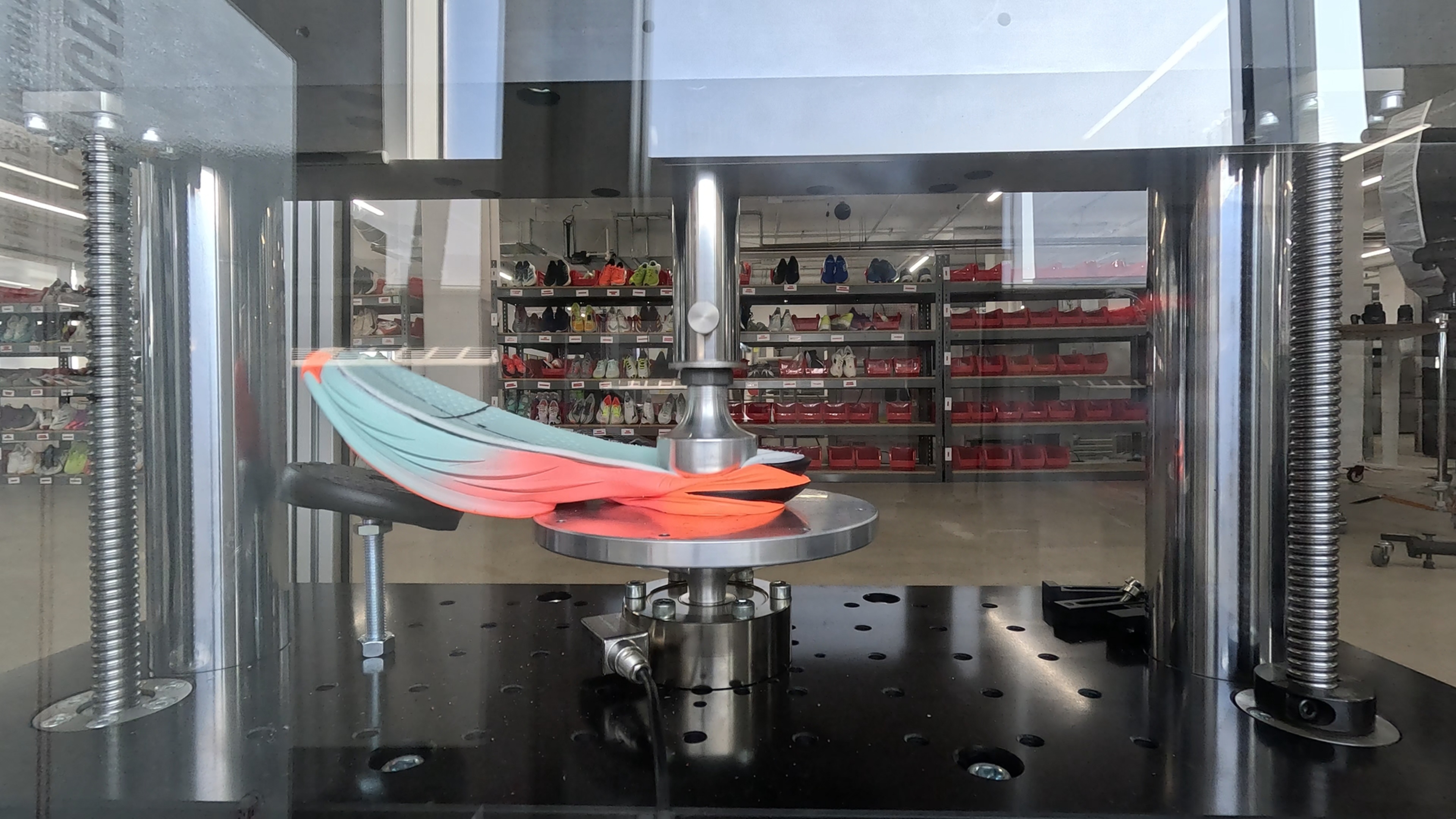 Note that because the shoe's unique heel geometry causes it to slide under compression, we slightly adapted our methodology by shifting the compression point to 25% of the heel length (instead of the usual 12%) to get reliable and comparable results.