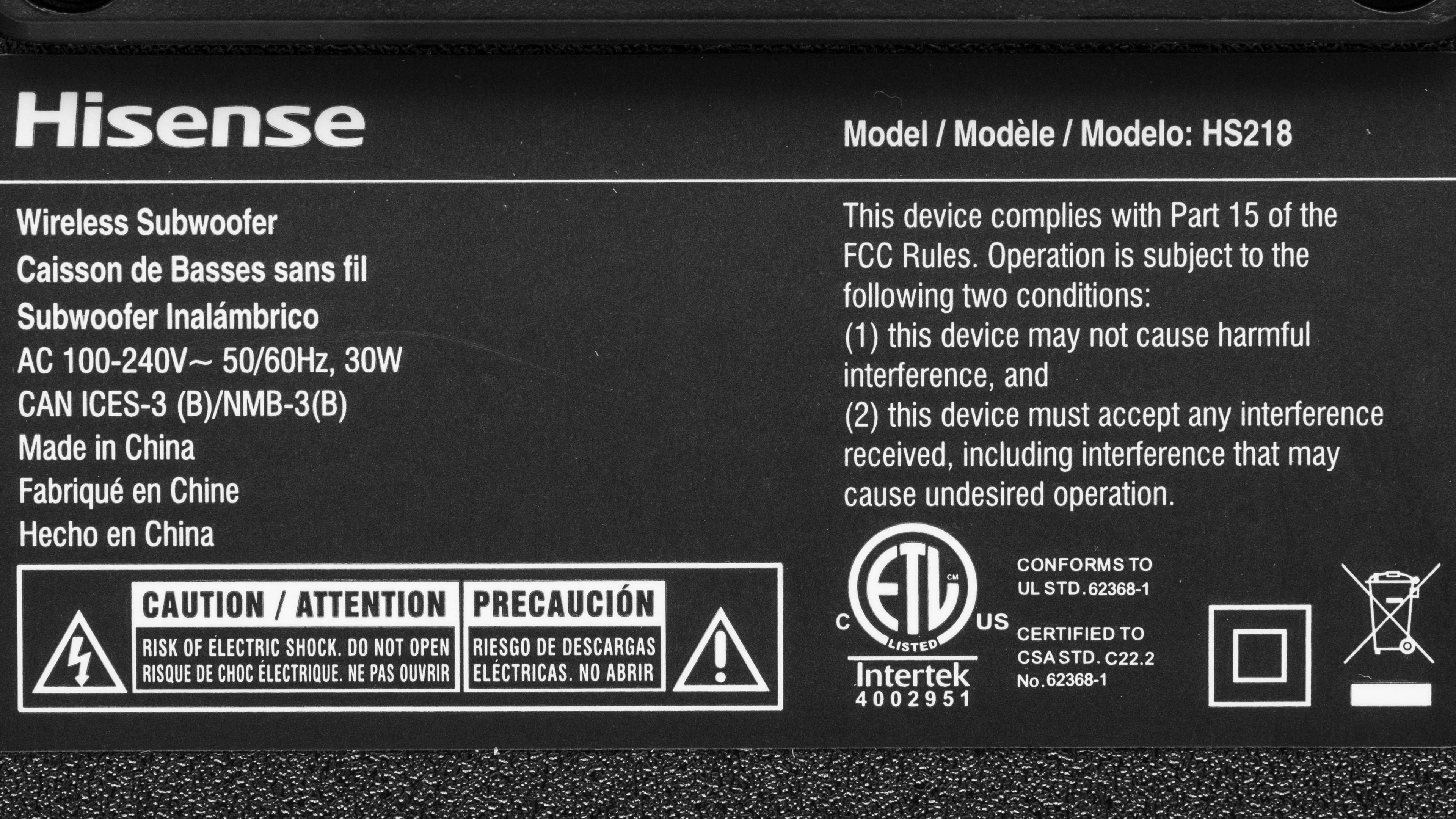 The Hisense HS218 soundbar comes in 'Black', and you can see the label for the model we tested here.