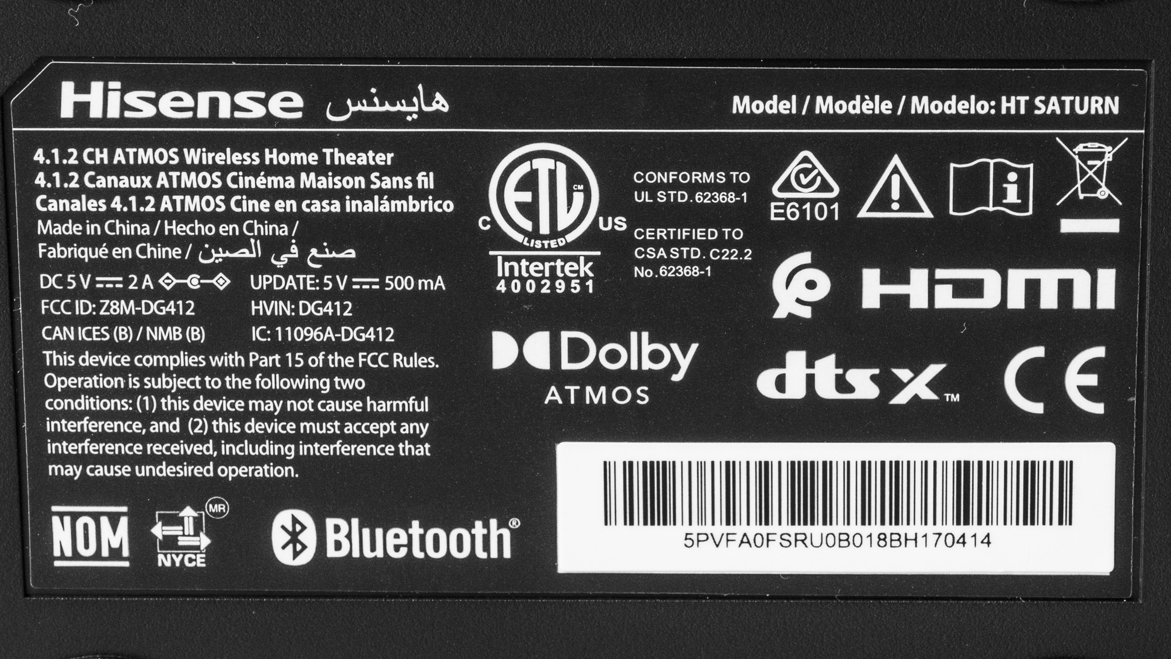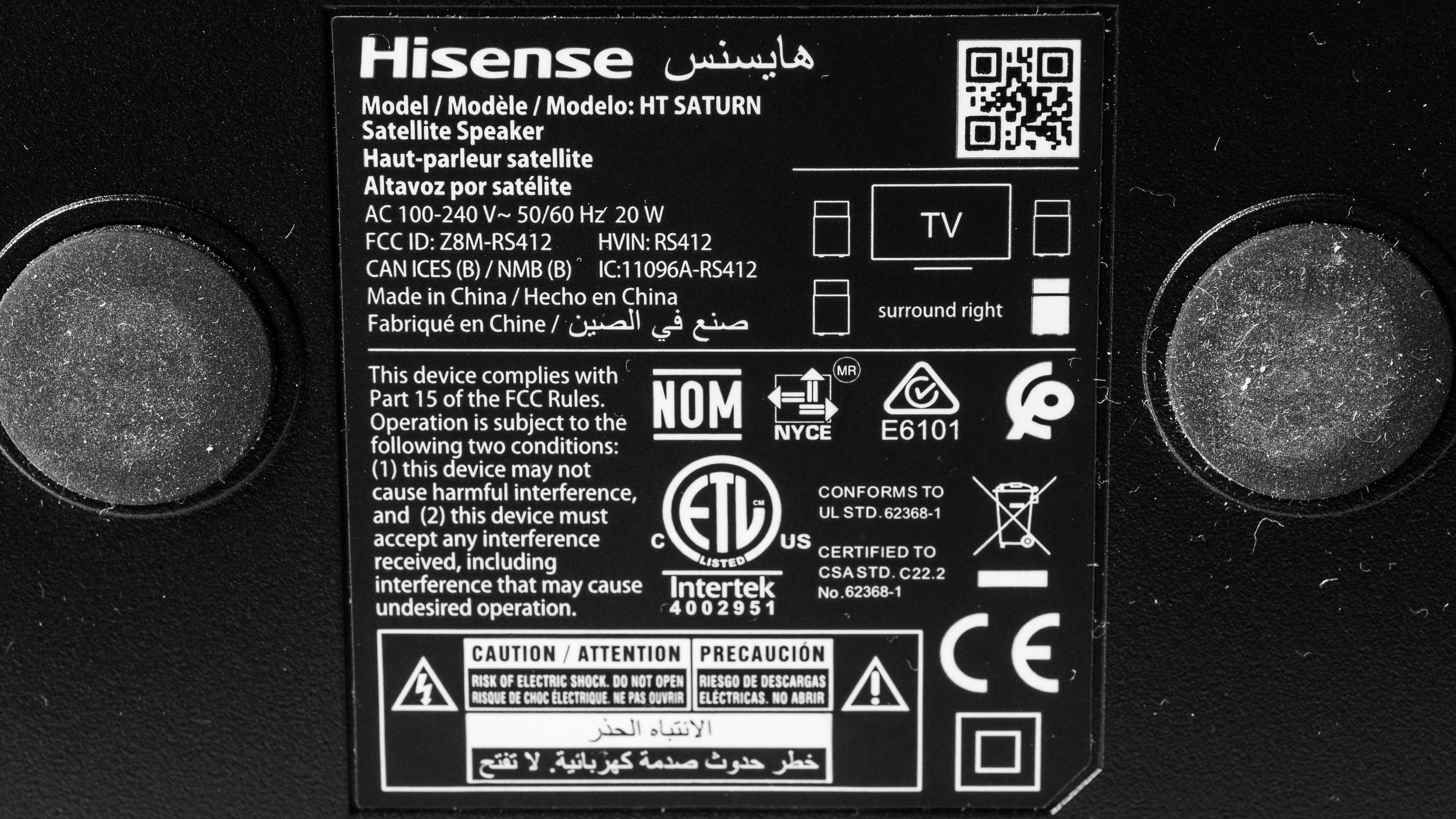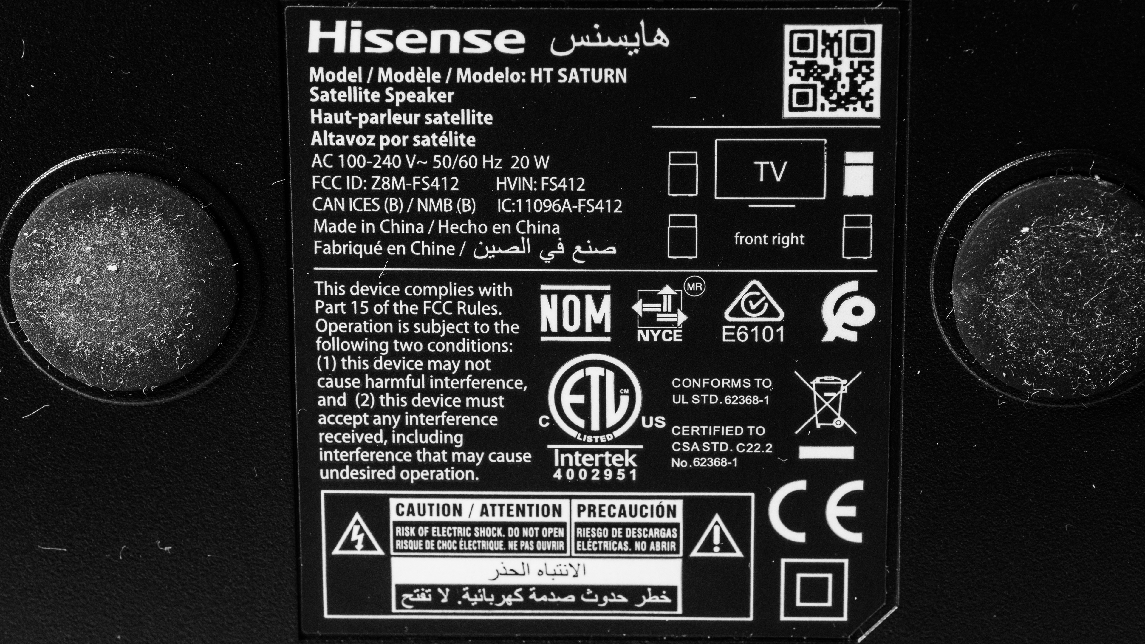 The Hisense HT Saturn comes only in one color, 'Black.' Here are the labels for the control box receiver, one of the front-facing speakers, the subwoofer, and one of the rear speakers from our unit. If you come across another variant of this soundbar, let us know in the comments, and we'll add it to the review.