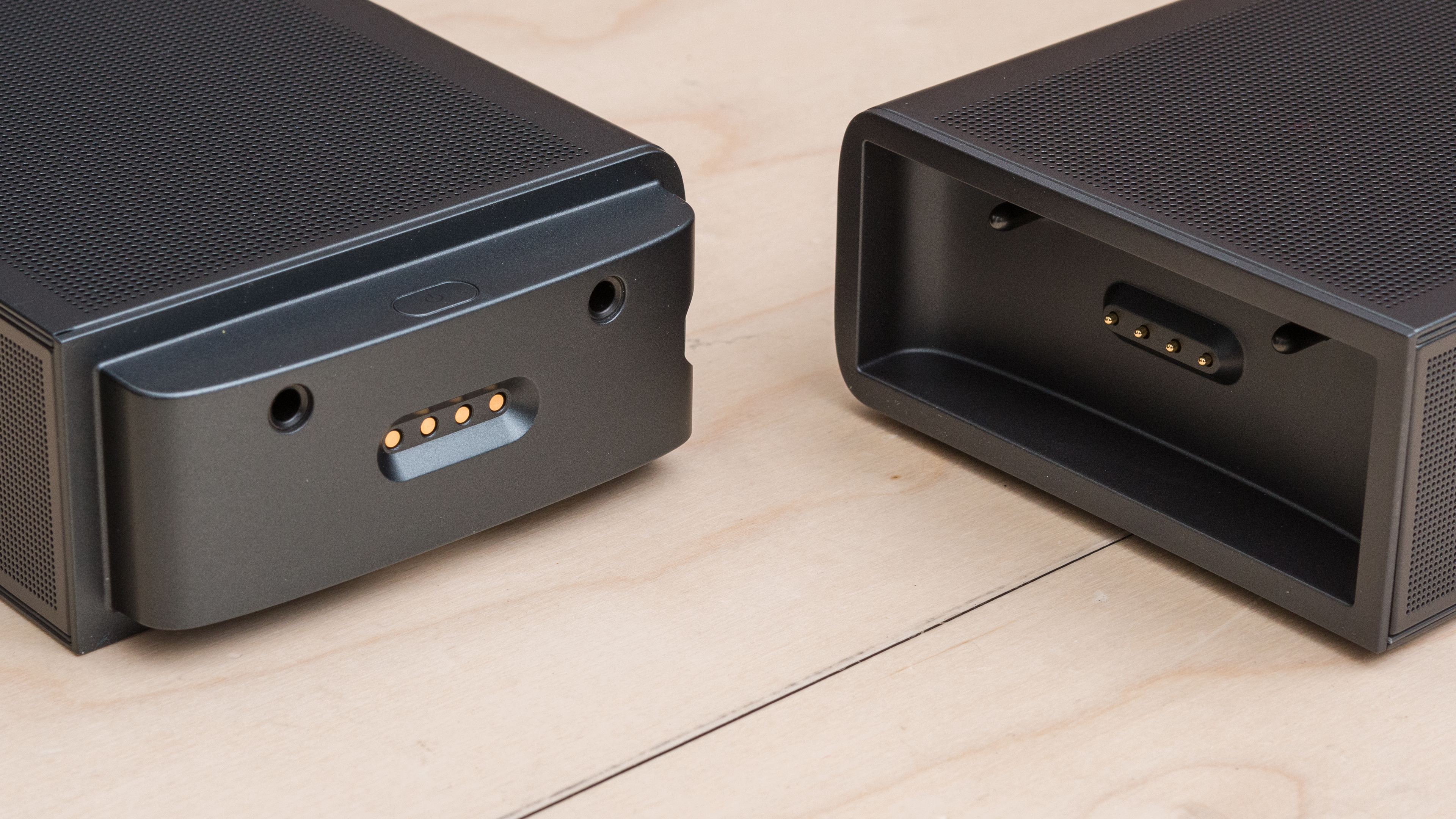 The satellites are made of the same material as the bar. Similarly, they have a metal grille to protect the drivers inside. Their four-pin connectors allow you to attach them to the bar for recharging, but you can also charge them using the included USB-C ports. When disconnected, you can use the included endcaps to protect the connectors. The manufacturer states that the satellites' batteries will last up to 10 hours (a specification shared by the JBL Bar 1000MK2), although this duration can vary depending on the type of content being played and the volume level. According to the manual, it will take approximately 3.5 hours for the empty battery to fully recharge.