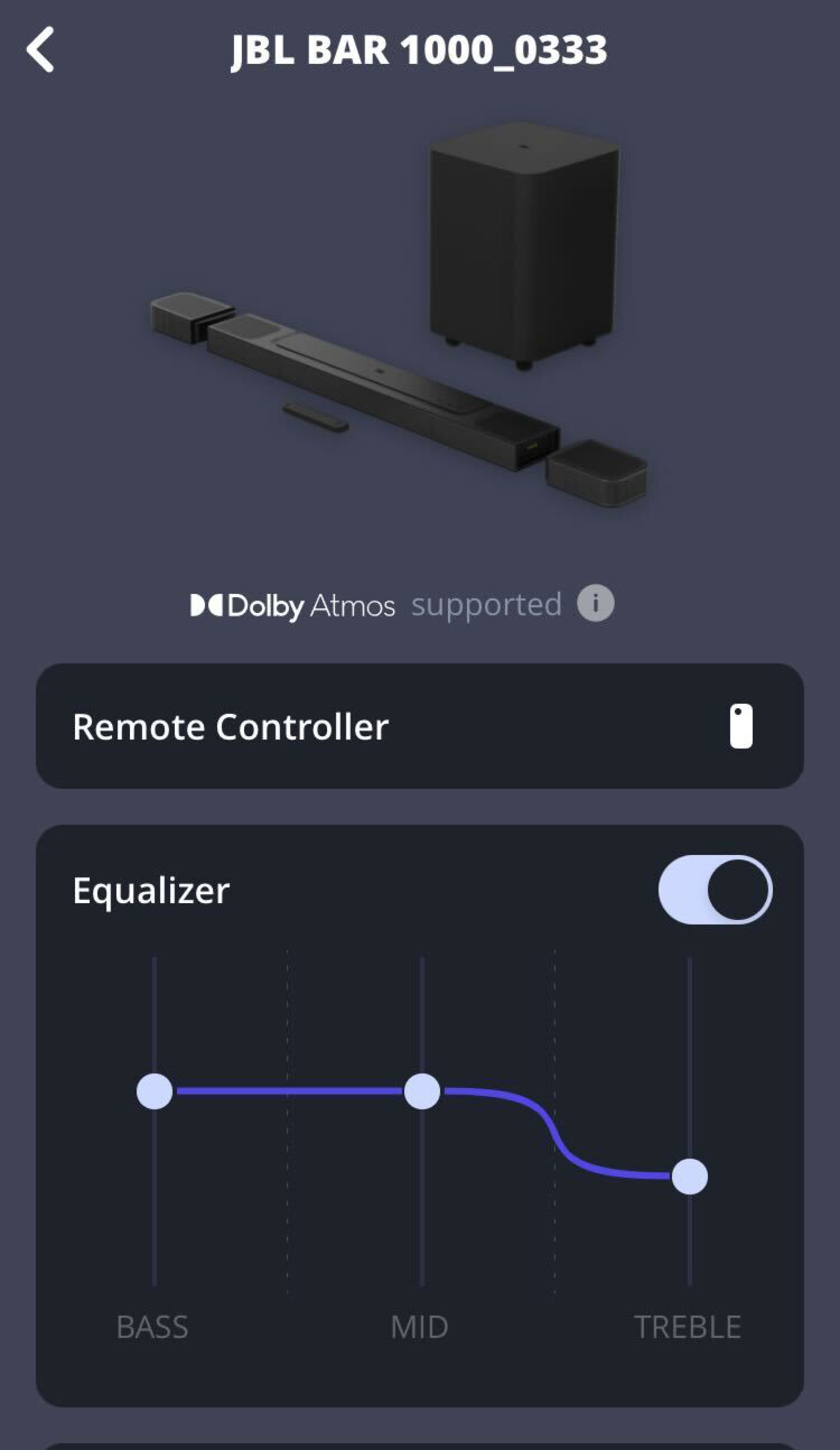 While the remote doesn't have a physical button for bass and treble adjustment, this bar is compatible with the JBL ONE app. In it, you'll find a 3-band graphic EQ to customize the bar's sound. Since the app acts as a remote, you can access many of the same customization features found on the remote there, too.