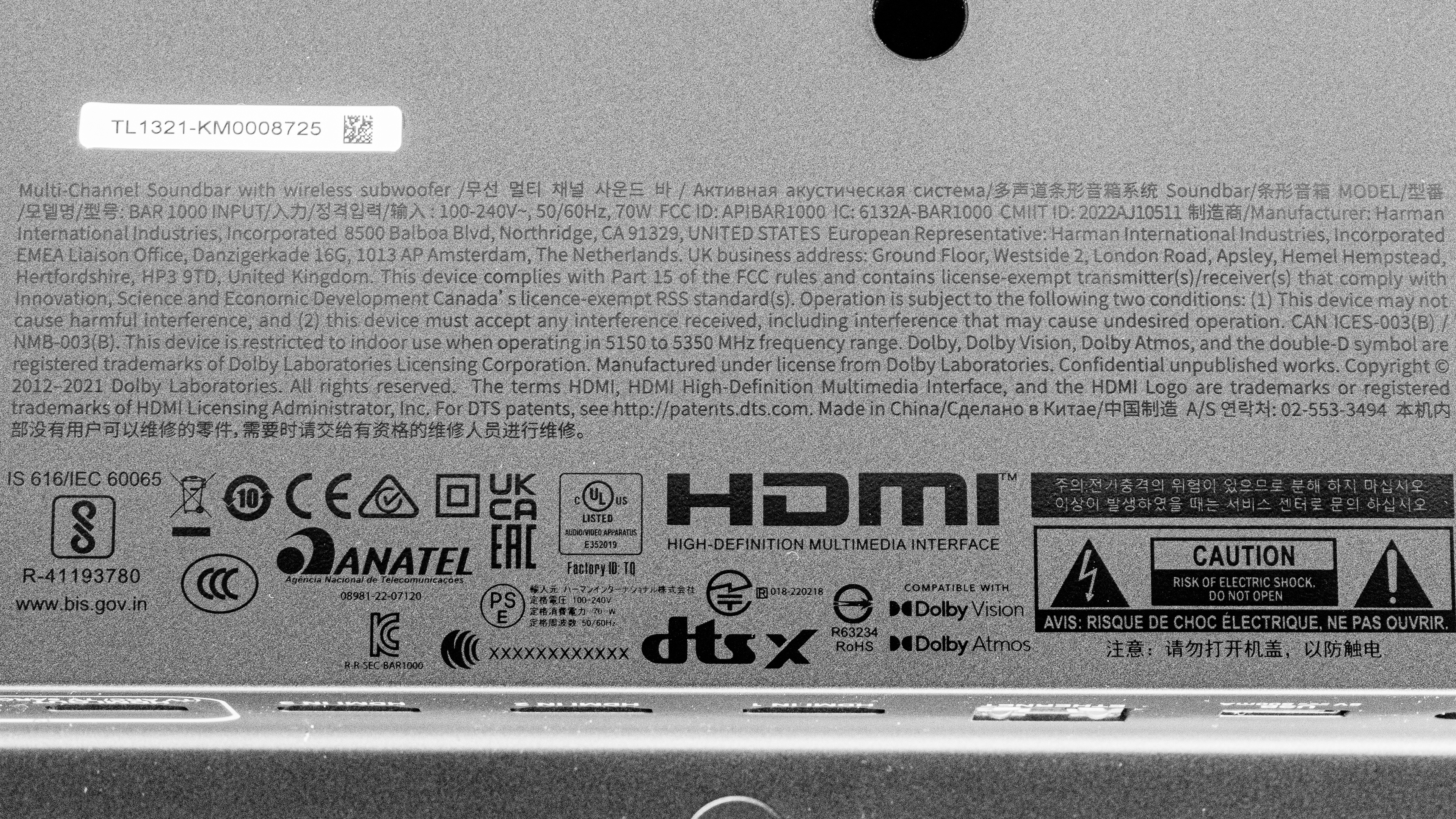 The JBL Bar 1000 is available in Black, and you can see the label for the model we tested here.