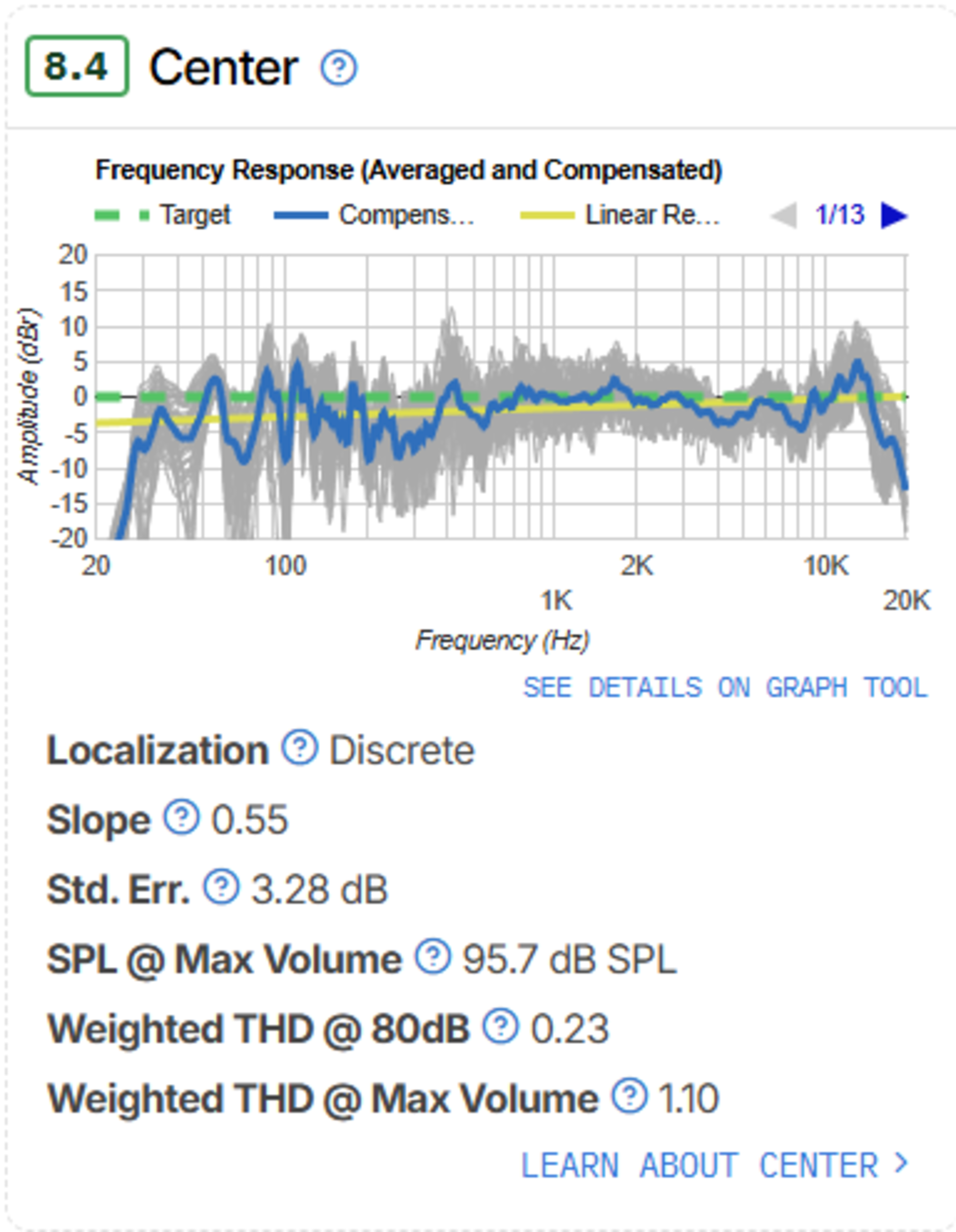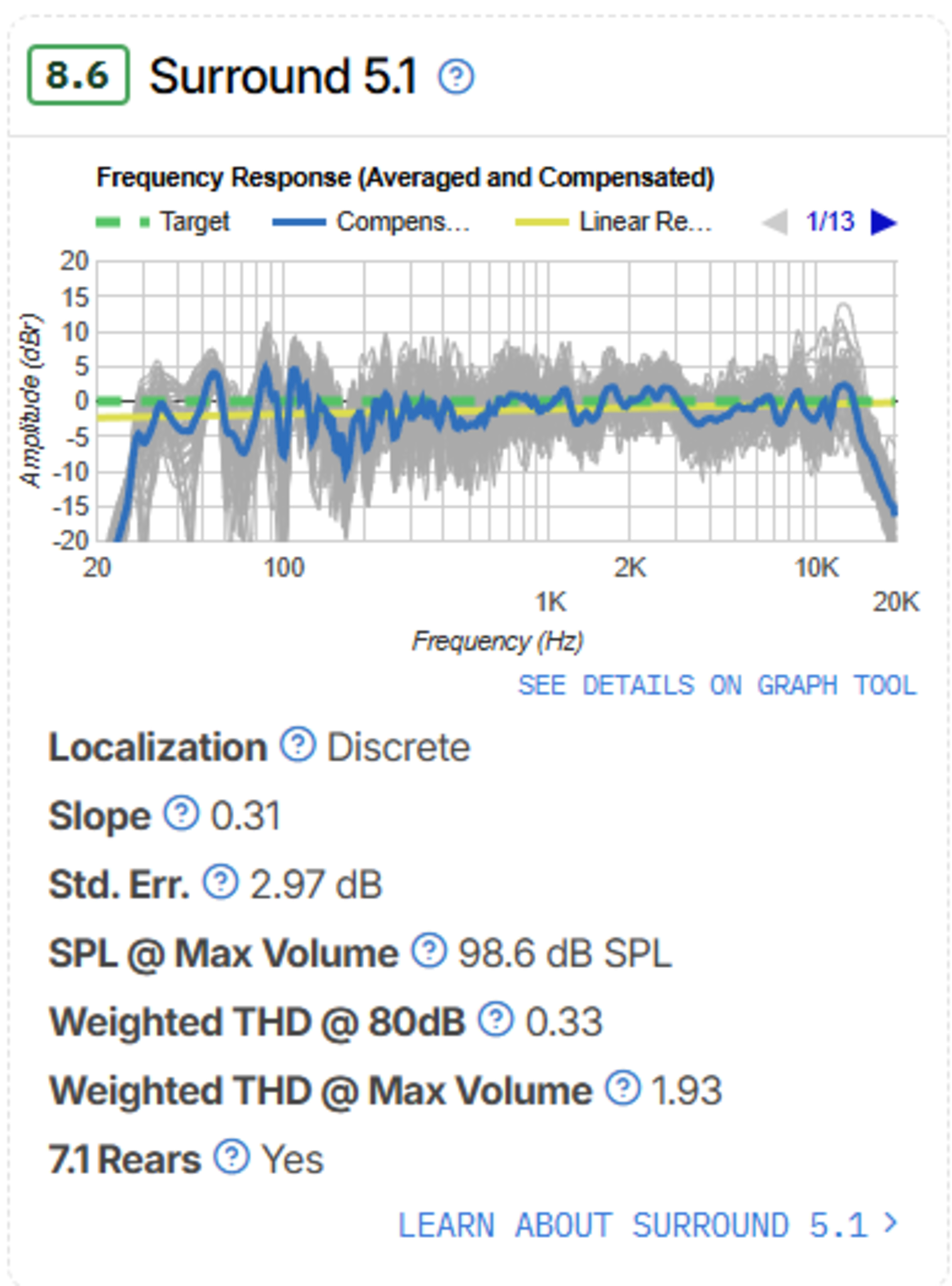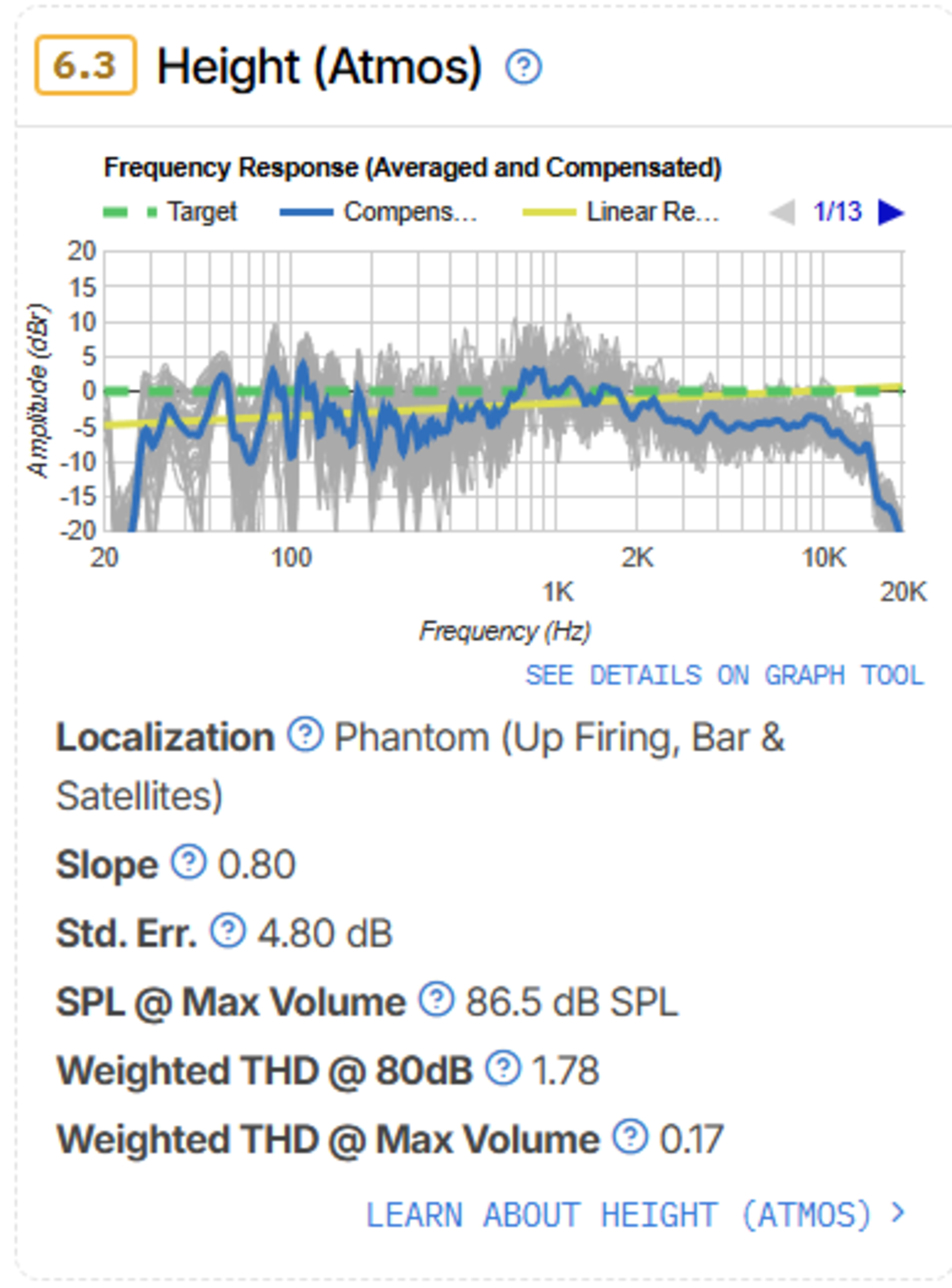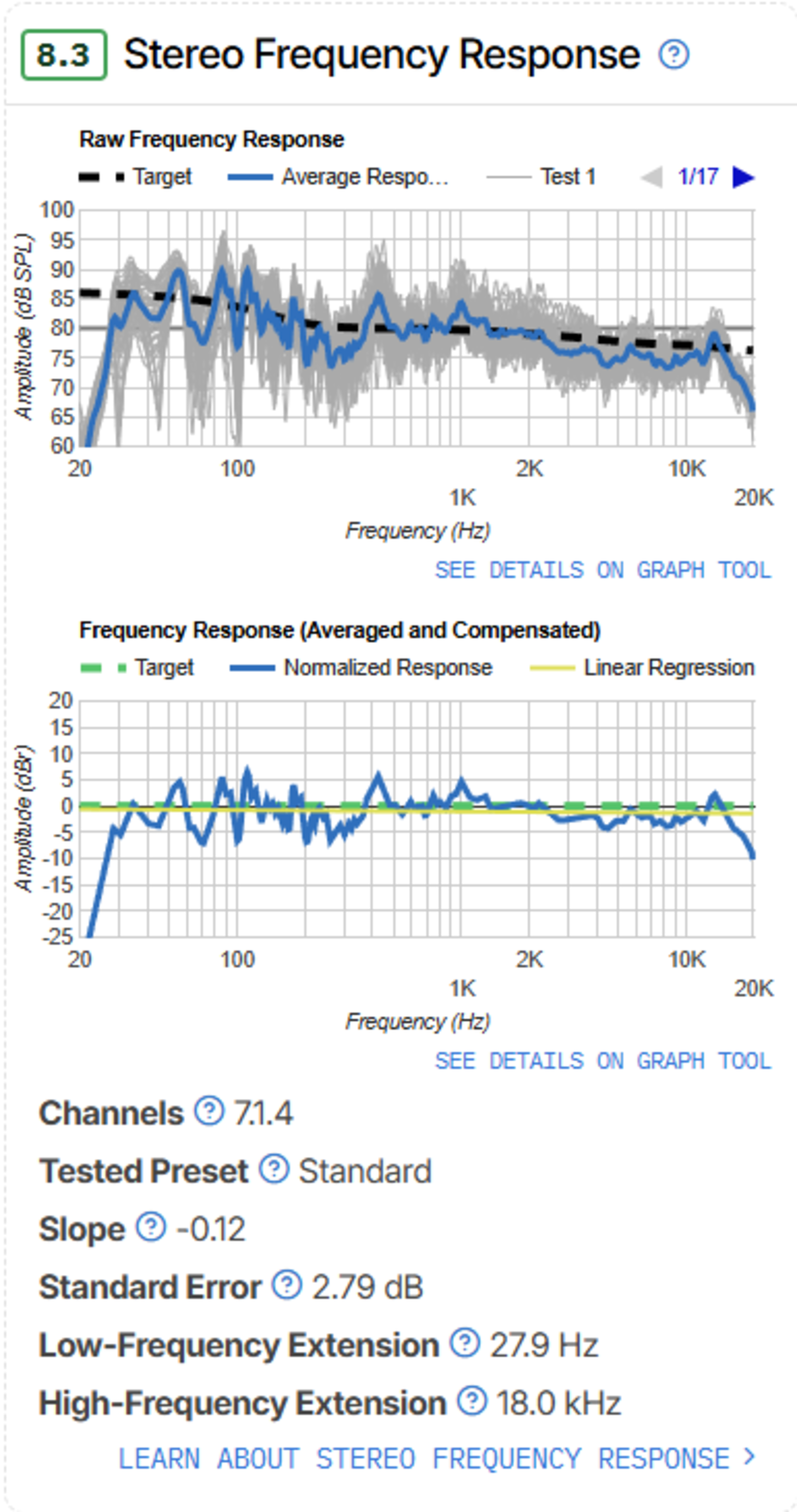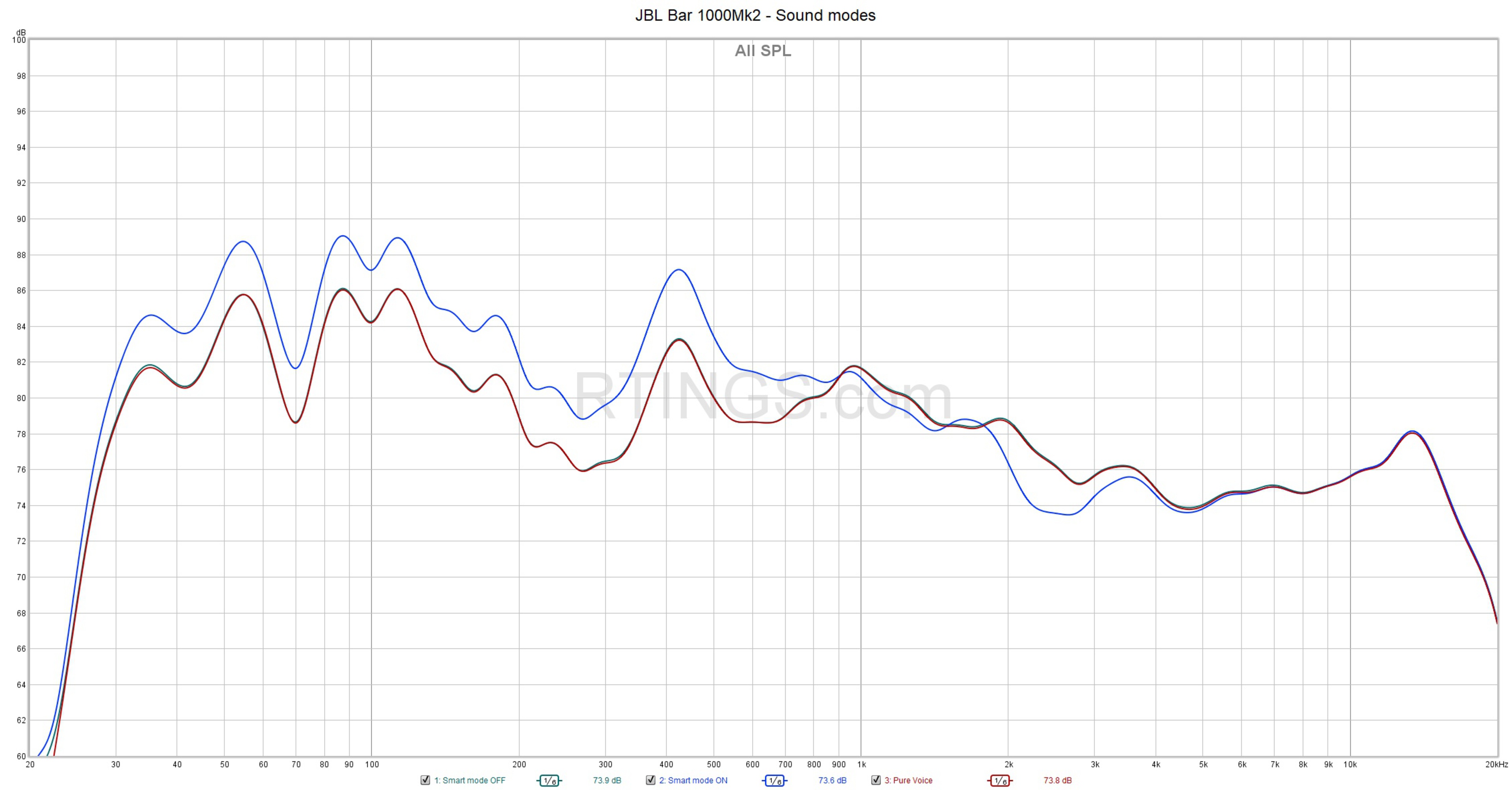 The JBL Bar 1000MK2 has a very good stereo frequency response. We tested it in 'Smart Mode,' with 'Pure Voice' disabled, and Atmos/Surround set to the default 'Mid' setting. We also used the room correction tool.