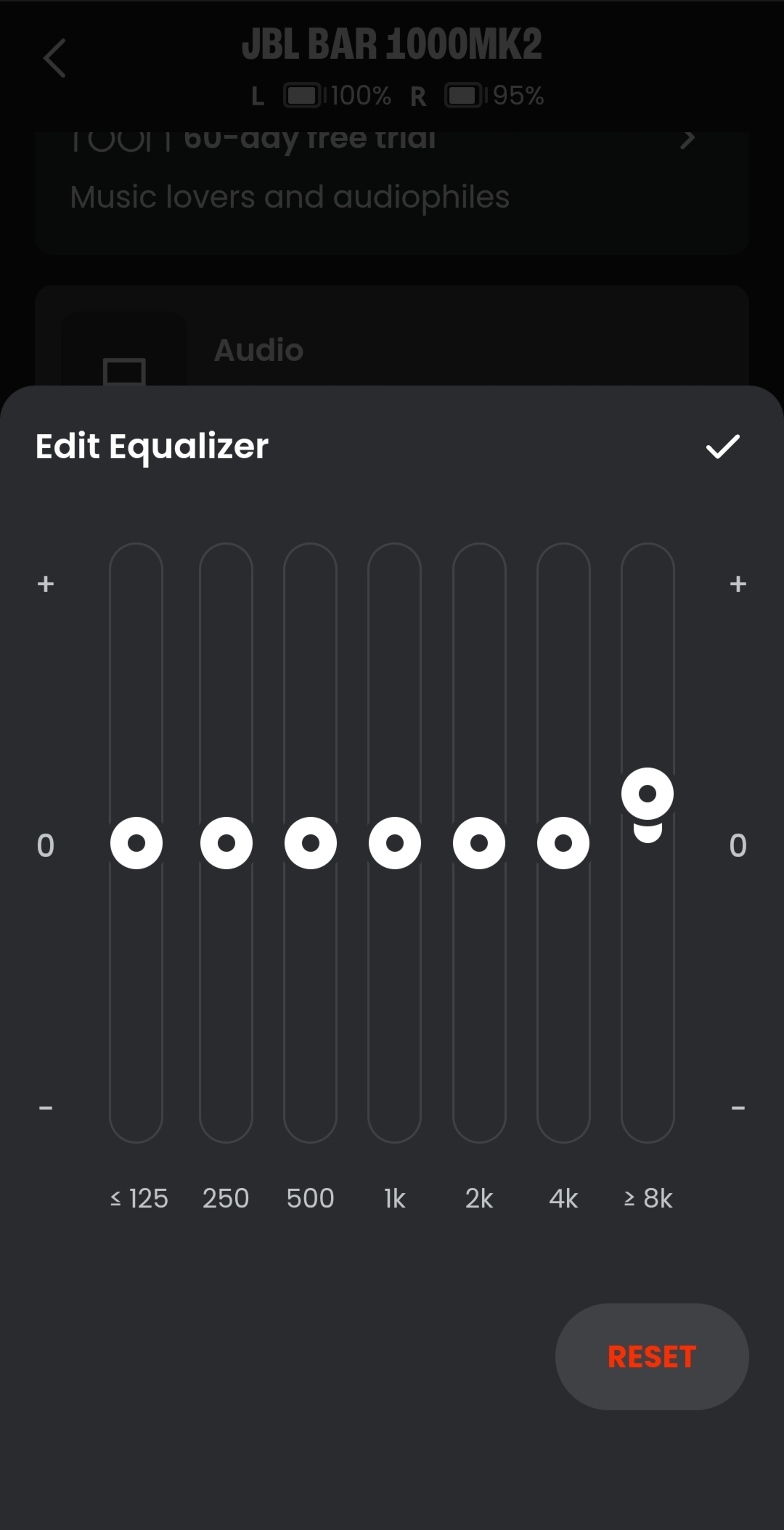 Basic adjustments are pretty limited: you get a bass slider ('3' is default). However, more nuanced equalization can occur within the app's seven-band EQ, but this moves beyond the scope of a basic preliminary calibration. That said, if you adjust the 8kHz slider to '+4' in the app, it brightens the somewhat dull treble response and brings it a little closer to our target by reintroducing some sparkle.
