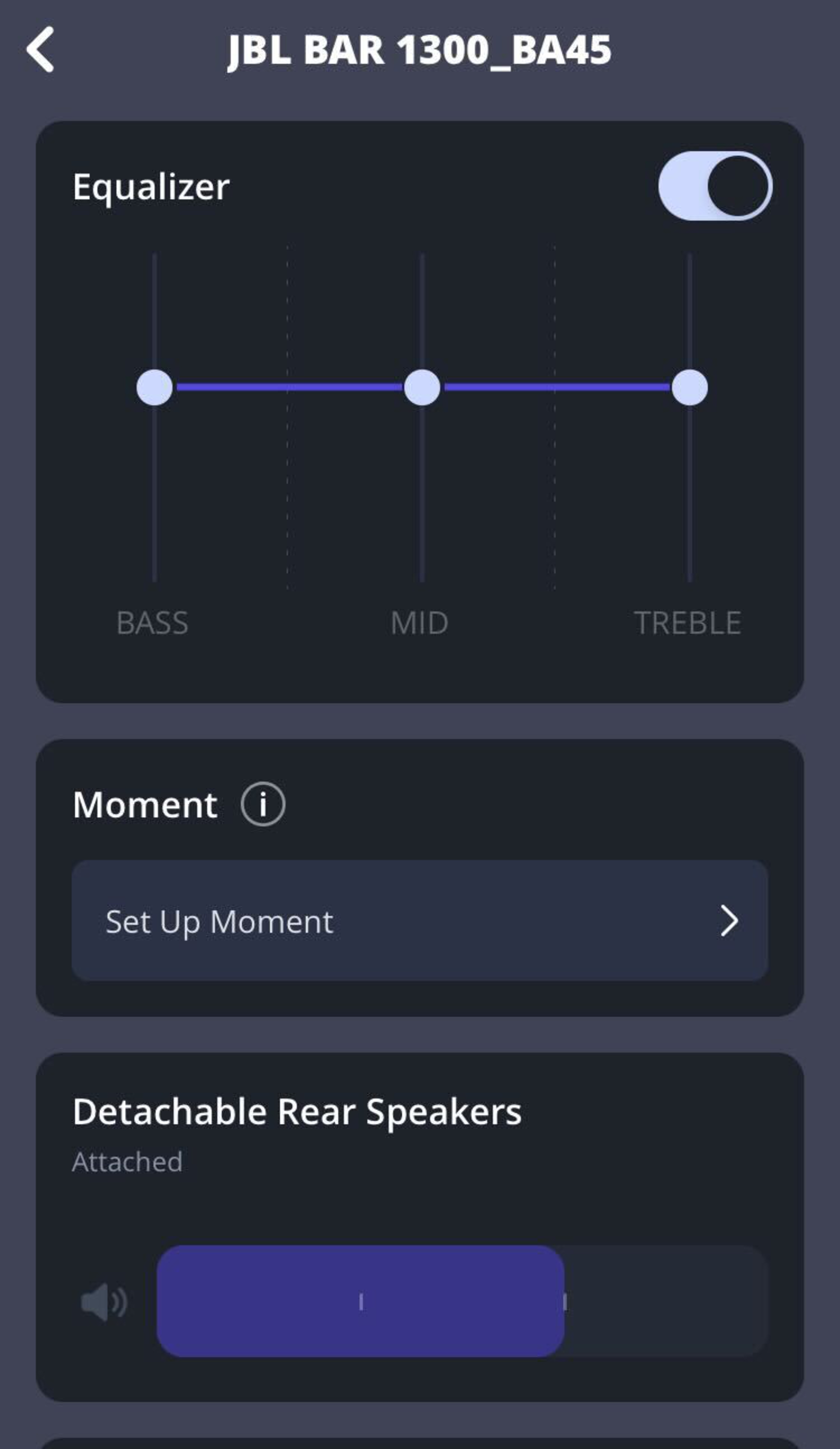 When compared, the JBL Bar 1000MK2 and the JBL Bar 1300X have different strengths, but mostly they share similarities. The Bar 1000 MK2 is newer with a more balanced surround tuning and much better dynamics performance with a higher top output volume. The Atmos effect is more present in the mix. However, it's somewhat hindered by a bit of a lag in the Atmos-equipped satellites, which impacts the definition of 3D objects. The Bar 1300X doesn't have this same latency when handling Atmos, but it's much more subtle in the mix overall by default. Otherwise, it has two extra channels and a very similar tuning. Even so, its compression flattens out the liveliness of trebly sounds, and it doesn't get as loud at max volume. Still, both soundbars use the same app with features like room correction, EQ, voice enhancement, night mode, and channel level adjustments.
