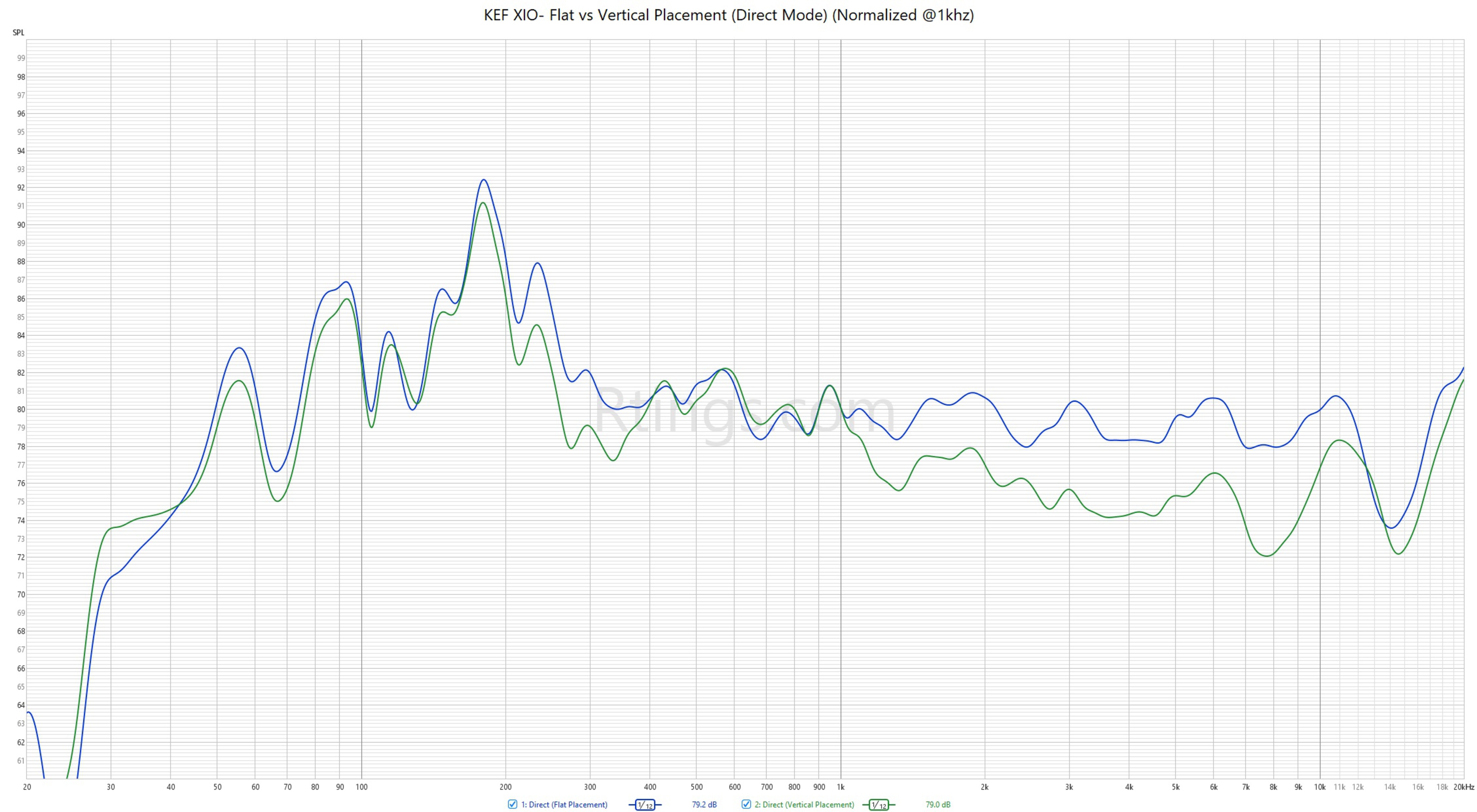 The KEF XIO soundbar has a decent stereo frequency response. In its Direct mode, the mid-range and treble are both virtually flat, ensuring voices and instruments alike sound clear and detailed. That said, a big boost in the high bass can make mixes sound muddy and voices boomy. Since the bar lacks a dedicated sub, it struggles to produce low-bass thump, but there's enough mid-bass punch to keep kick drums feeling exciting. In the vertical orientation, the treble is reduced, as this graph shows.