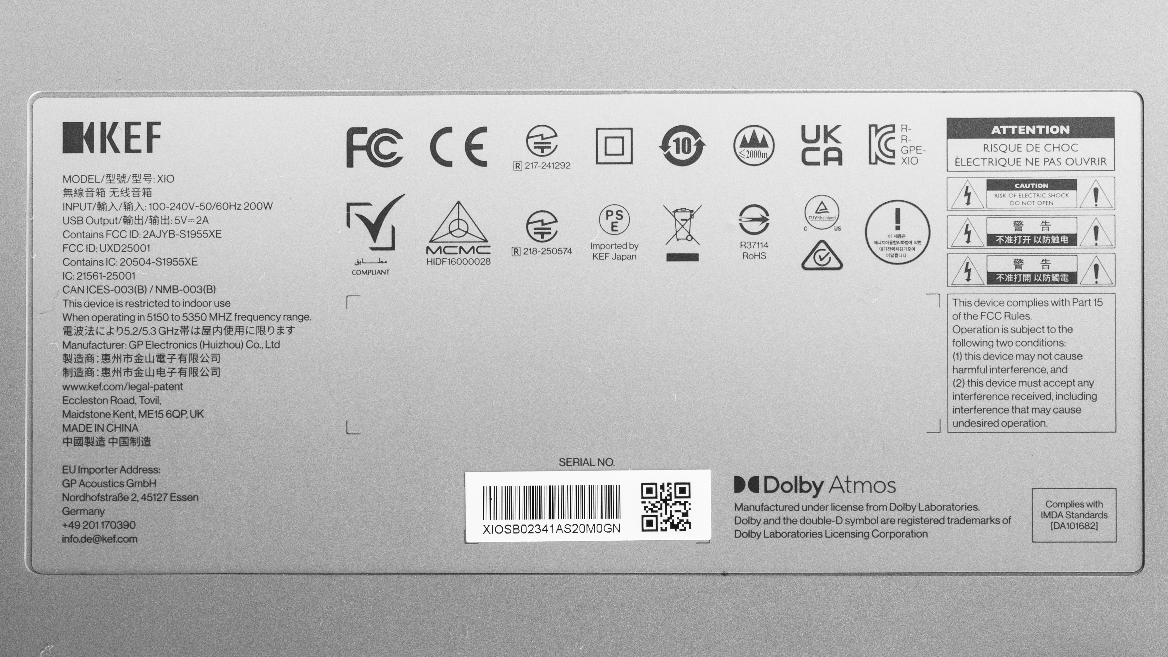 The KEF XIO comes in two color variants: 'Silver Grey' and 'Slate Black.' We tested the 'Silver Grey' variant, and this is its label.