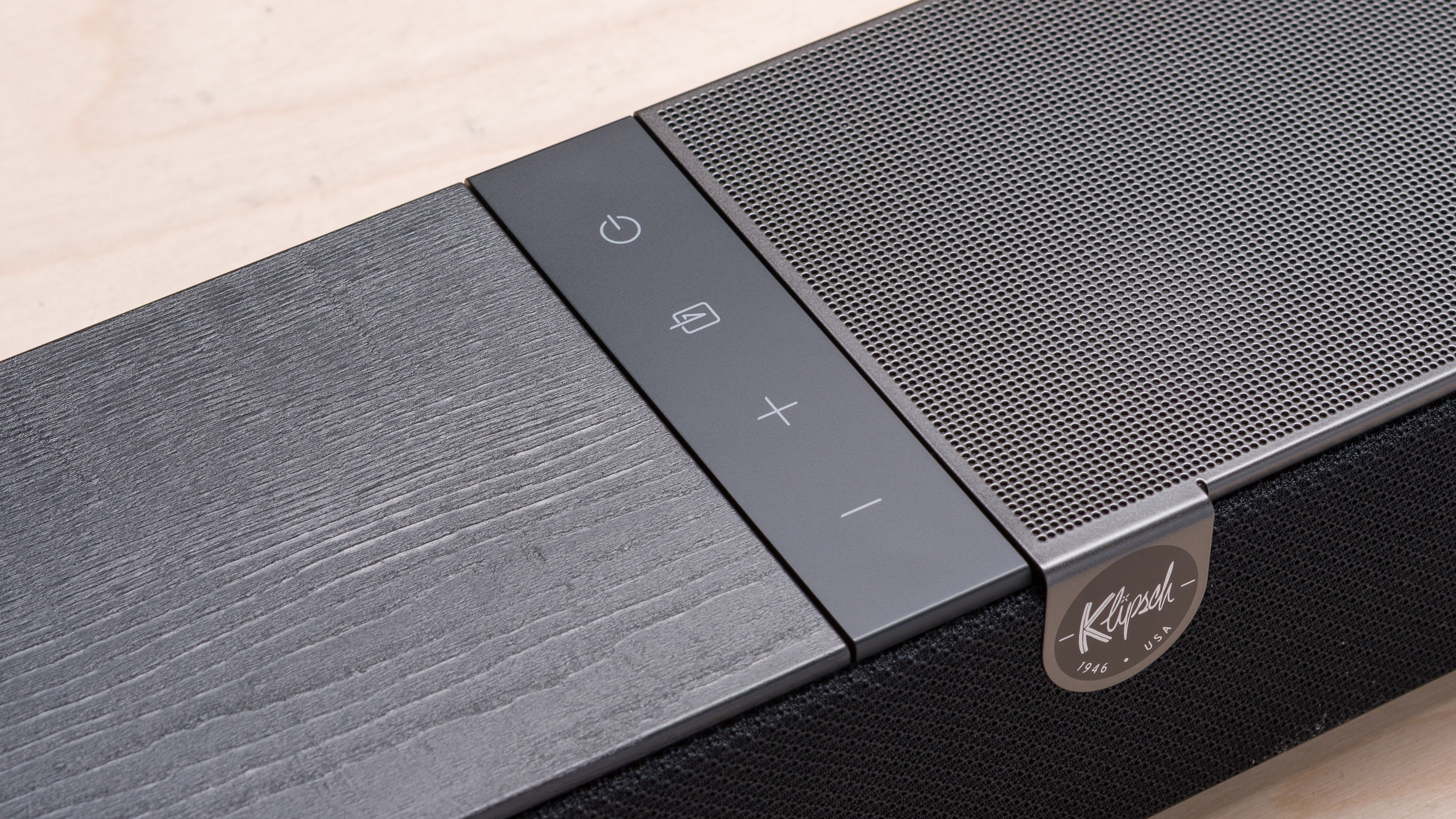 The Klipsch Core 300 is an all-in-one design soundbar that comes in black with the retro Klipsch badge offset to the right of the front of the bar. It's made of a mix of hefty plastic, a black wood-grain top, and perforated metal grilles, and is wrapped along the sides in fabric covering the drivers. An LED display and touch controls are also placed on the right side. It's understated looking with a subtly premium look.