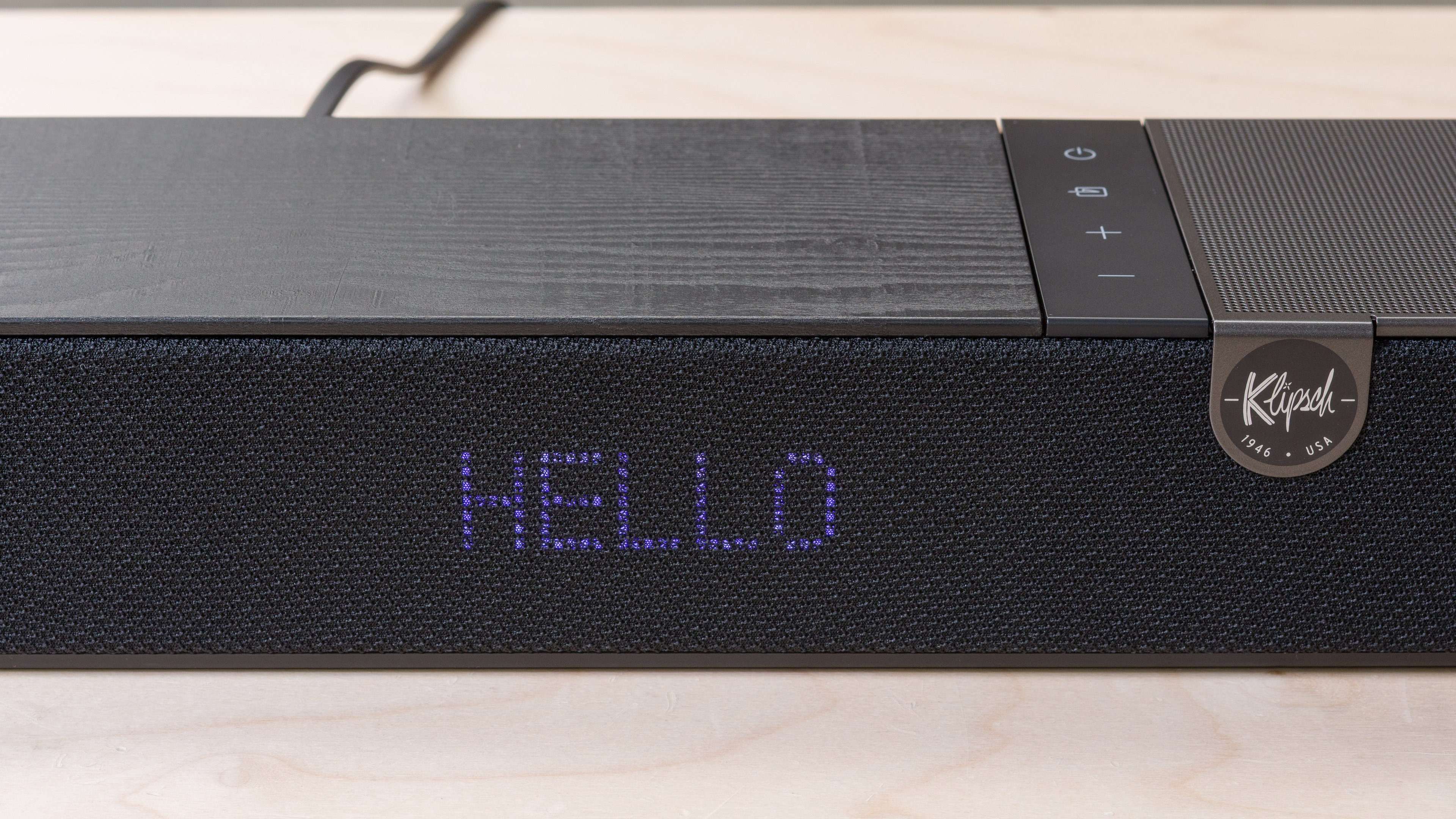The Klipsch Flexus Core 300's display is set slightly off-center towards the right side of the bar. This LED display shows volume, effects settings (like modes), and input source. It responds quickly without lag when using the remote and companion app. You can also adjust the brightness of the display (high or low settings), which is a nice detail.