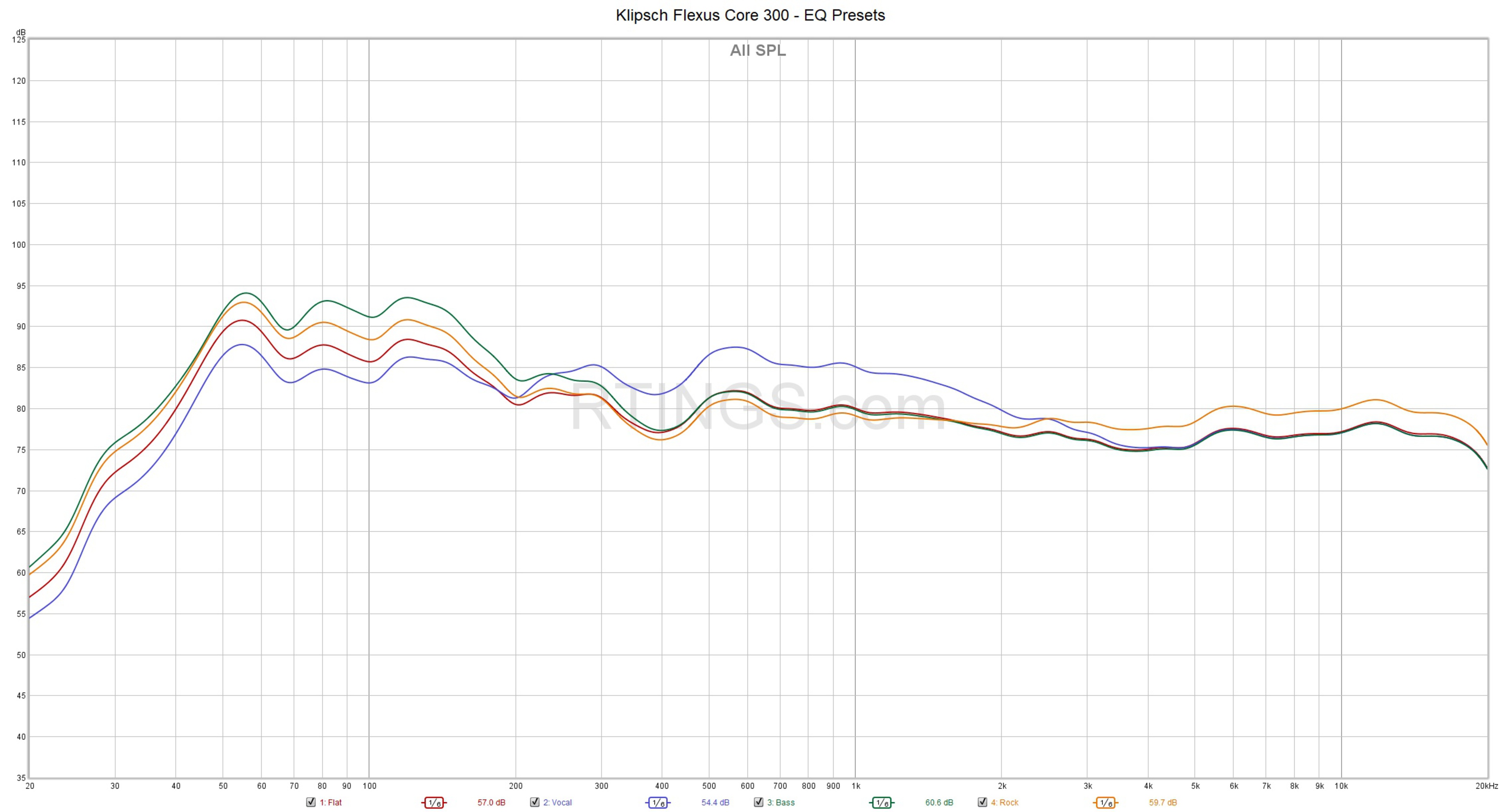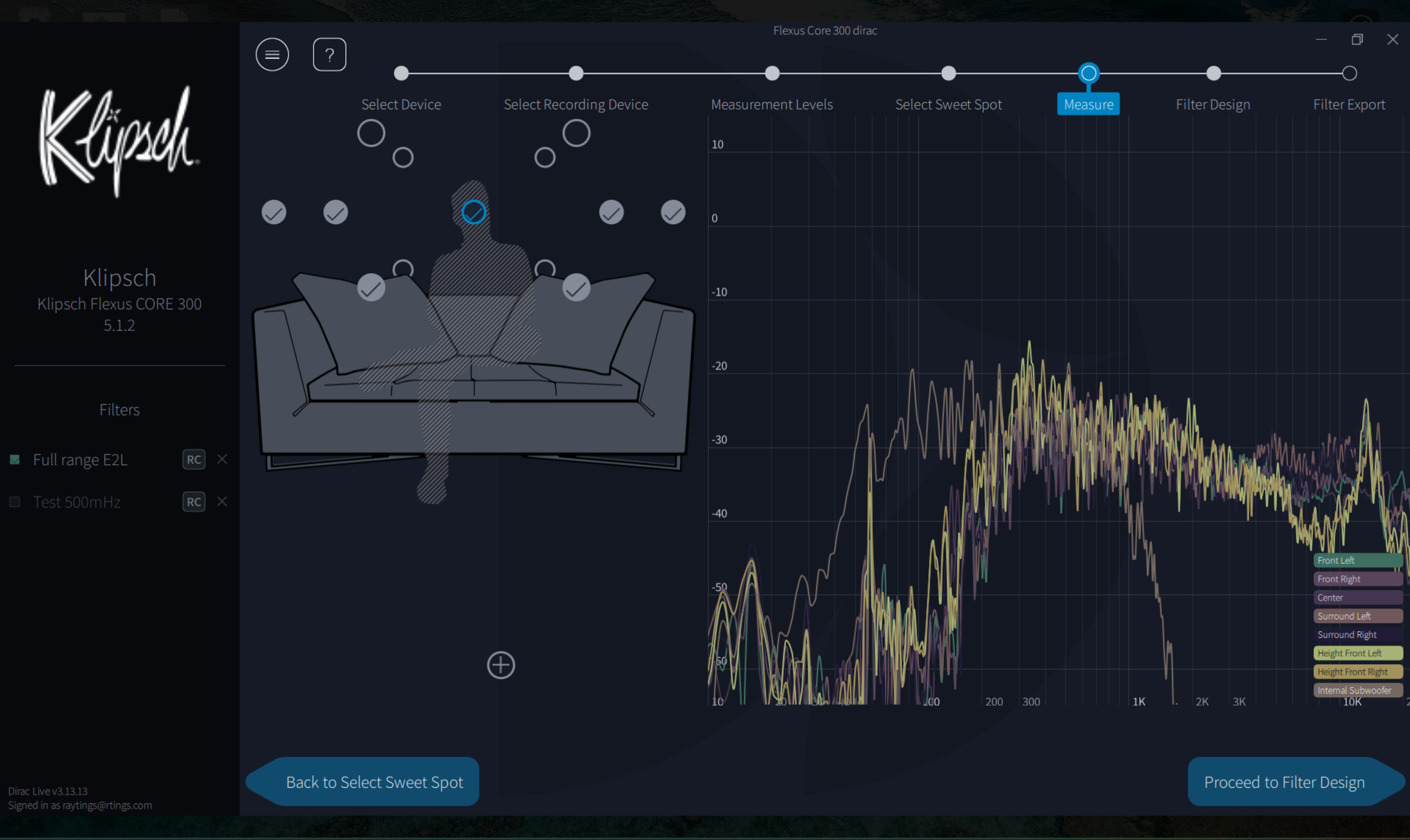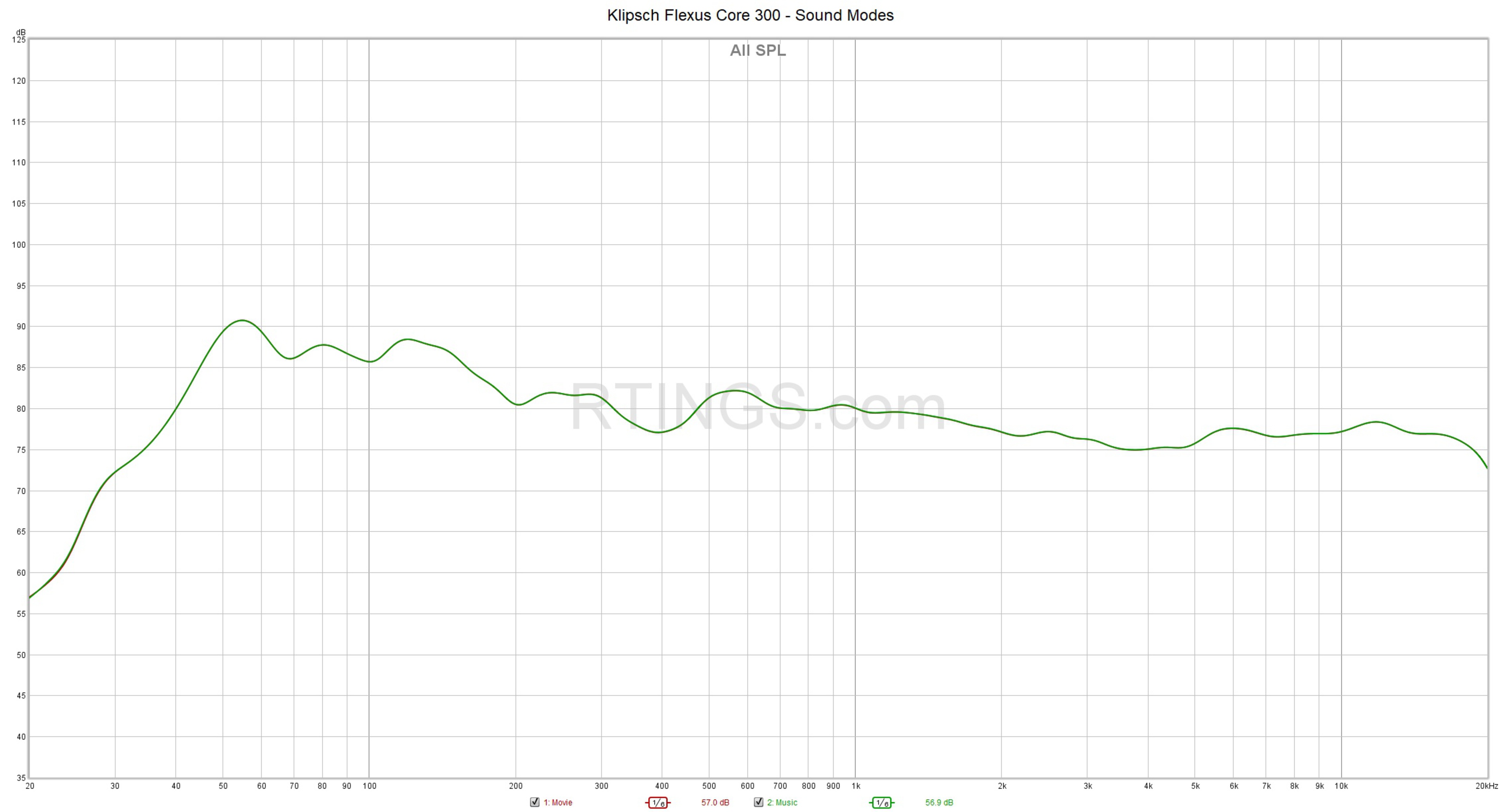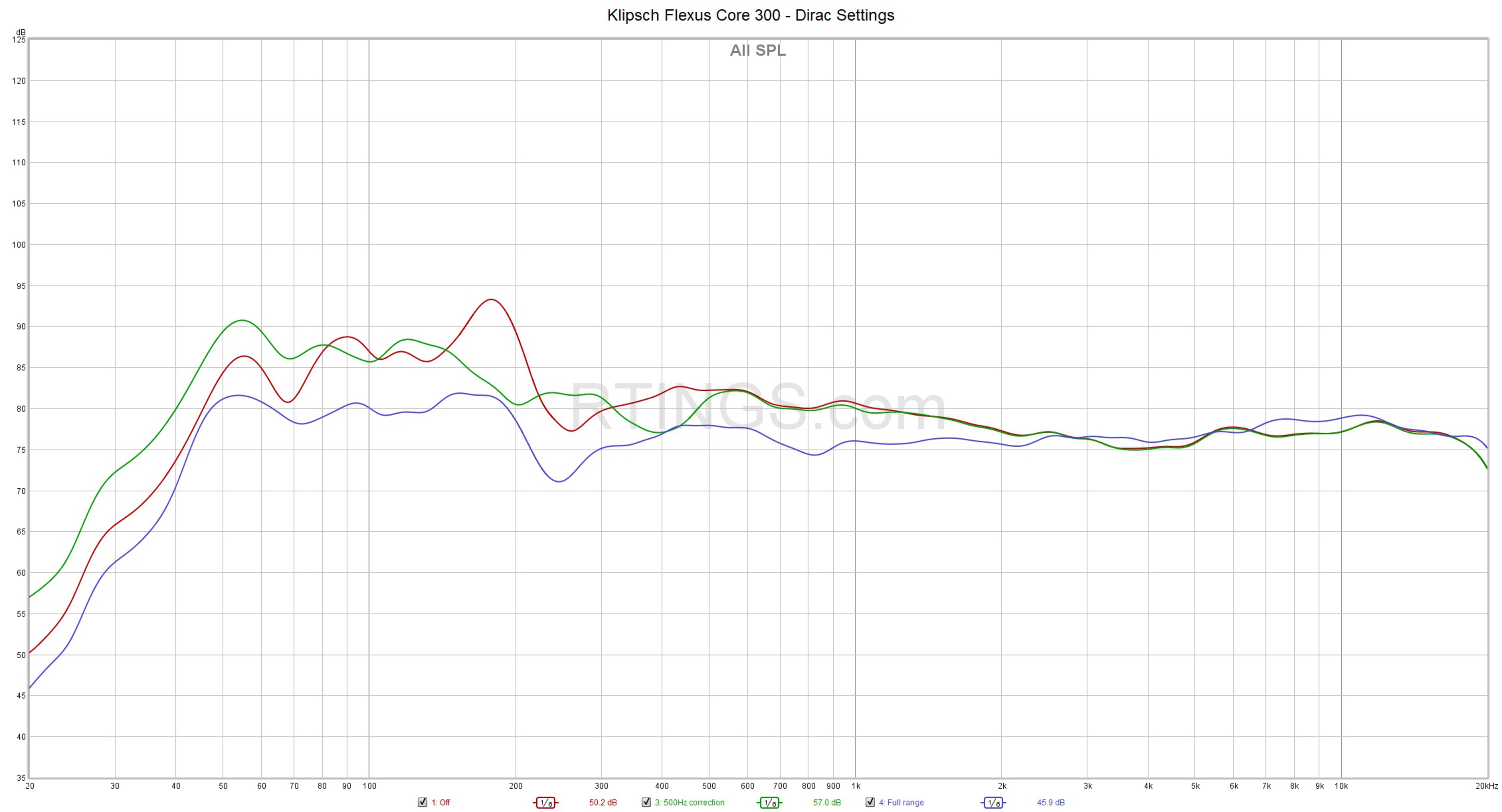 The Klipsch Flexus Core 300 has a very good stereo frequency response. Our test settings included: EQ set to 'Flat,' 'Movie' mode, and Dirac Live 500Hz room correction.