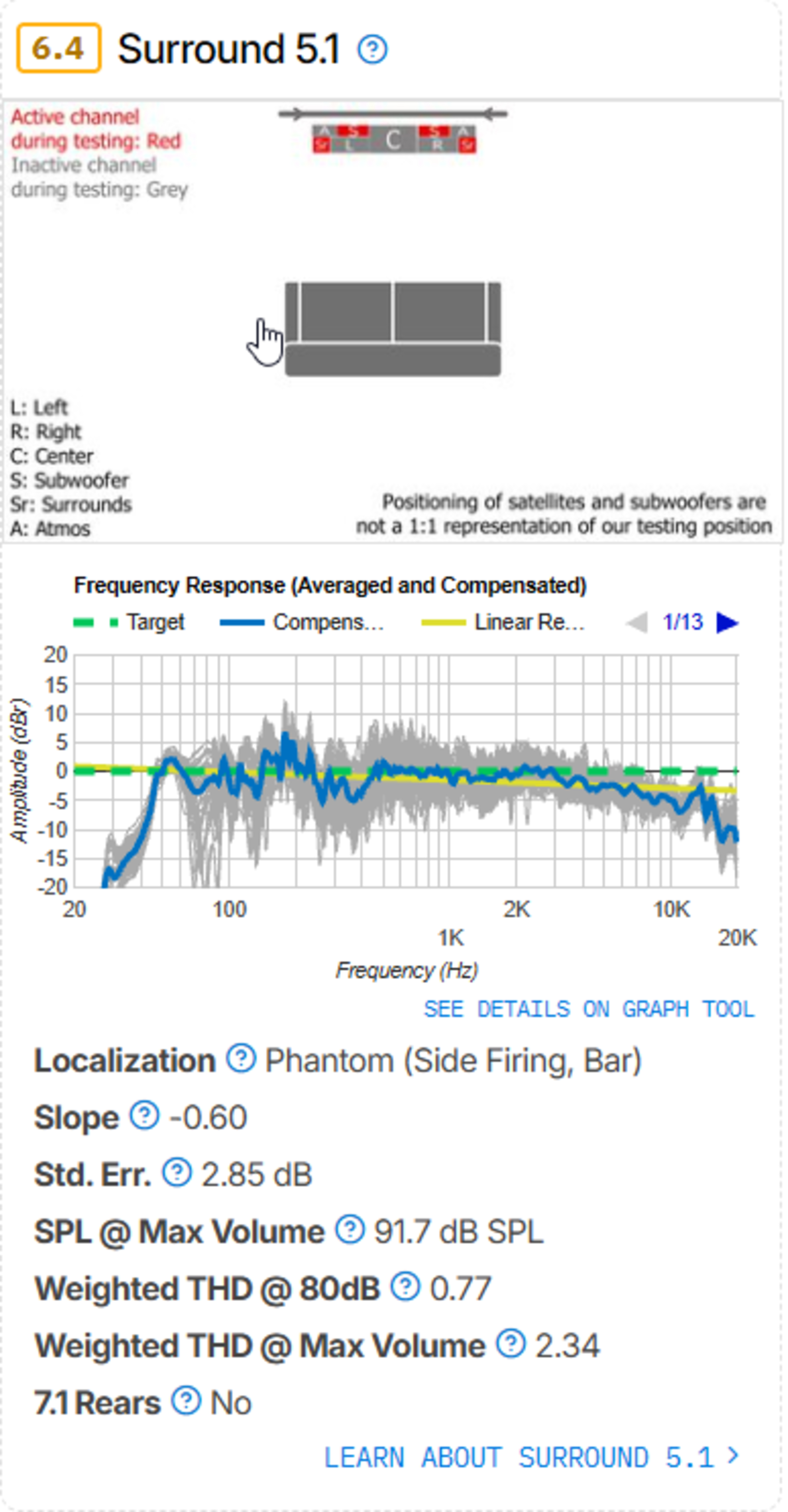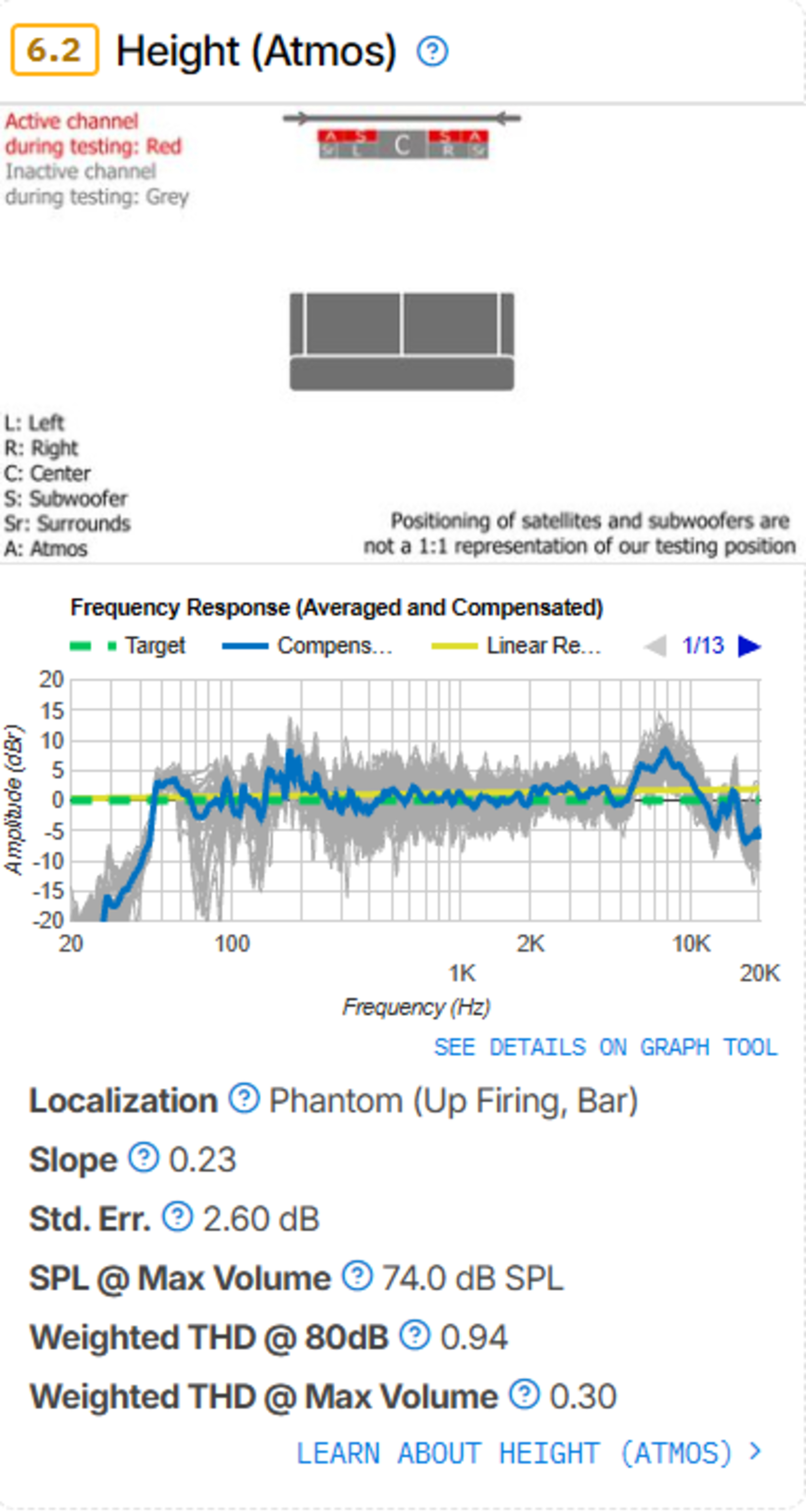 Overall, the Atmos tuning is somewhat mid-range focused. There's a little boom in the high-bass, but the lack of deeper lows means rumbling sounds seem a bit weak or compressed. Bright effects and voices sound relatively veiled due to the de-emphasis in the treble response.