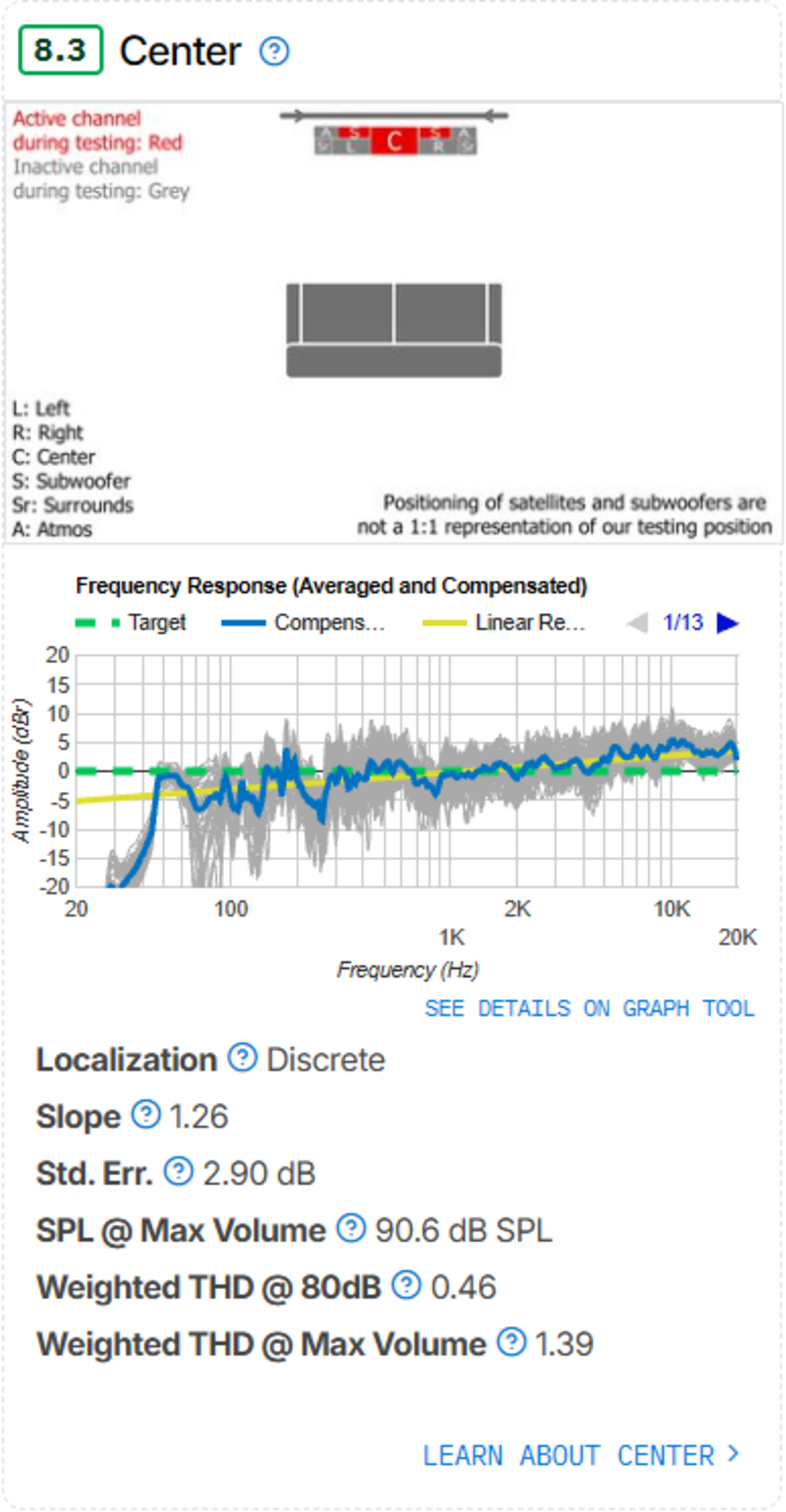The center channel is excellent. The Klipsch Flexus Core 300 uses a discrete center channel and subs tuned to sound relatively flat for clear dialogue that cuts through the mix. However, there are a couple of peaks and dips in the low-mids and low-treble, which can slightly affect the tonality of voices. With the full Dirac license, the tuning is quieter and much brighter with fewer strong peaks and dips.