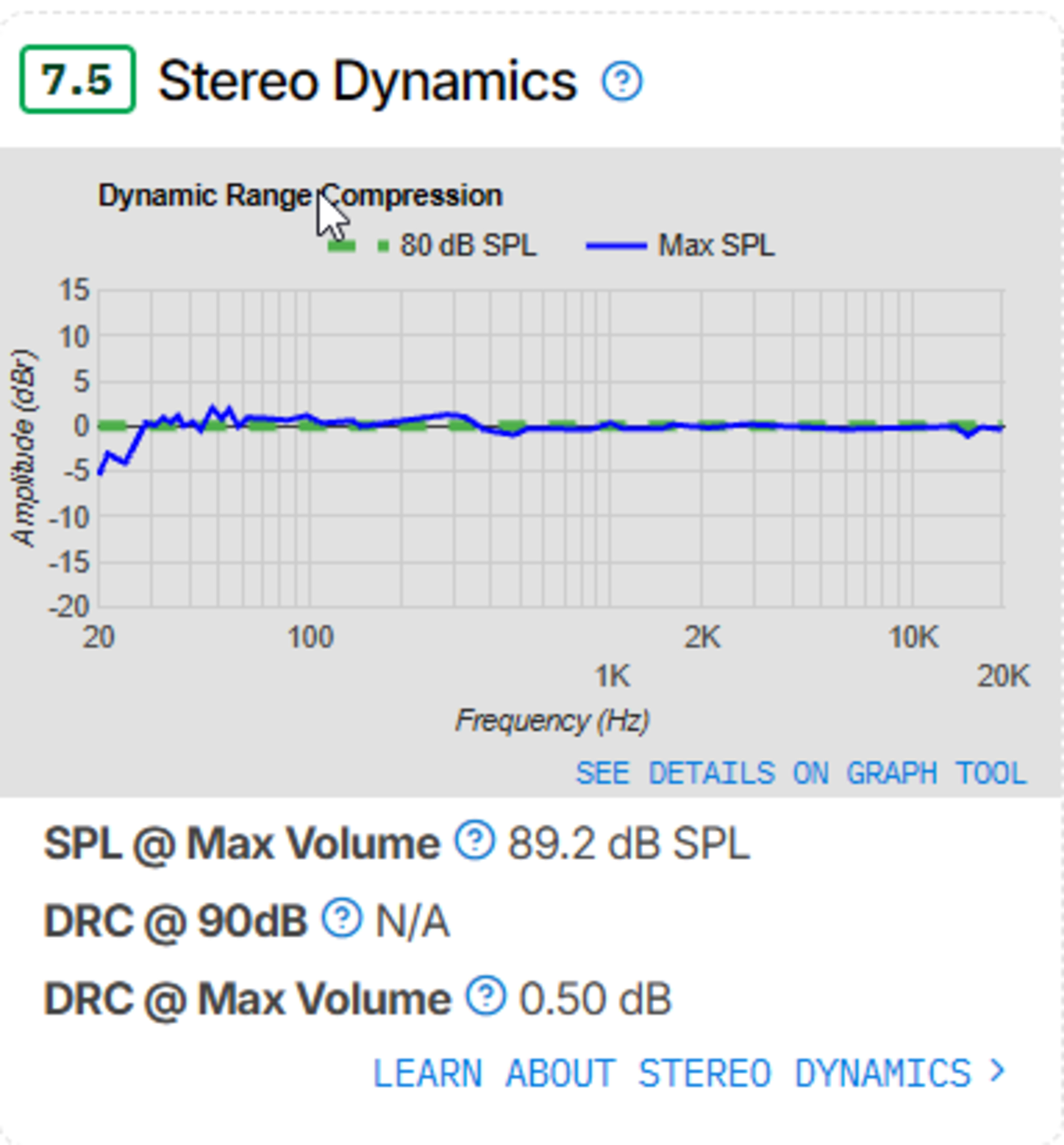 The Klipsch Flexus Core 300 has very good stereo dynamics. There's not much compression, and overall, the audio retains the quiet and loud parts of your audio signal. We also tested the dynamics performance with the full version of the Dirac license, and it introduced a little more compression.