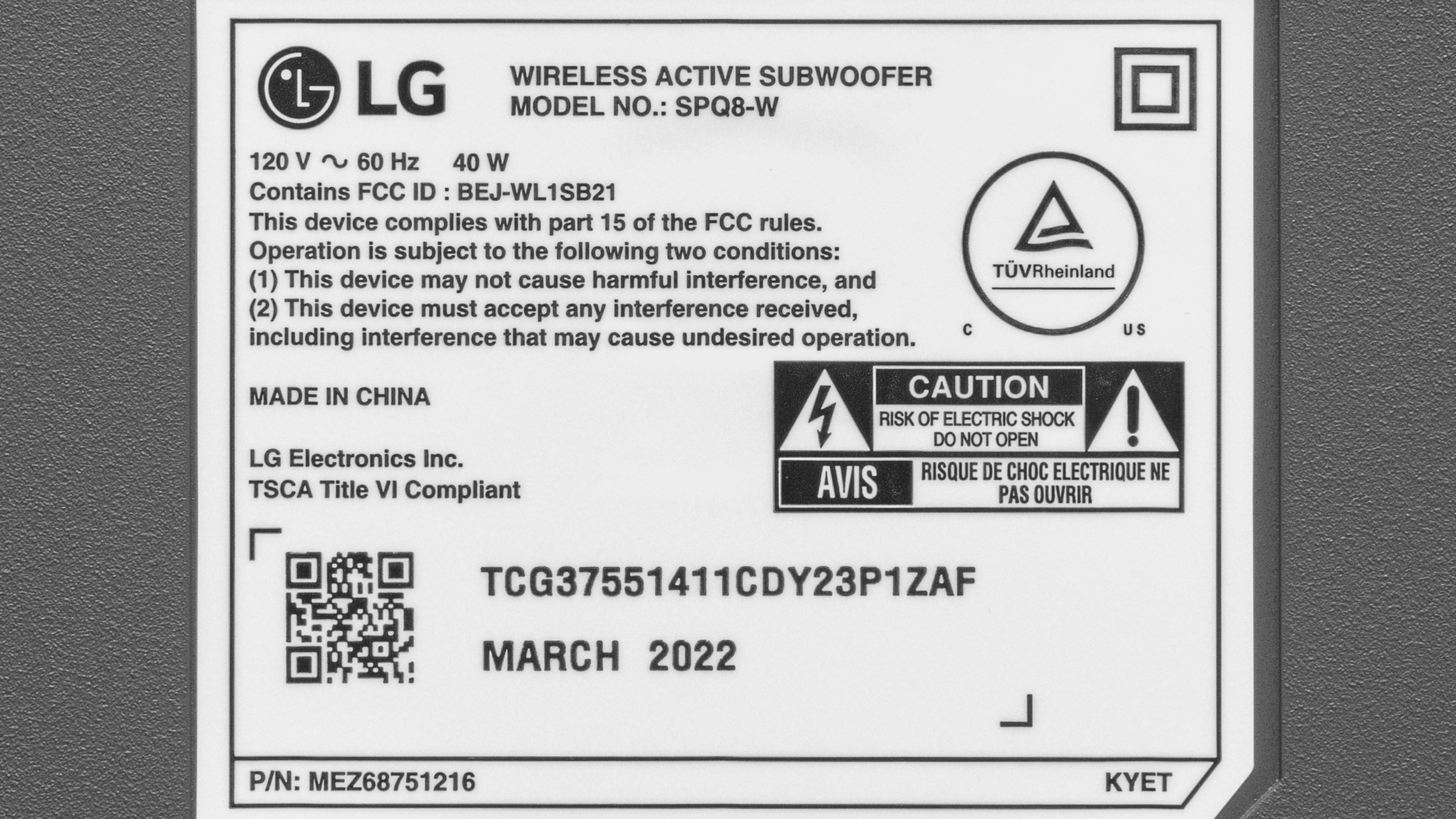 The LG S90QY is available in 'Black', and the label for our model is available here.