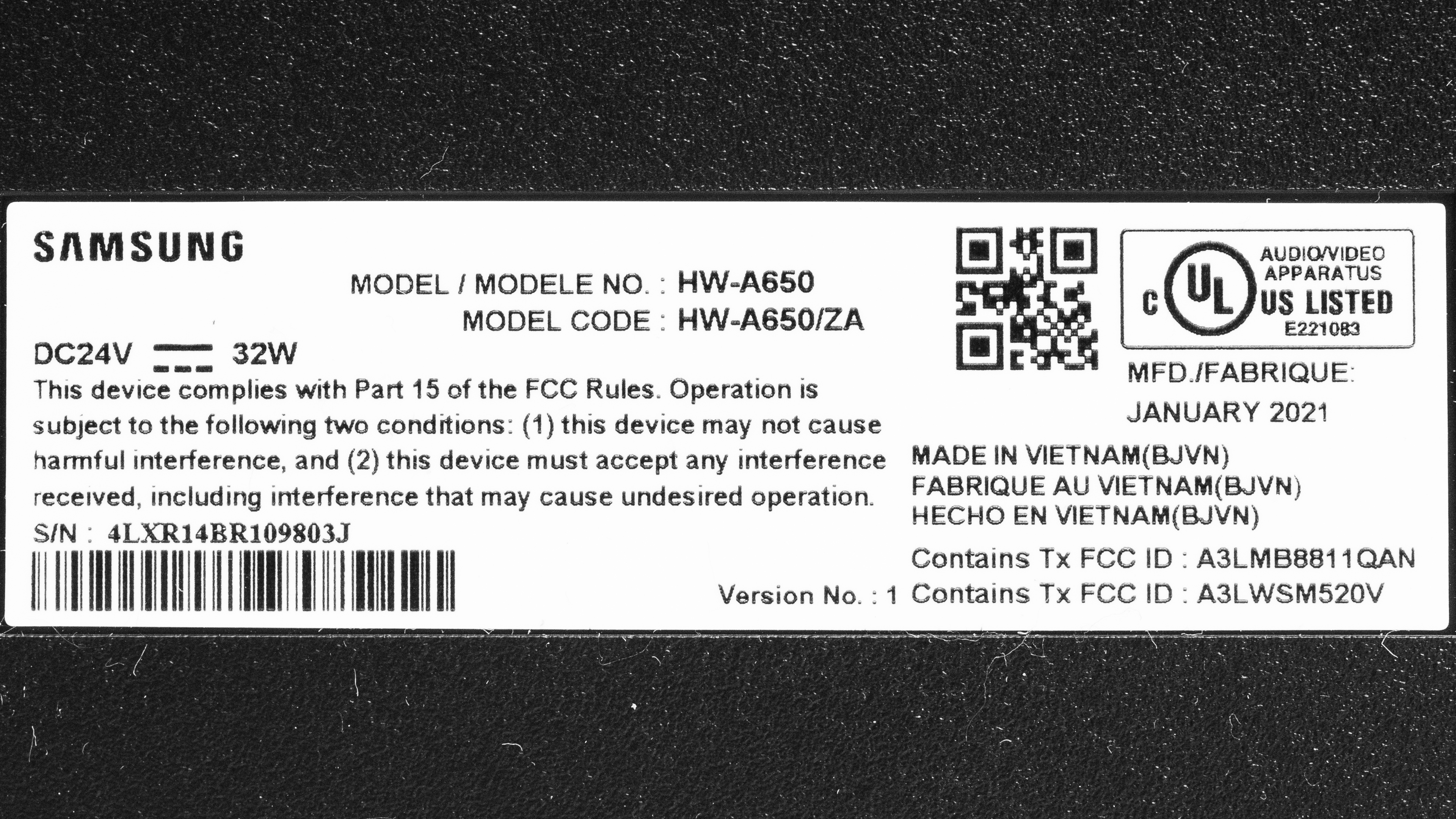 The Samsung HW-A650 is available in 'Black', and you can see the label for the model we tested here.