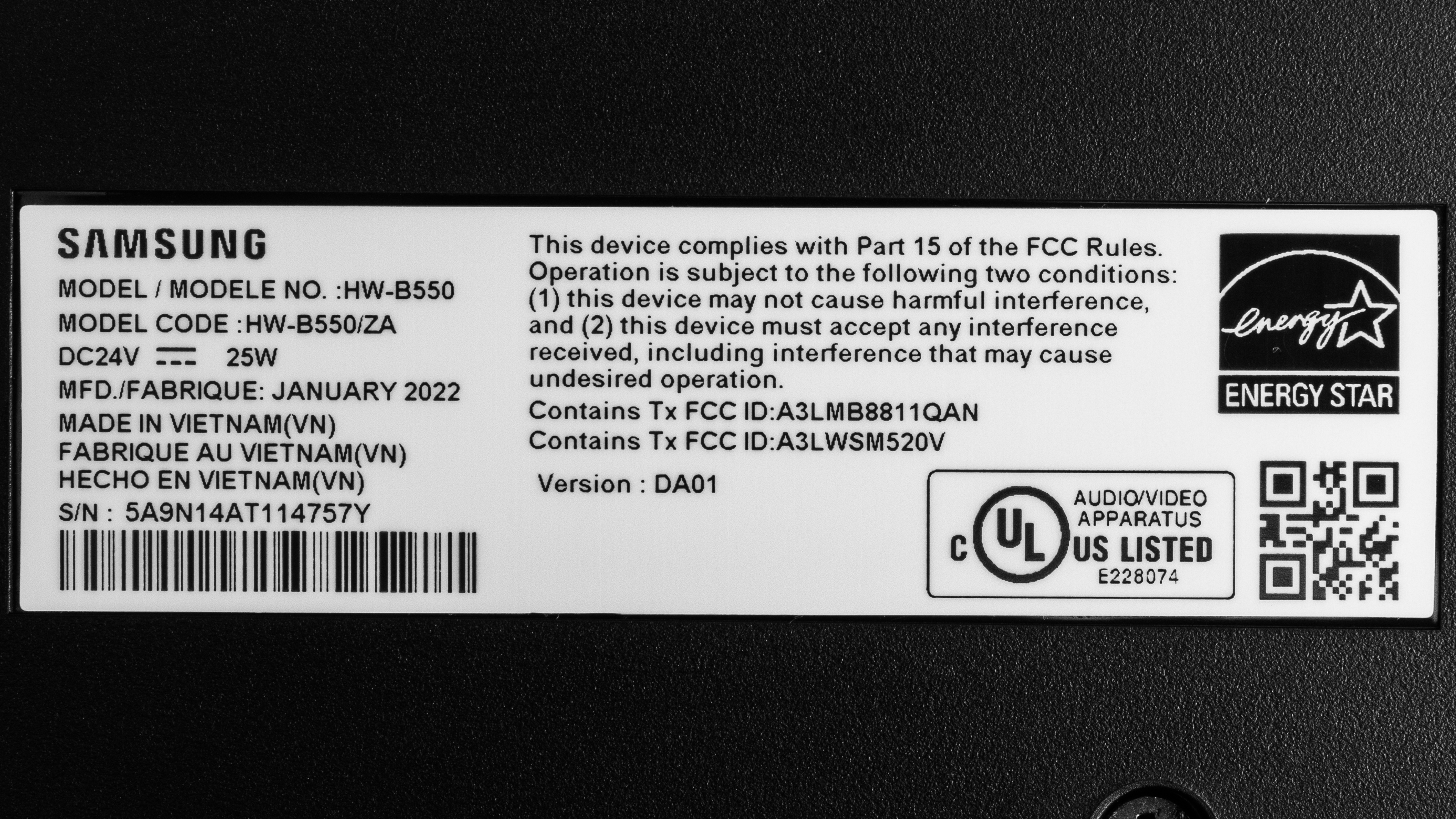 The Samsung HW-B550 is a 2.1 soundbar released in 2022. It's the next generation of the Samsung HW-A550 and performs quite similarly to its predecessor. It's a simple bar that's best for listening to stereo content, which includes most music and TV shows. If you want to improve its surrounds performance, you can add a Wireless Rear Speaker Kit, which is sold separately. However, there's no Dolby Atmos support to let you take advantage of more immersive formats on streaming platforms. You don't get access to Samsung's more premium features, like room correction, which optimizes audio to your room's unique acoustics, and Q-Symphony, which pairs the bar with compatible Samsung TVs for an enhanced sound.