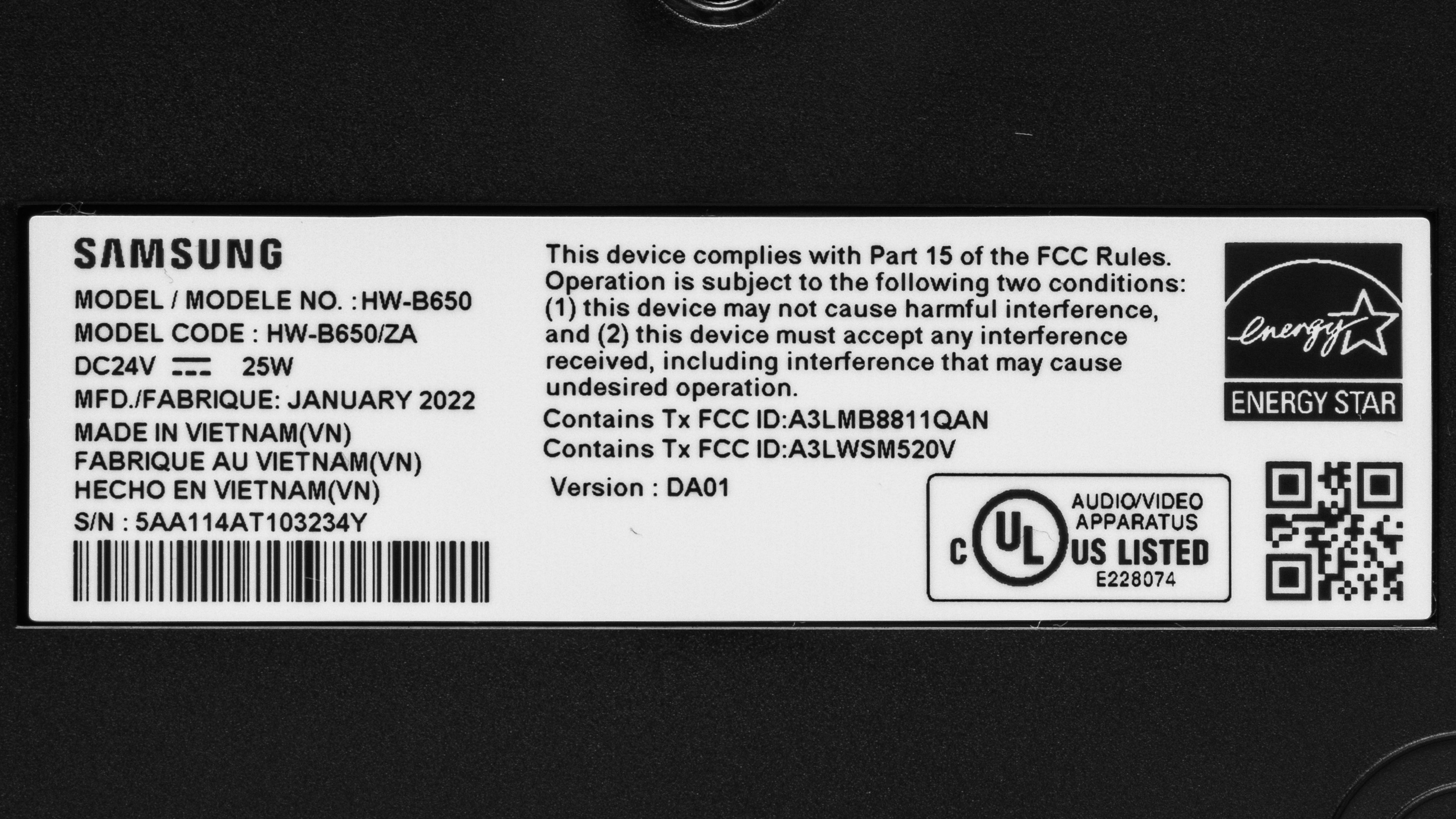 The Samsung HW-B650/ZA is available in 'Black'. You can see the label for the model we tested here.