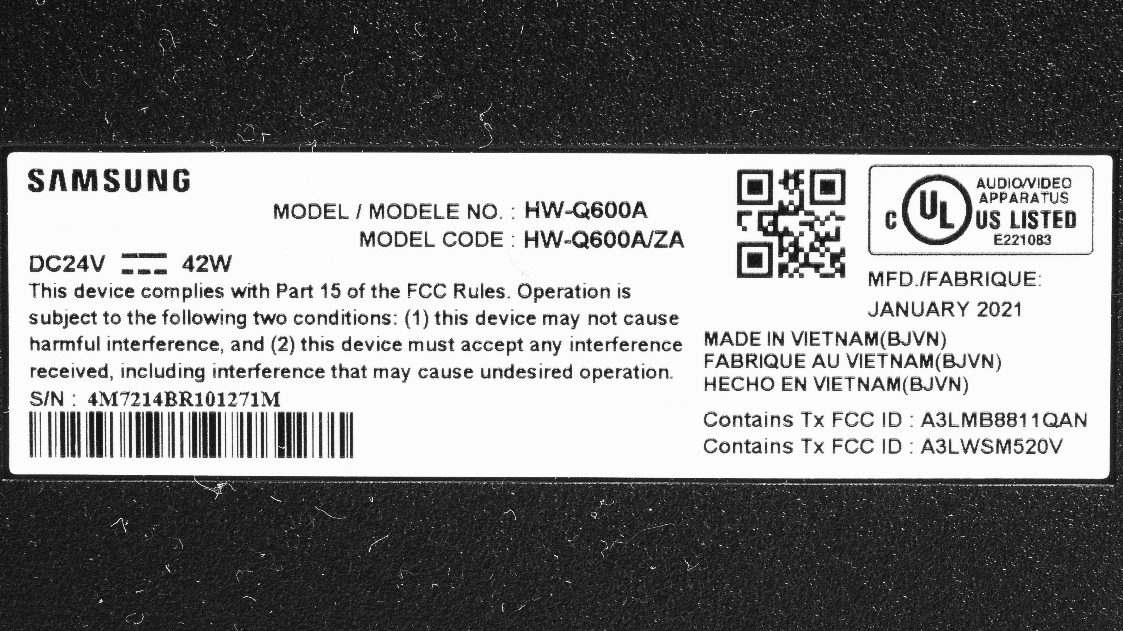 The Samsung HW-Q600A is available in 'Black', and you can see the label for the model we tested here.