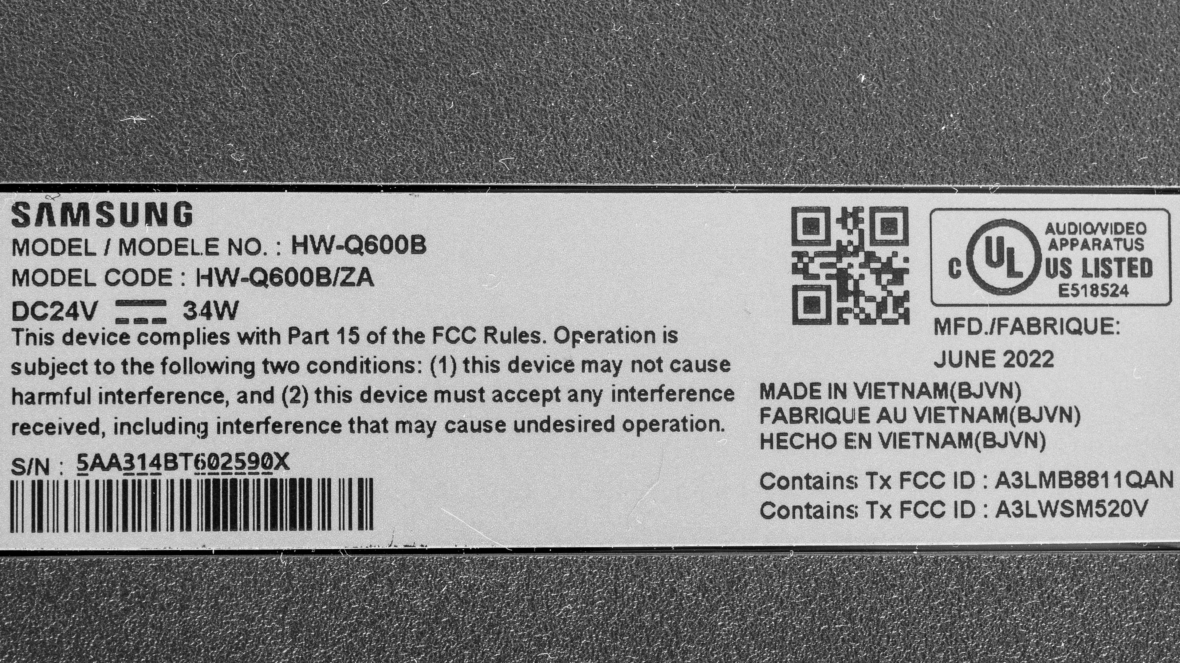 The Samsung HW-Q600B is available in Black, and you can see the label for the model we tested here.