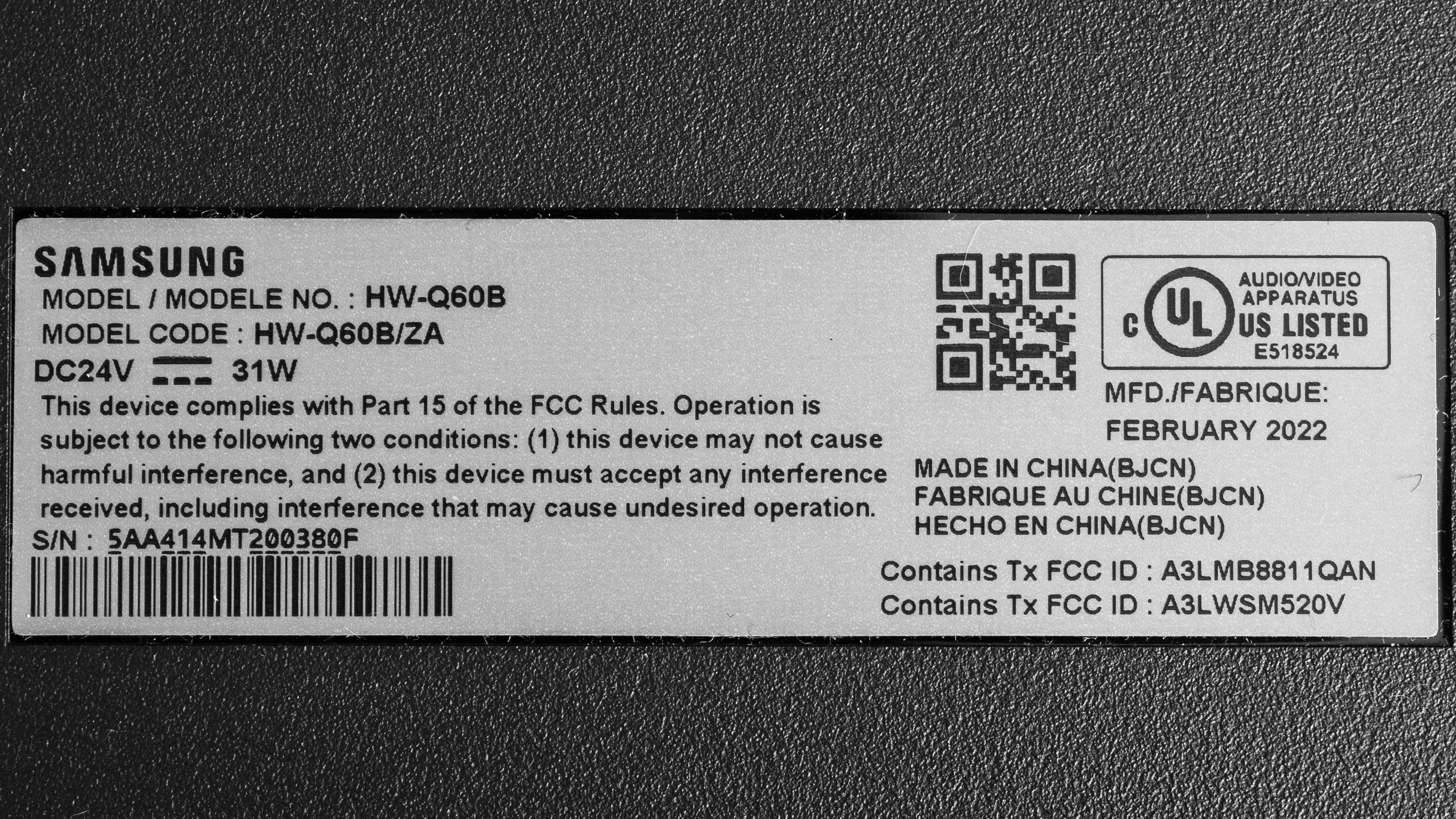 The Samsung HW-Q60B is available in 'Black', and you can see the label for the model we tested here. You can find a version of this soundbar at Costco called the Samsung HW-Q67CB. It's the same bar and subwoofer, but it also comes with satellites.