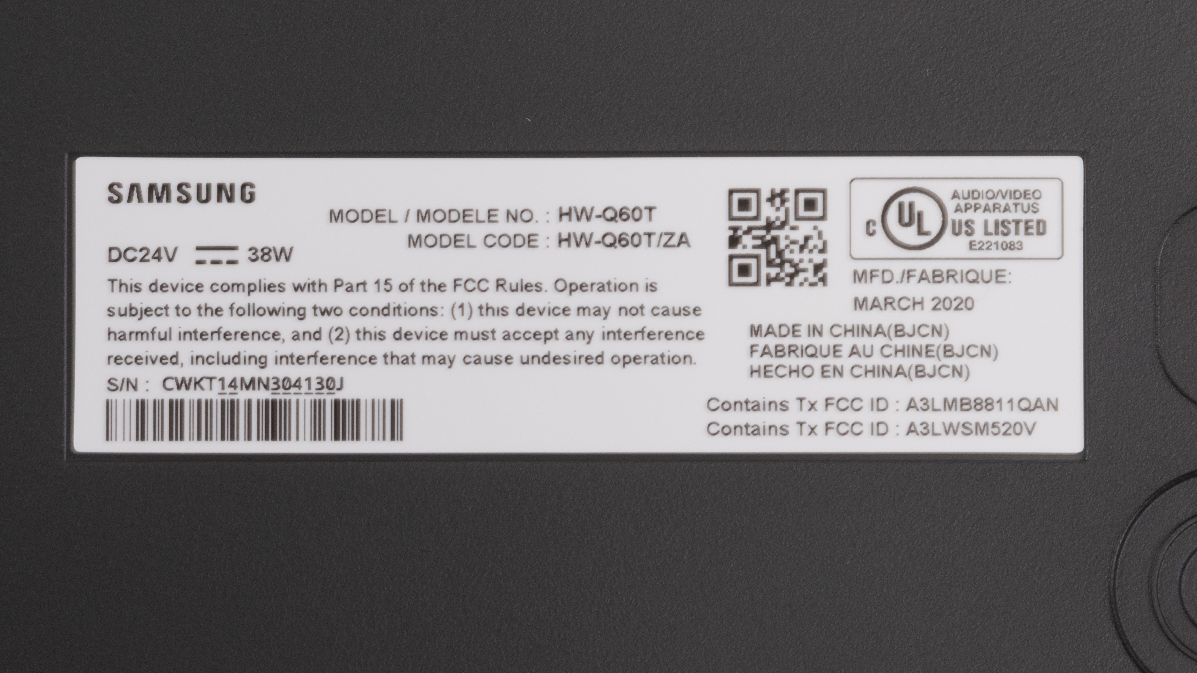 The Samsung HW-Q60T comes in one color variant: 'Black'. You can see the label for the model we tested here.