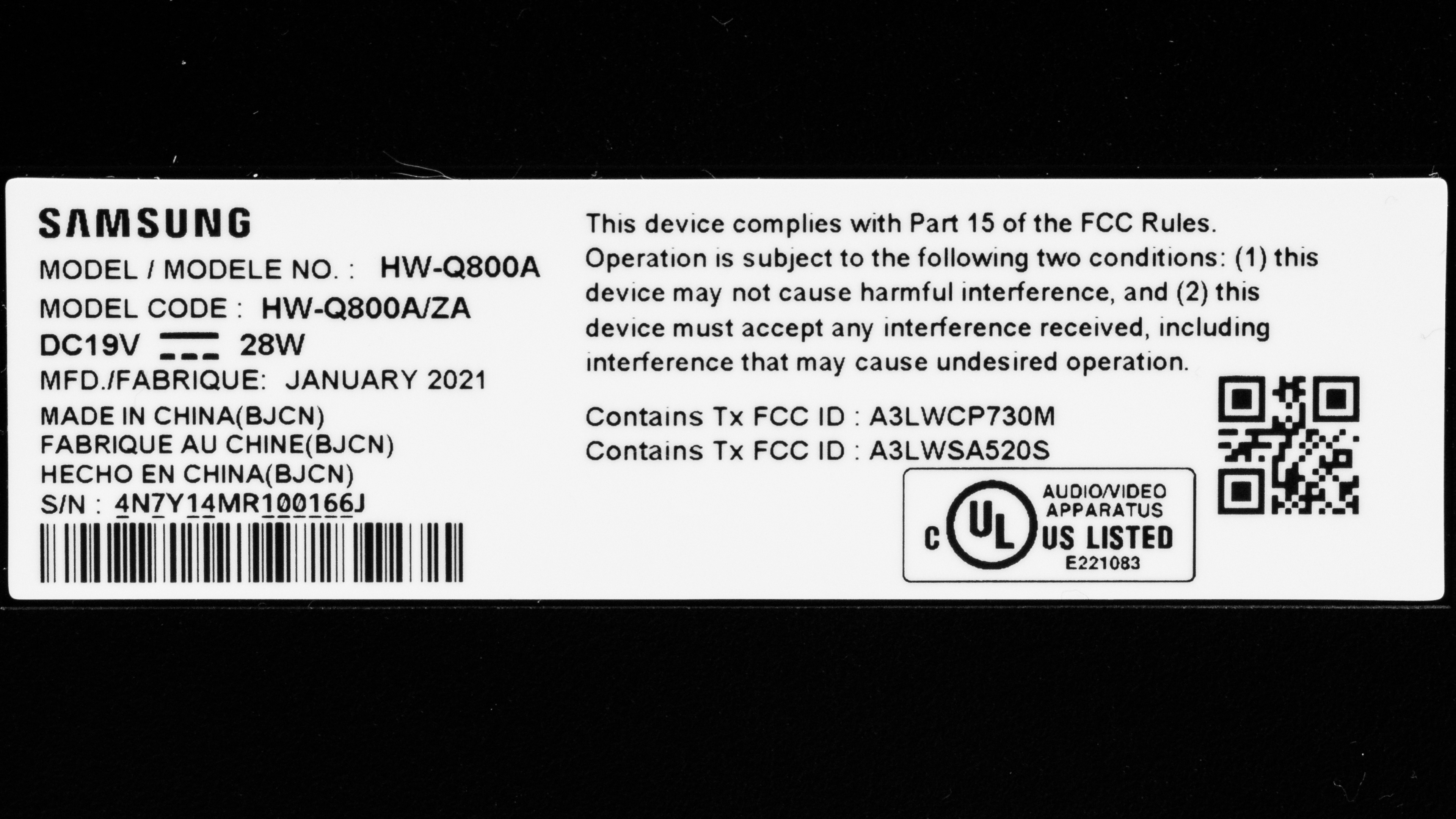 The Samsung HW-Q800A comes in one color variant: 'Black'. You can see the label for the model we tested here. If you come across a variant not listed here, let us know in the comments below and we'll update the review.
