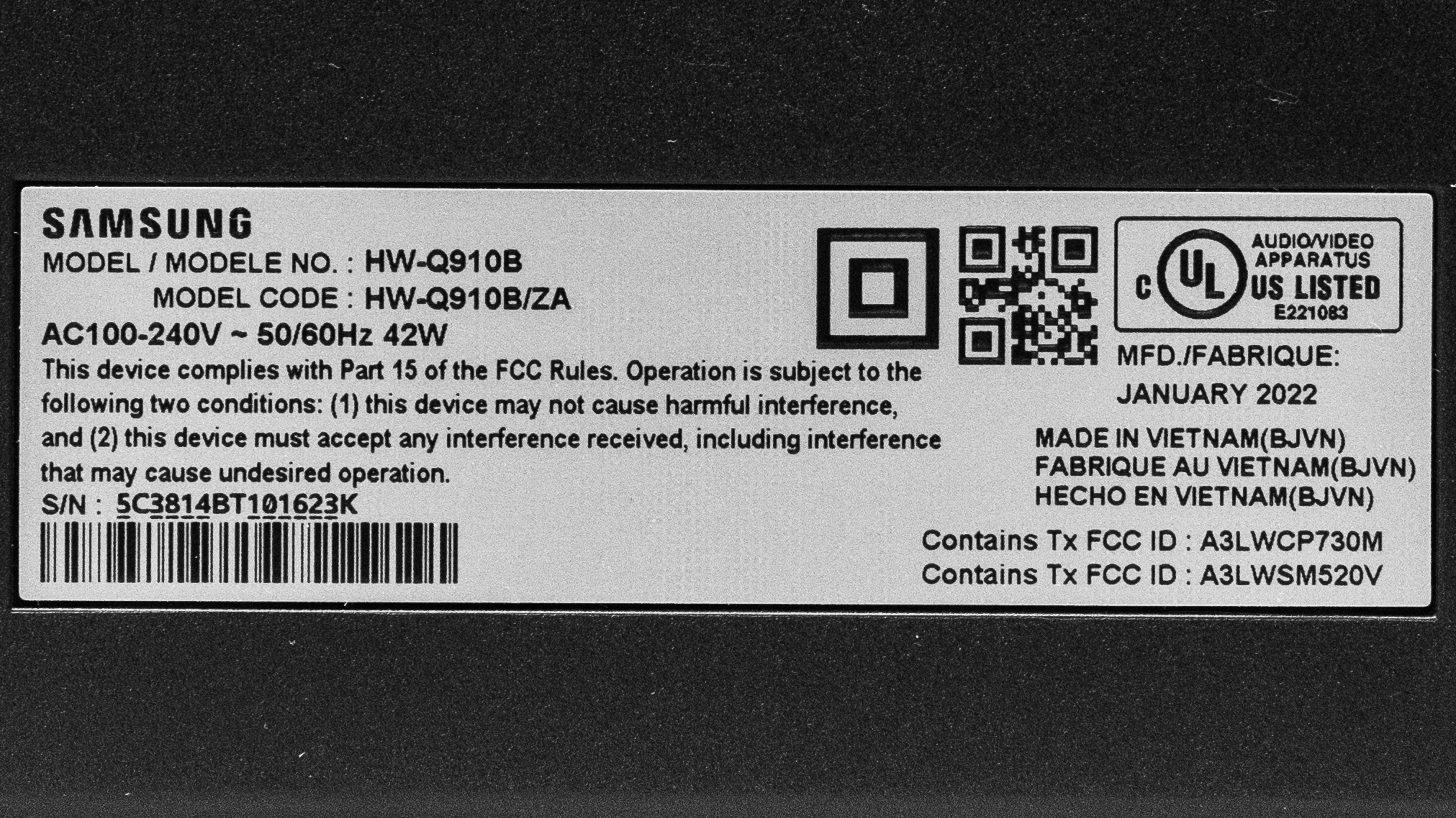 The Samsung HW-Q910B is available in 'Black', and you can see the label for the model we tested here.