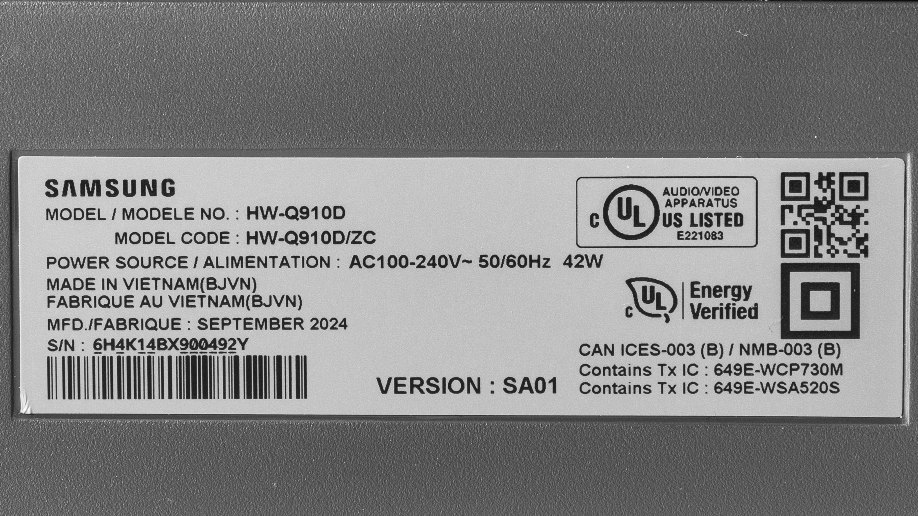 The Samsung HW-Q910D is the next generation of the Samsung HW-Q910C. It's available in just one color: 'Black', and here's a picture of its label.