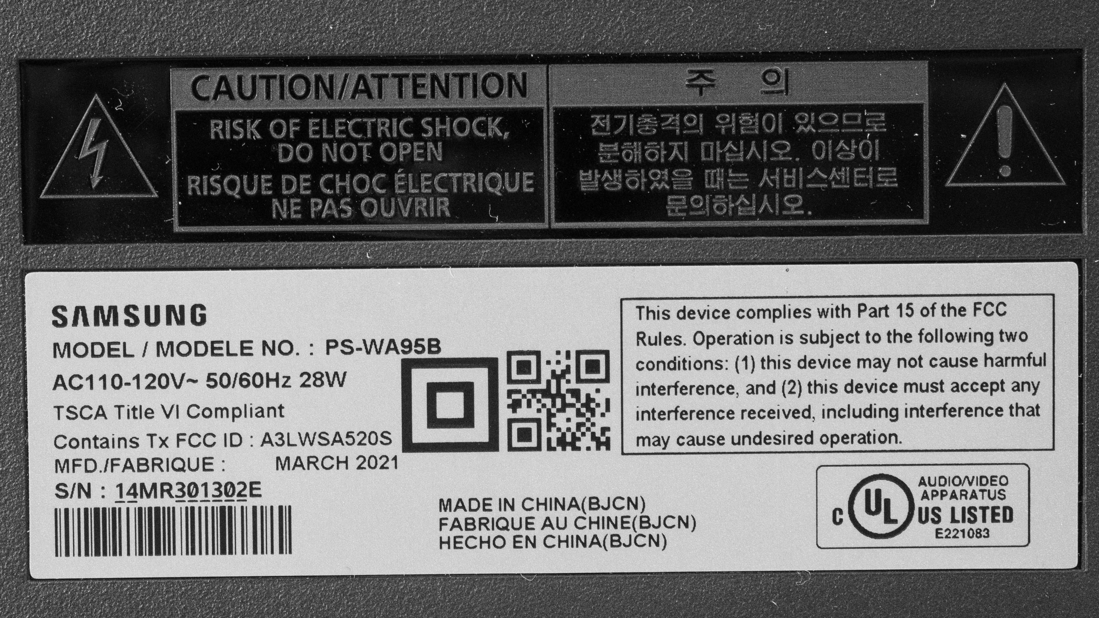 The Samsung HW-Q950A 11.1.4ch soundbar is available in 'Black'. You can see the label for the model we tested here.
