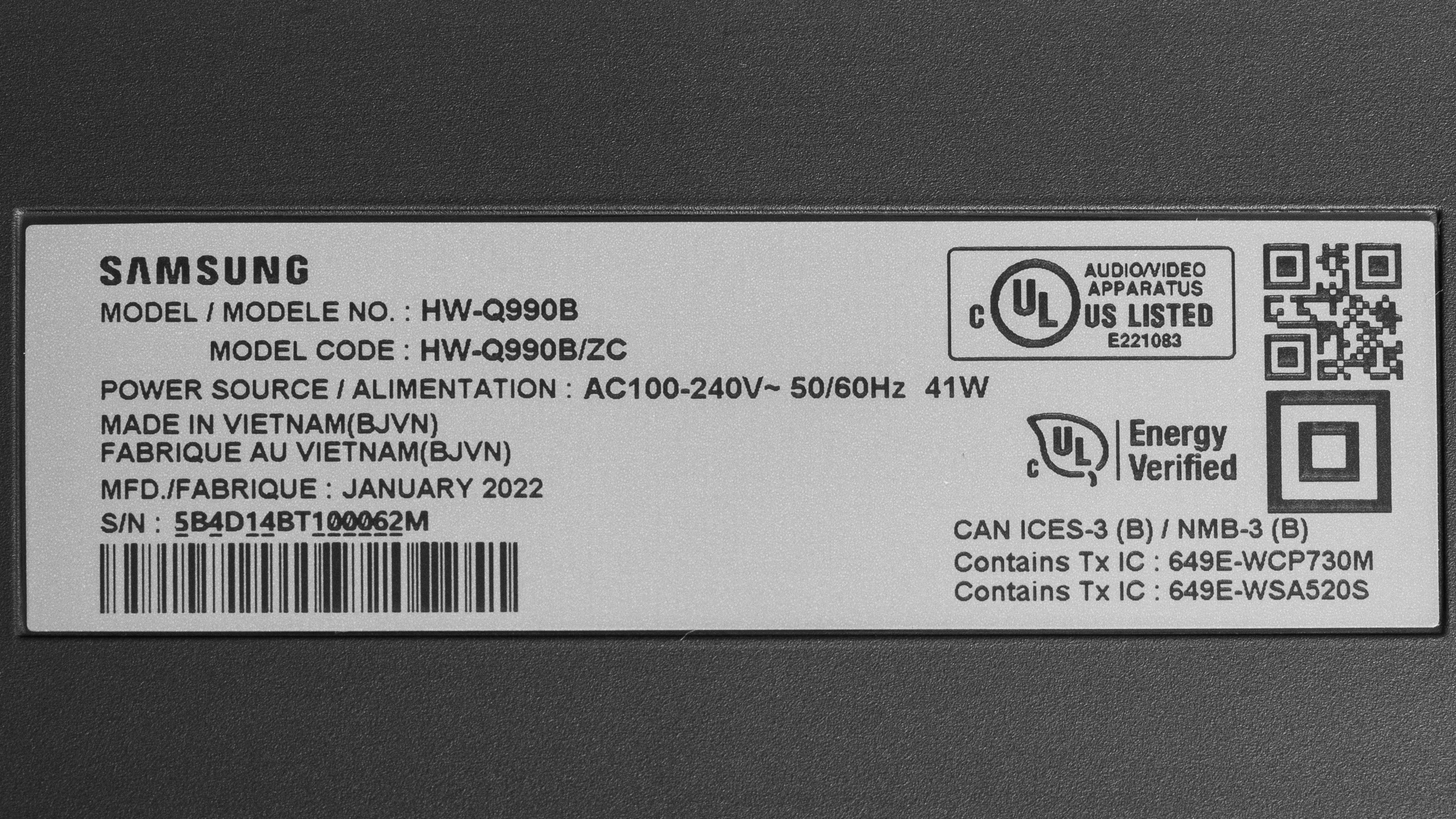 The Samsung HW-Q990B is available in 'Black'. You can see the label for the model we tested here.