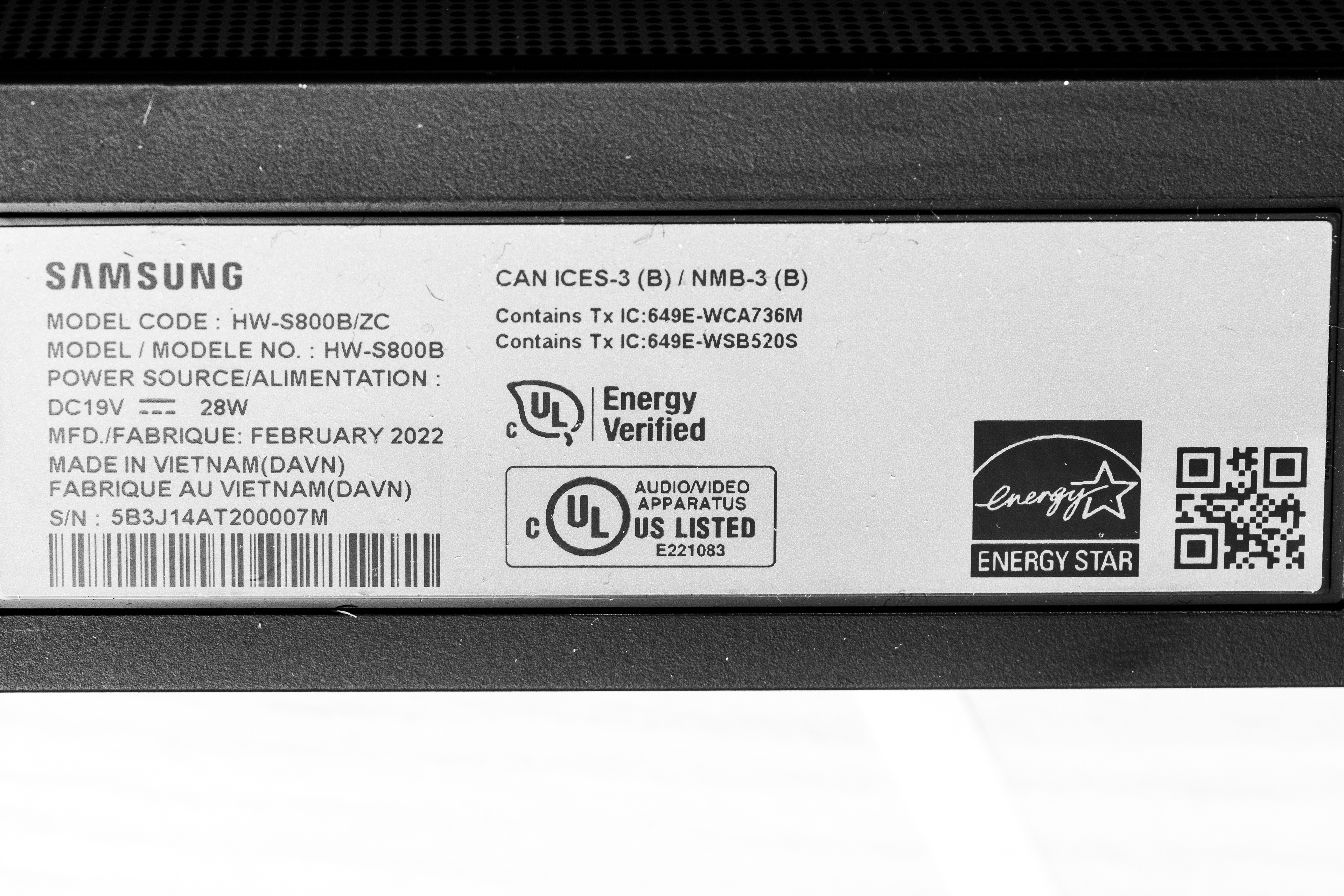 This soundbar is available in Black, and you can see the label here. You can also find a white version named the Samsung HW-S801B. You can find a version of this soundbar at Costco as the Samsung HW-S80CB or Samsung HW-S80CB/ZA.