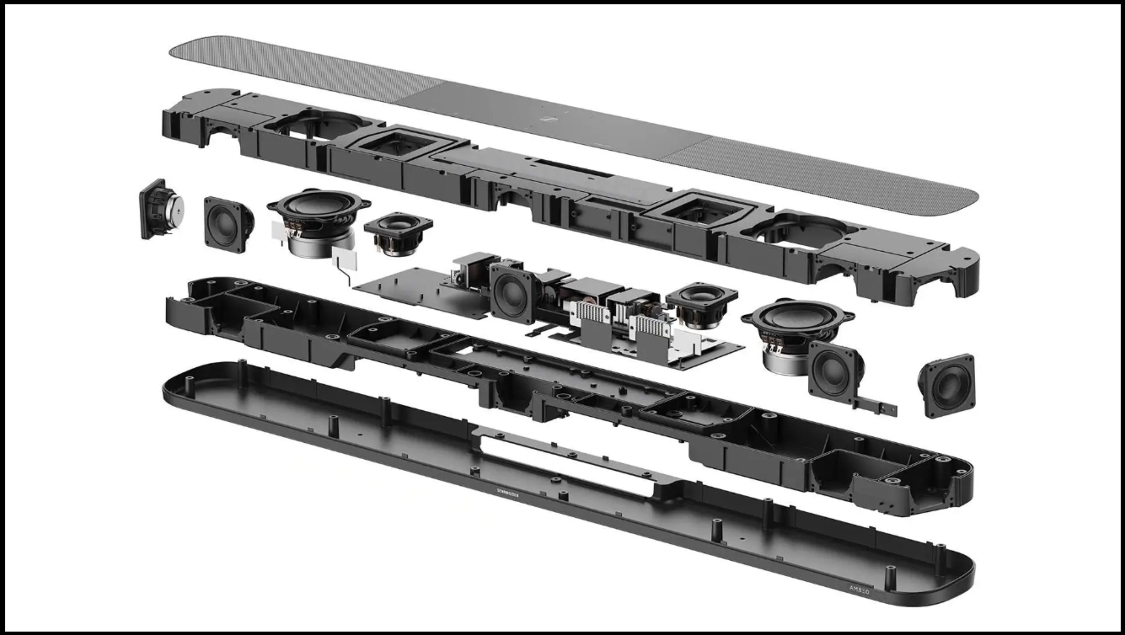 Note: The manufacturer advertises this bar as a 7.1.4 setup. However, after testing the bar, we have determined that it is physically more in line with a 5.1.2 soundbar. It has surround channels on each side, along with left and right stereo channels and a center channel. There are also two up-firing drivers and the integrated dual subwoofers. Our impressions appear to be confirmed by an exploded view of the bar's setup found on the manufacturer's website. The bar is marketed to use its room correction technology to position seven "virtual" speakers around you and four overhead, which is likely why it's advertised in this way.