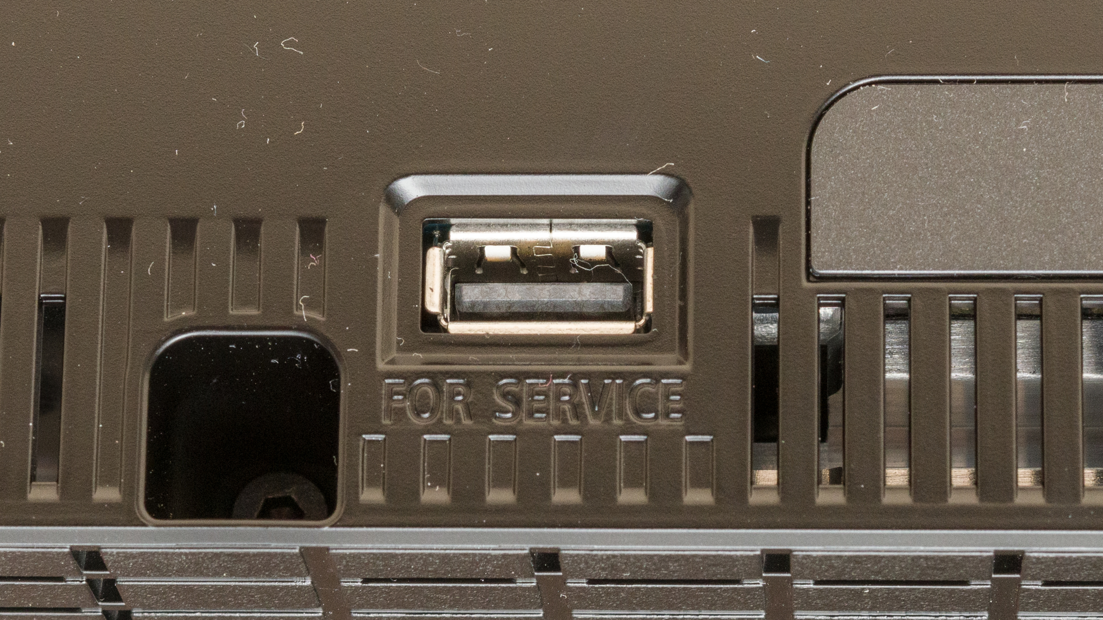 The soundbar has one full HDMI In port and one eARC port. Their side-by-side location is pretty tight if you have chunky cables. Otherwise, there's a S-Center Out port to connect with compatible TVs. On the underside, there's a USB-A port (shown here) for servicing the soundbar.