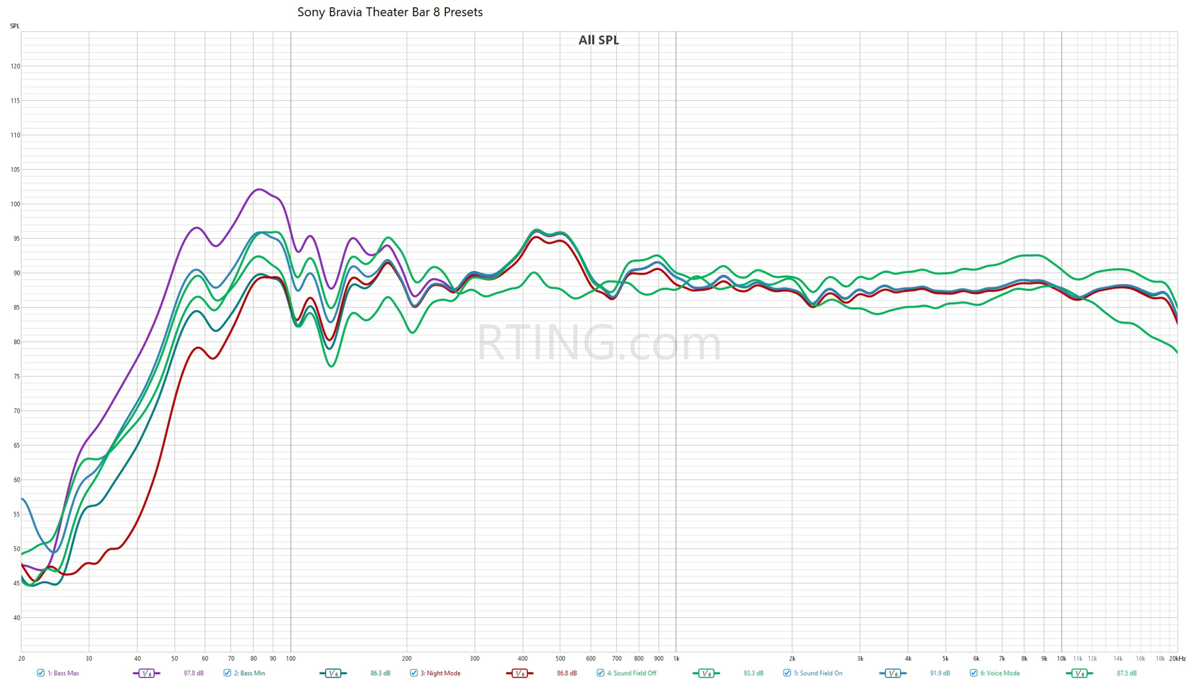 You only get three settings to adjust the bass ('Min,' 'Mid,' and 'Max') and besides 'Sound Field,' there are only two other sound enhancement modes, 'Night' and 'Voice.' Here's a comparison of the different sound enhancement modes, including 'Sound Field' enabled and 'disabled.' You'll note the prominent bump in the mid-range with the 'Sound Field' function enabled, which can cause a somewhat artificial muddiness to your audio.