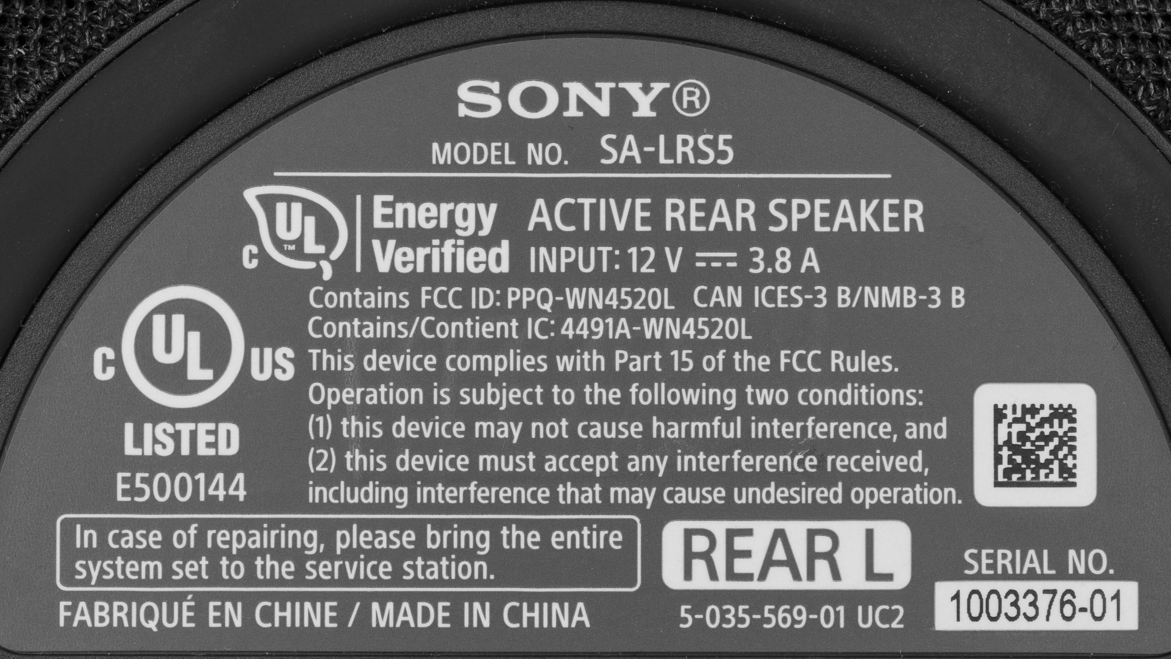 The two SA-RS5 satellites are cylindrical with a flat back, which are smaller but similar in shape to the previous Sony HT-A9 with Bass Module’s included satellites. They look a bit like slightly enlarged and upscale desktop speakers that came with catalog home computers in the late 1990s. Their fabric is a different pattern from the other speakers in the kit. Each includes an up-firing driver for surround sound with height.