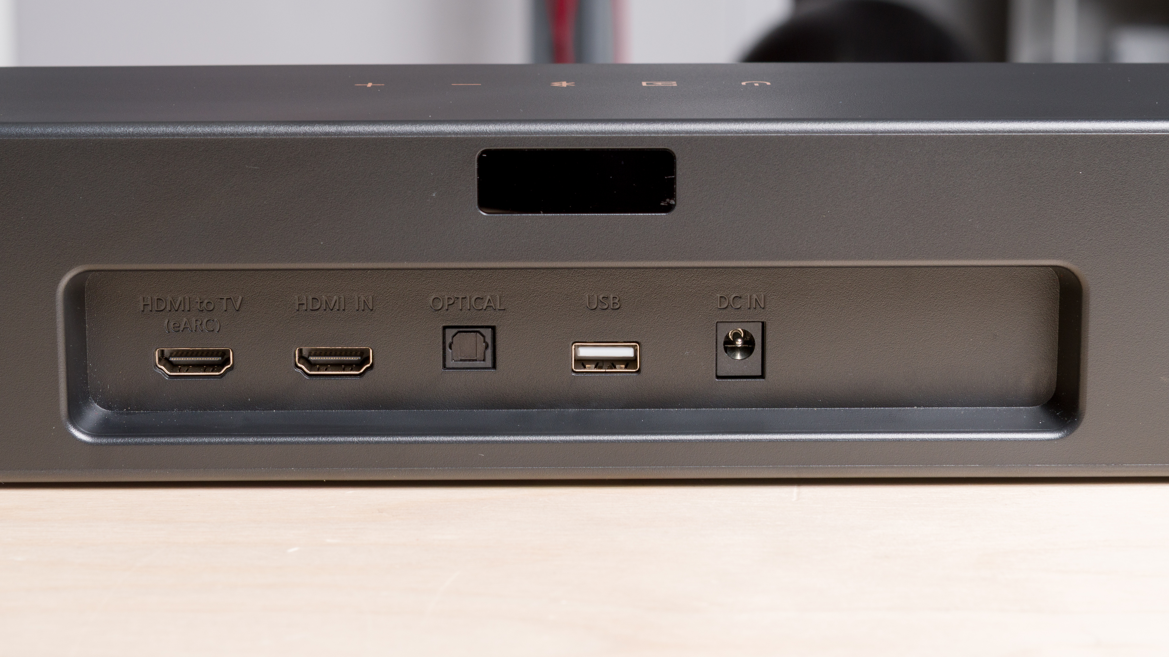 This soundbar's connectivity options include an HDMI eARC out, a single full HDMI In port, an optical port, and a USB port that lets you load MP3/FLAC files.