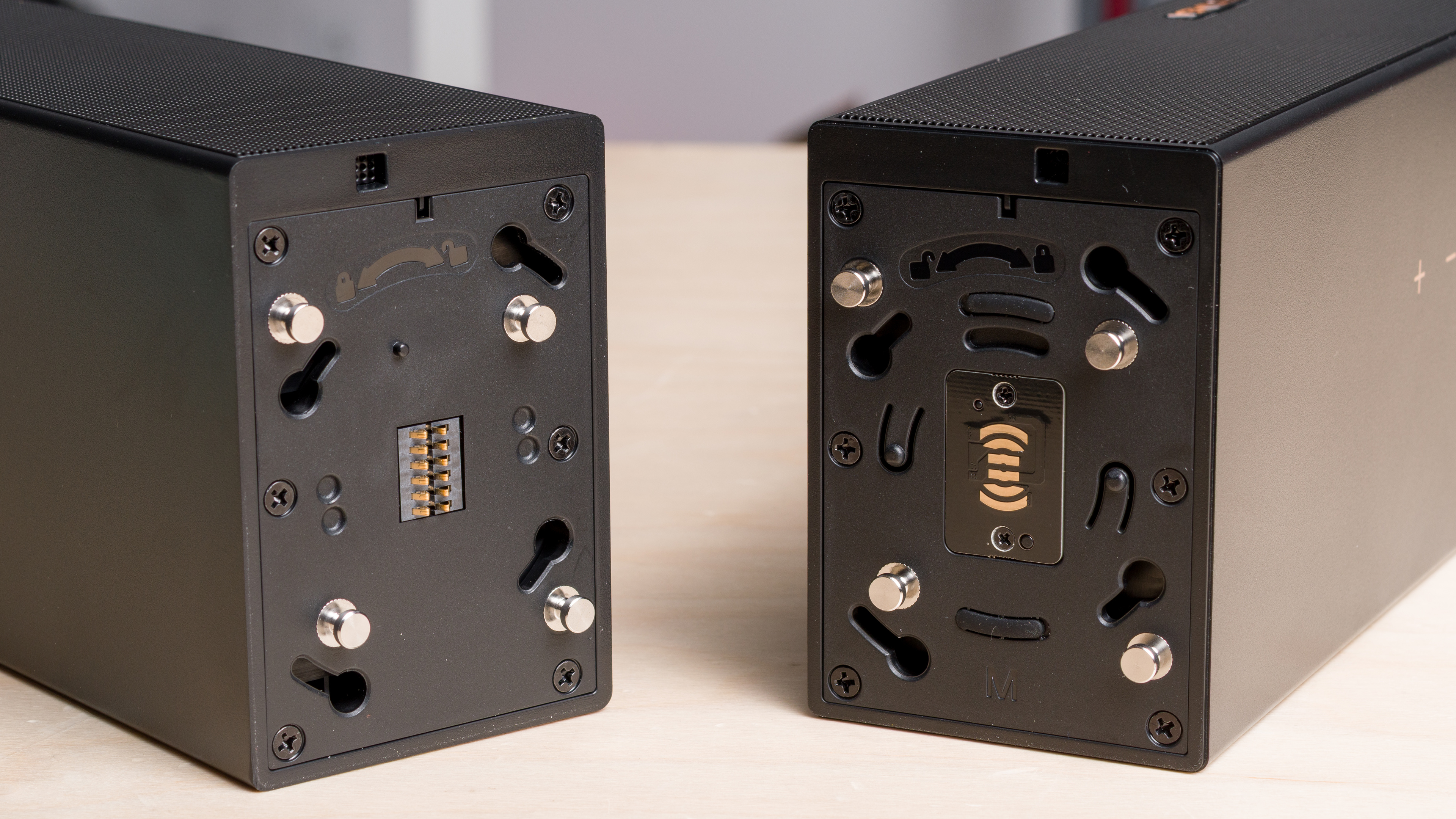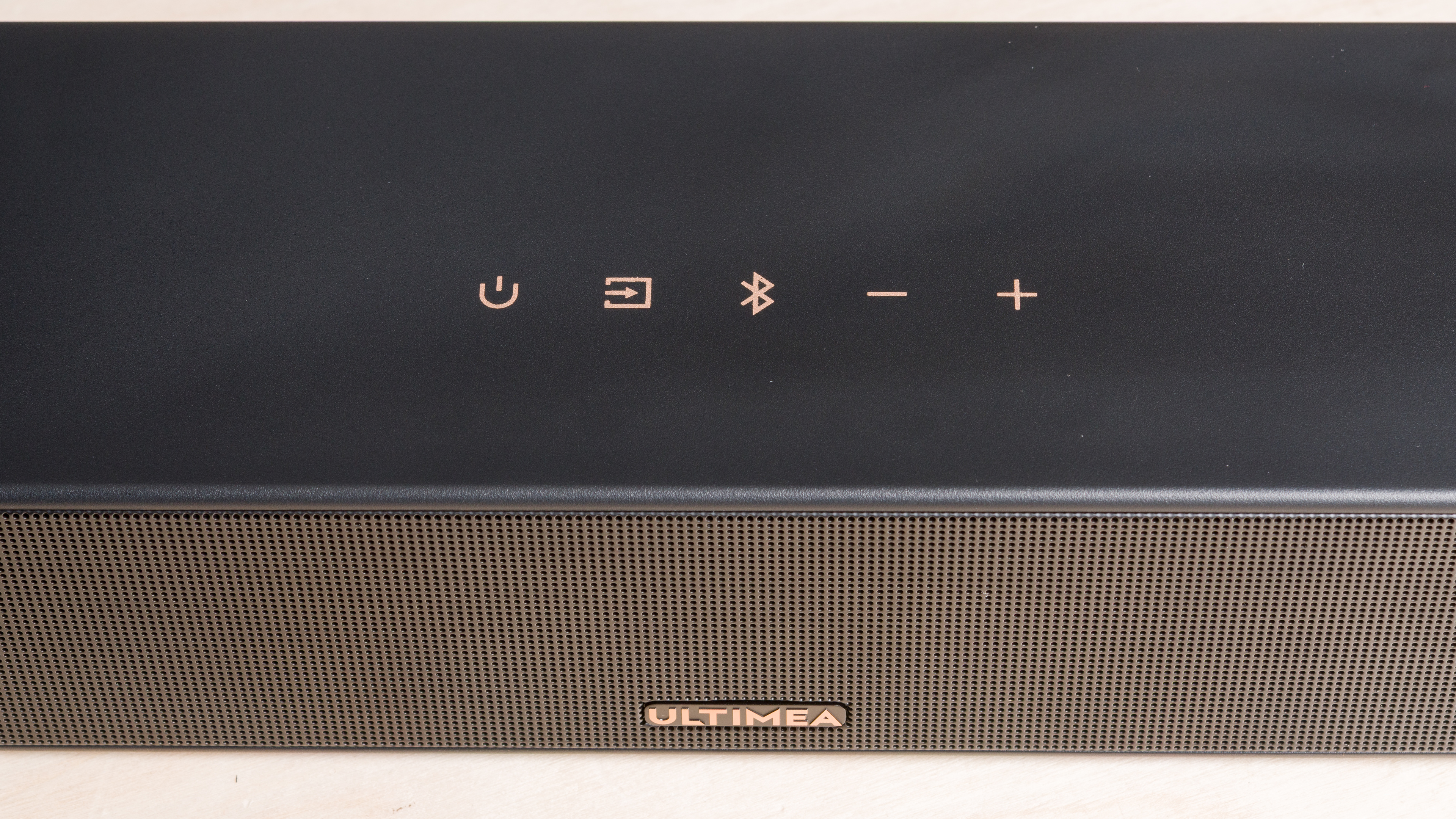 The Ultimea Skywave X70 is made of hard plastic, finished in a semi-gloss black finish that contrasts with the gold brand logo in the center of the bar. There are other gold accents on the bar (the controls and up-firing drivers), giving it a slightly upscale look. As is the norm for most bars, it's wrapped in a metal grill cover that encompasses the front, wrapping around the sides and encasing the up-firing drivers. Interestingly, the bar is shipped in three separate pieces that are connected together using a system of interlocking studs.