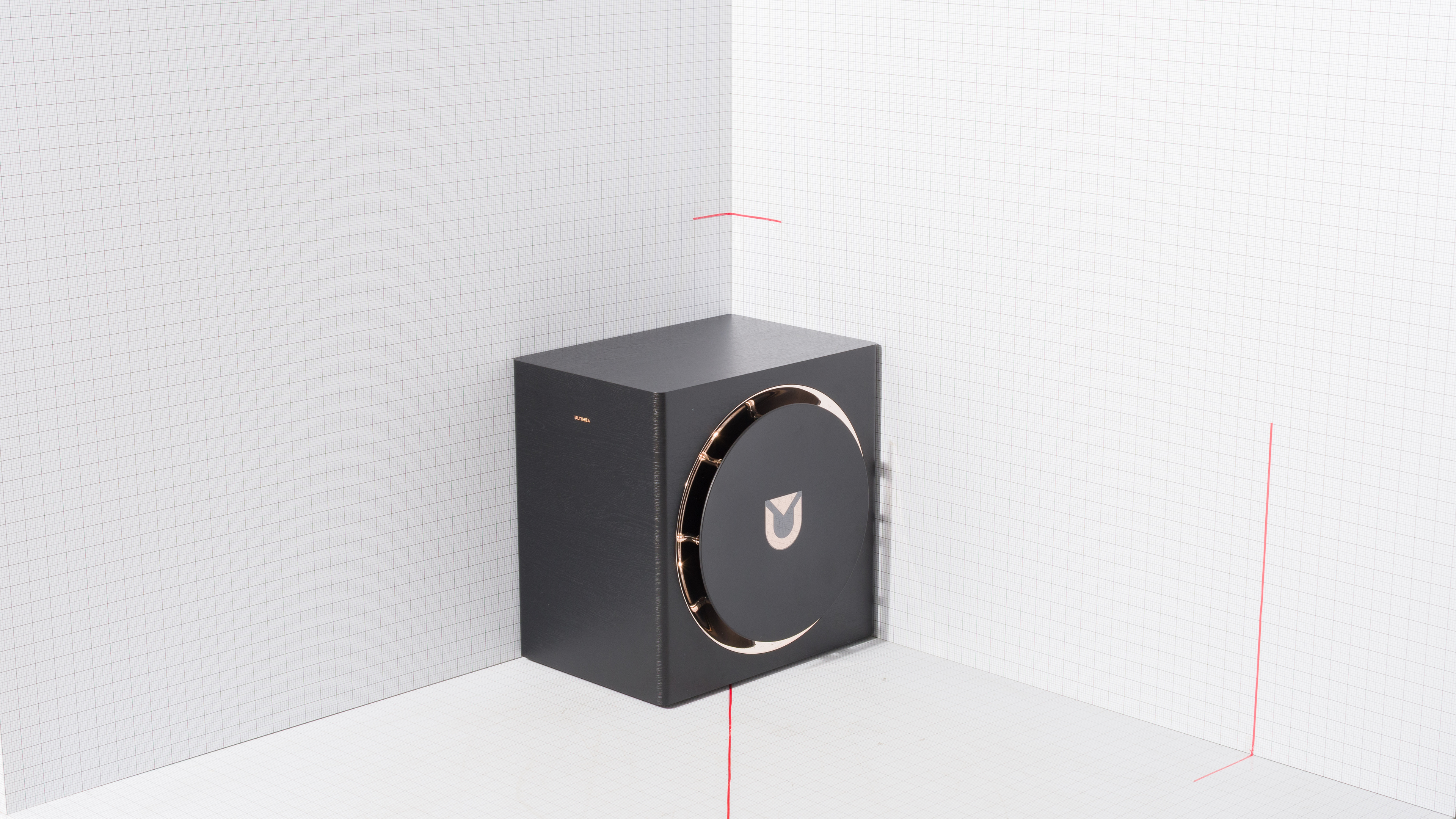 The sub is on the larger size, housing a 10-inch driver within its ported design. The side-firing woofer is protected by a hard plastic logo emblazoned with the Ultimea logo, featuring reflective gold trim. All in all, it shares a few aesthetic similarities with a gaming PC tower.