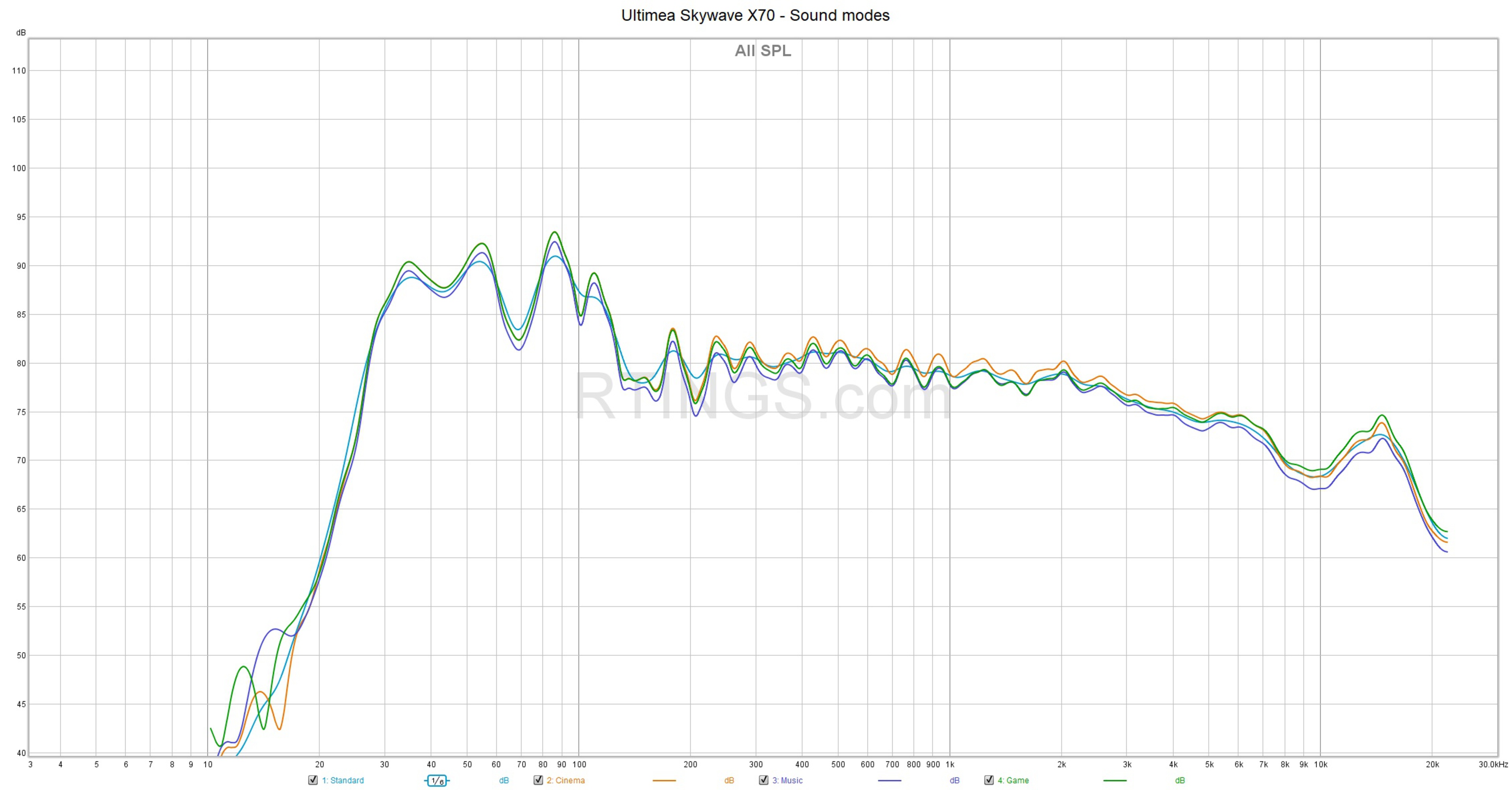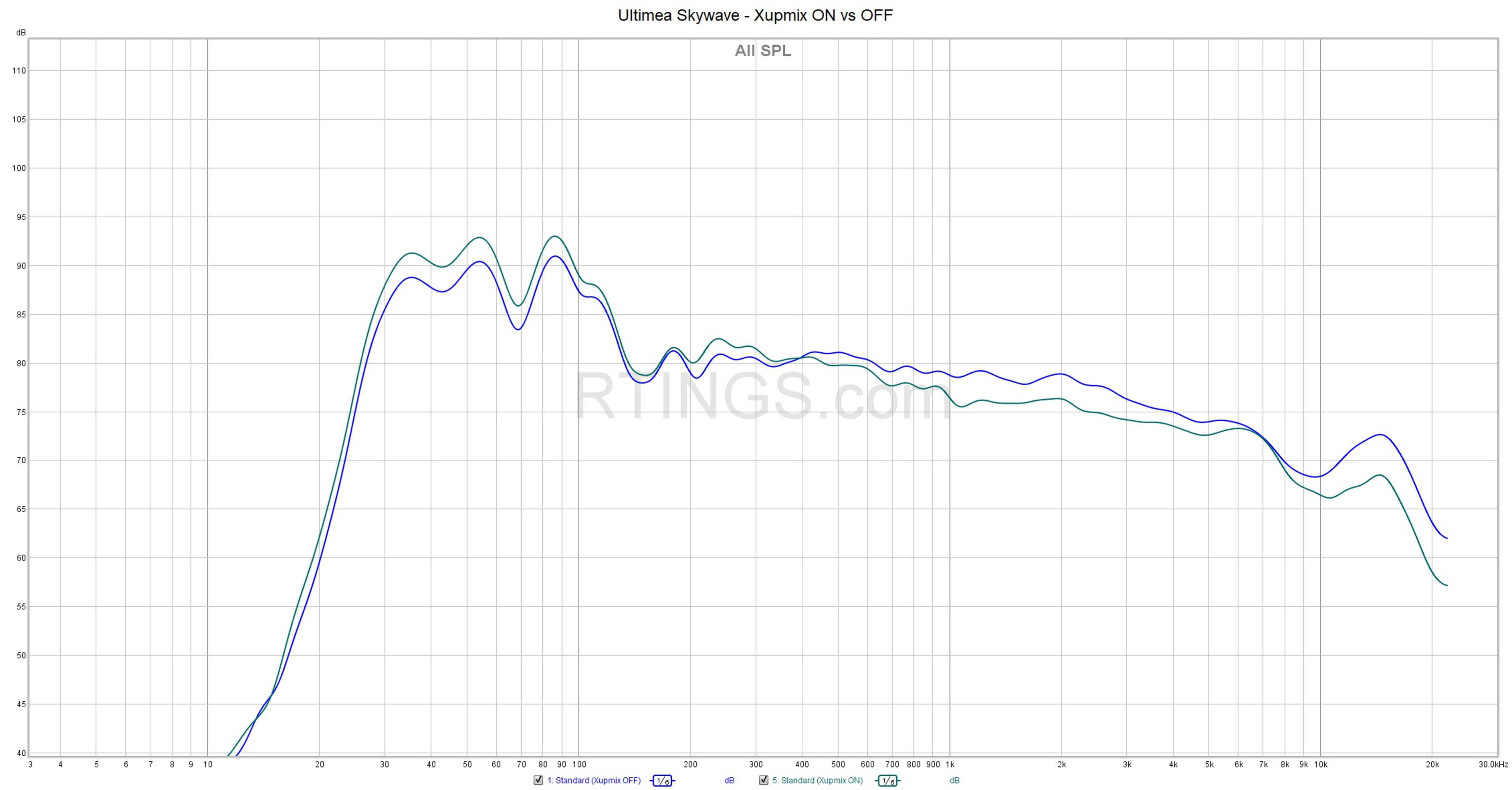 The Ultimea Skywave X70 has a good frequency response, though we feel it sounds worse subjectively than our scoring indicates. Ultimea themselves recommended the following settings for optimal performance: X-Upmix (virtual surround) disabled, Treble set to 10, and up-firing (height) set to max in the app. However, besides disabling X-Upmix, we subjectively found that the boosted treble introduced too much sibilance into the mix, and the changes to height settings slightly increased the height at the expense of overall dynamic balance. As a result, we measured it in 'Standard' mode with the X-Upmix setting disabled and other settings untouched.