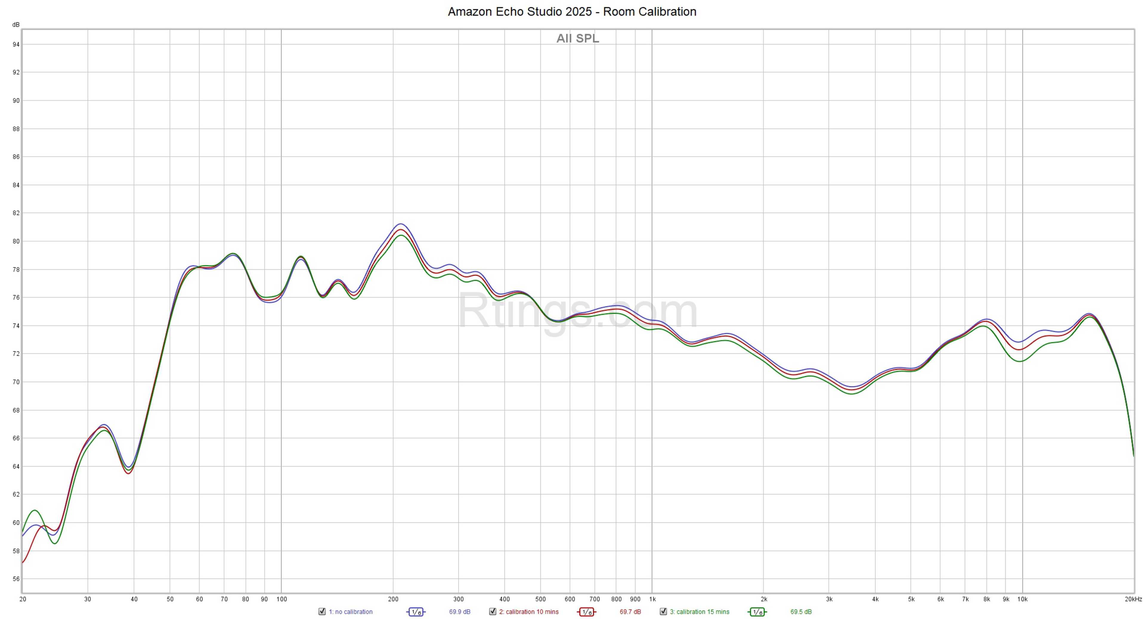 We tested this speaker using the built-in room correction feature. We found that this calibration would automatically re-run every 15 minutes to adjust the sound to the speaker's surroundings. We were able to capture how the frequency response evolves over this 15-minute period before being reset again.