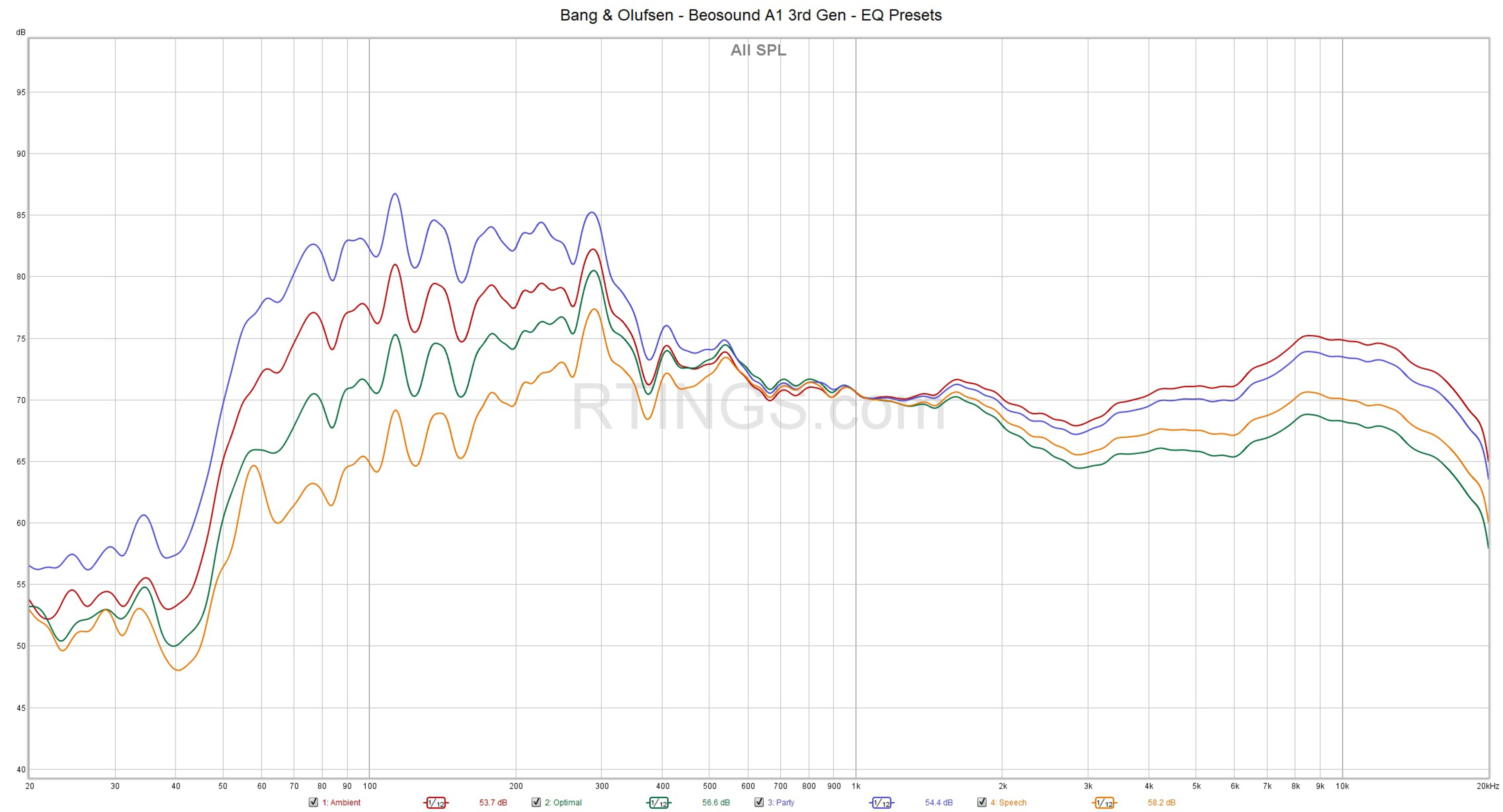Overall, the sound signature is similar to that of its predecessor, the Bang & Olufsen Beosound A1 Gen 2, with the newer version having a slightly bigger boost in the low-mids. Whether you like that extra warmth or find it reduces the clarity of voices and instruments too much is a matter of taste, but you can always tweak the speaker's EQ profile in the companion App. We also measured the effect of different presets on the sound.