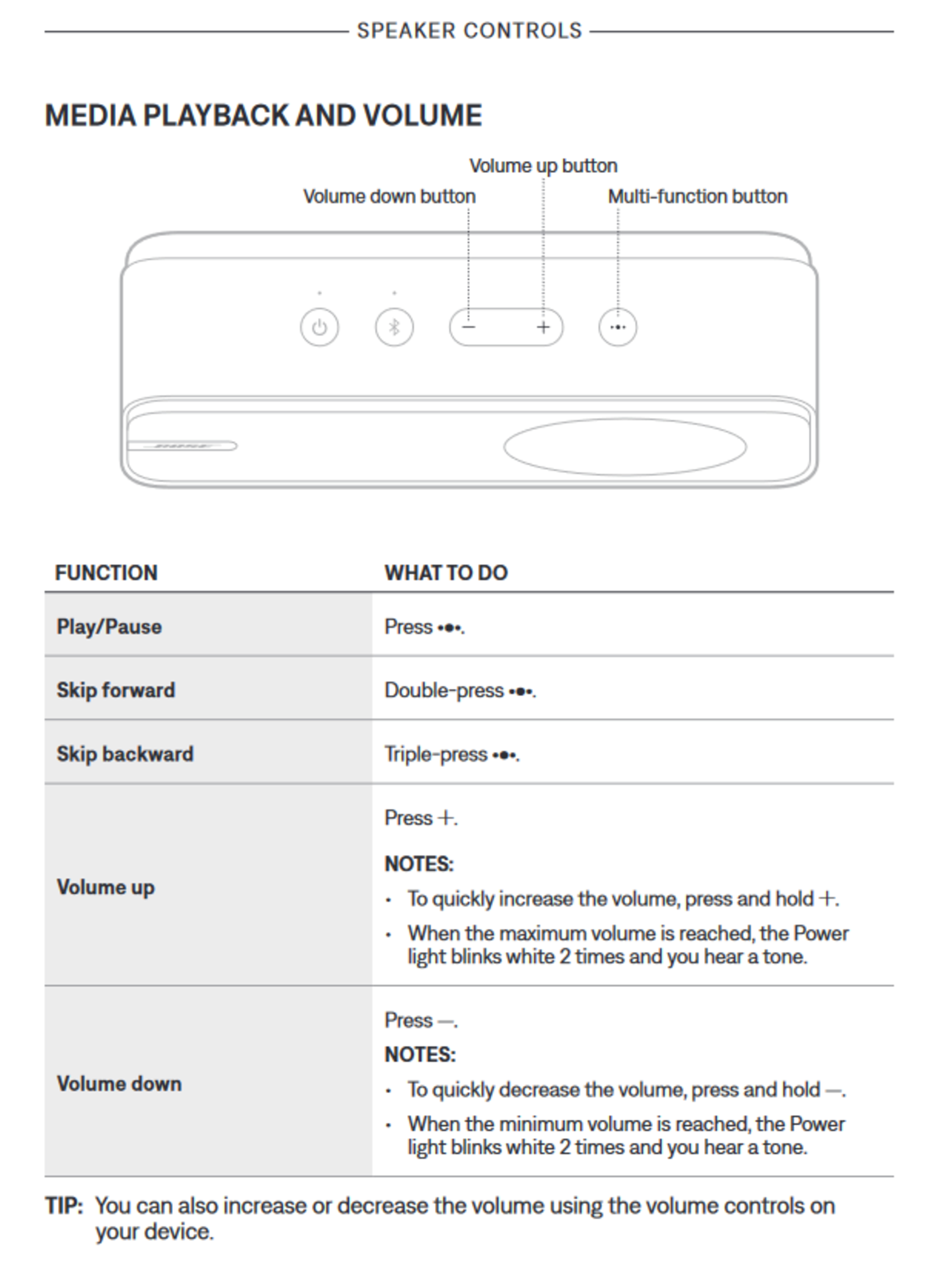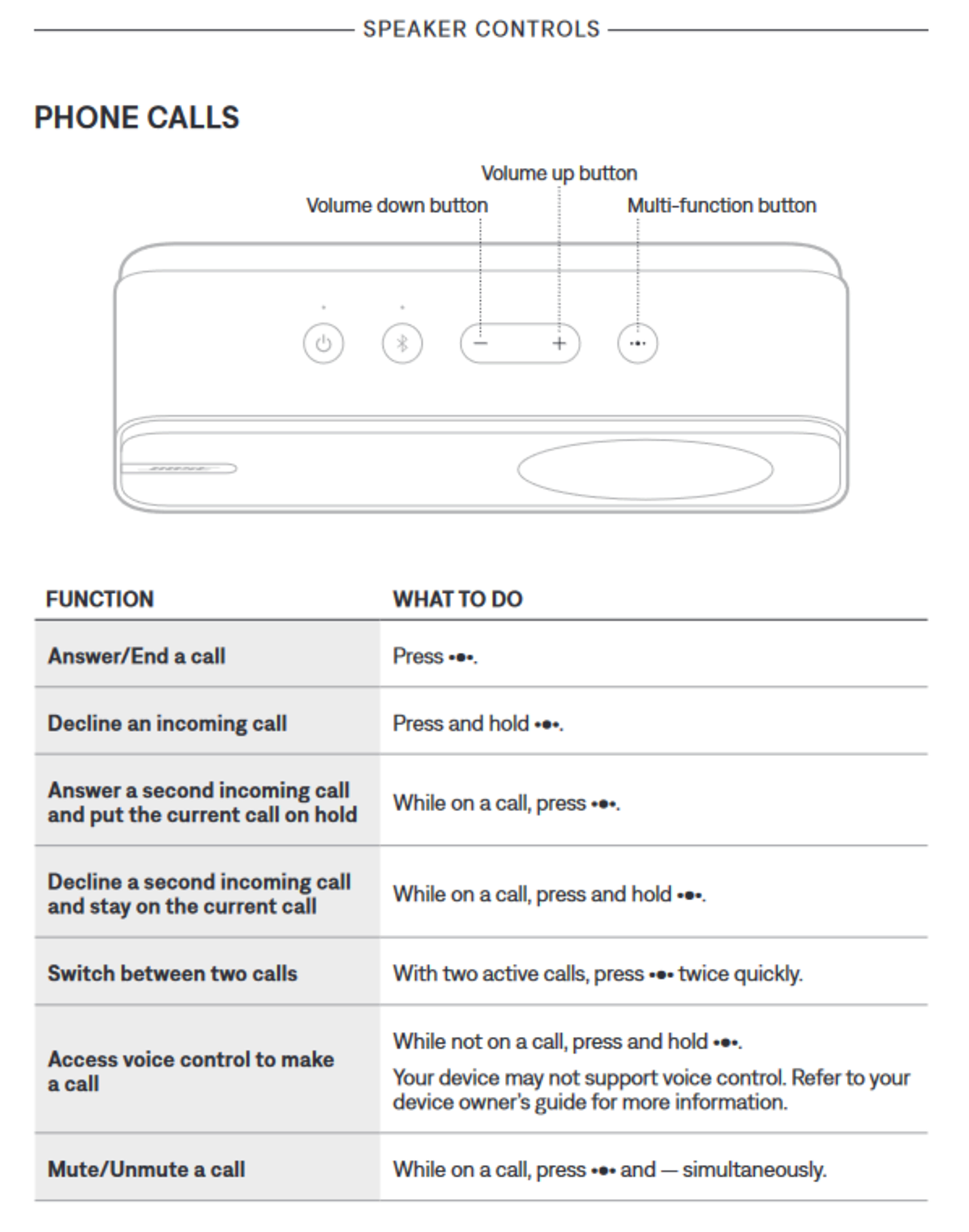 The Bose SoundLink Home's controls are excellent. Here are a couple of diagrams showing you how they work to control media playback and phone calls. The controls feel good to use. They make a satisfying click when pressed, and the layout is intuitive and easy to use. That said, it's a little frustrating that so many of the controls use the multi-function button, so you do have to remember a lot of button combos, a bit like using wireless earbuds. The speaker plays chimes when you pair it with a new device and reach the minimum or maximum volume. It also reads the battery level when powering up. You can use the shortcut button to pair the speaker with another unit for stereo playback.