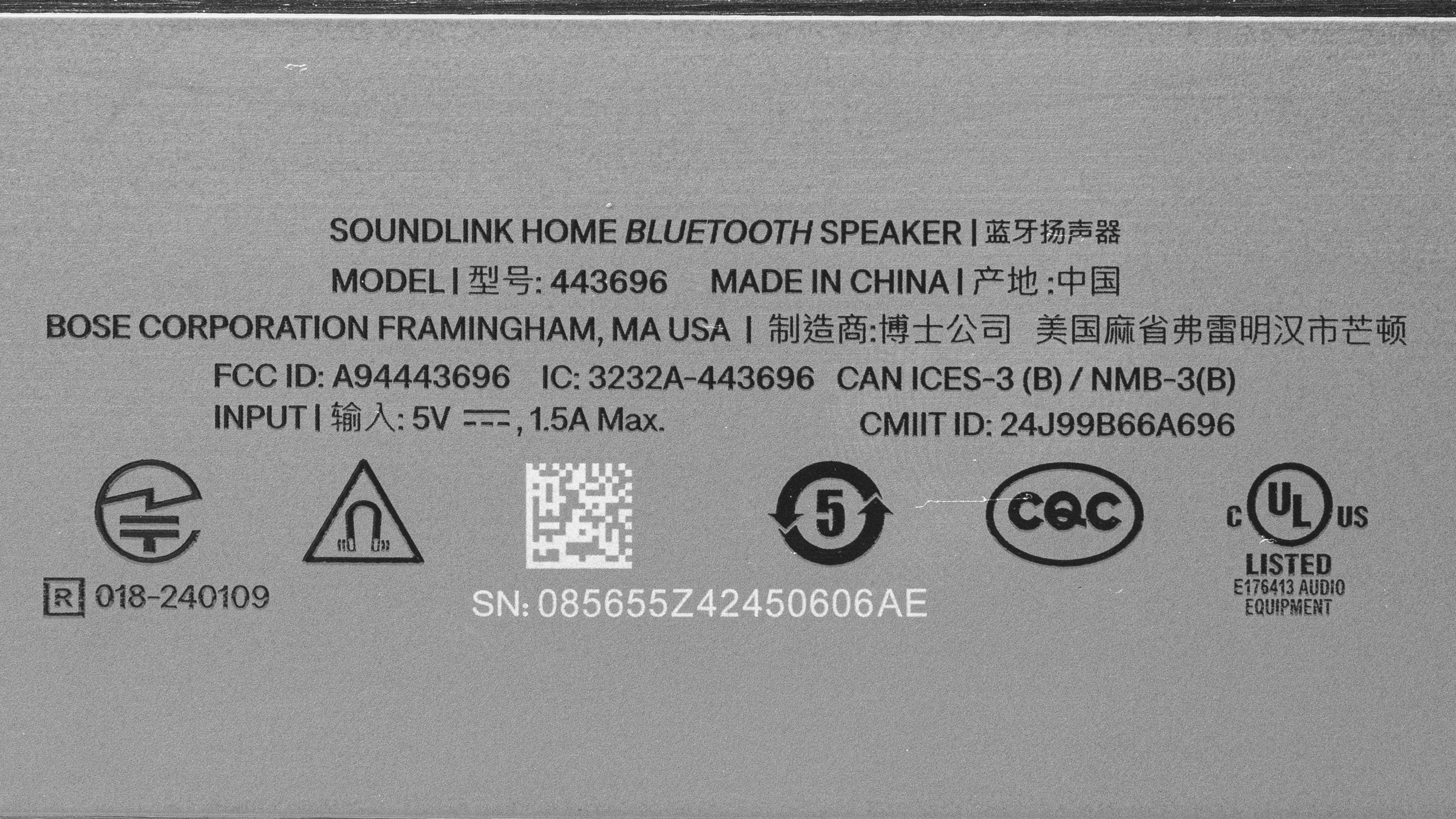The Bose SoundLink Home Bluetooth speaker comes in two color variants: 'Cool Gray' and 'Light Silver.' We tested the 'Cool Gray' variant, and this is its label. We expect our results to be consistent between variants.
