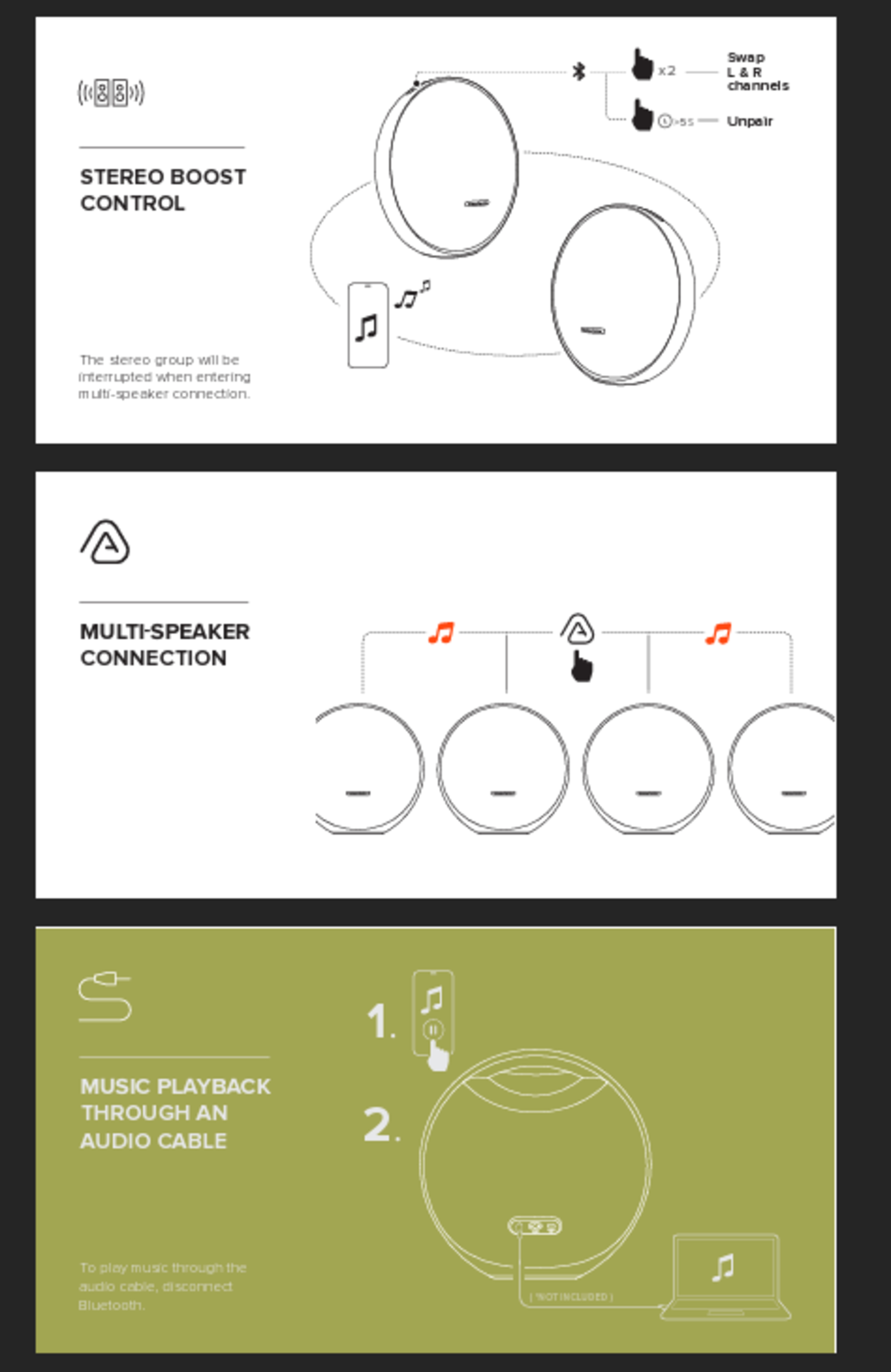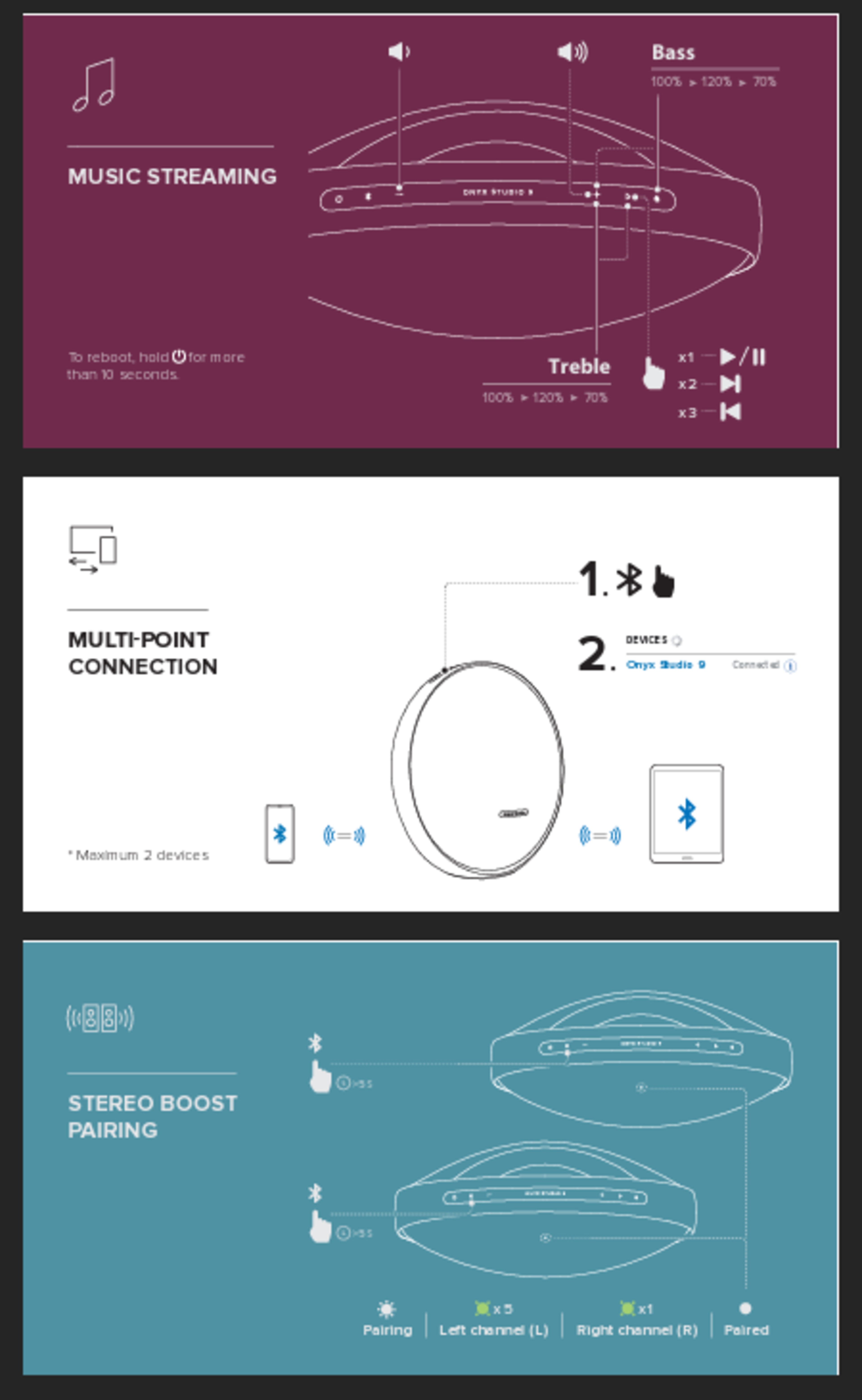 Much like the Harman/Kardon Go + Play 3, the Harman/Kardon Onyx Studio 9 has very good controls. The speaker includes basic playback functions with dedicated buttons for volume up/down and play/pause. Most controls have secondary functions accessed by holding buttons down for a longer period or by pressing them in combination. Here is an image showing how these controls work. The speaker does sometimes miss your commands when inputting double or triple presses, so it can take a little while to get used to the expected rhythm.