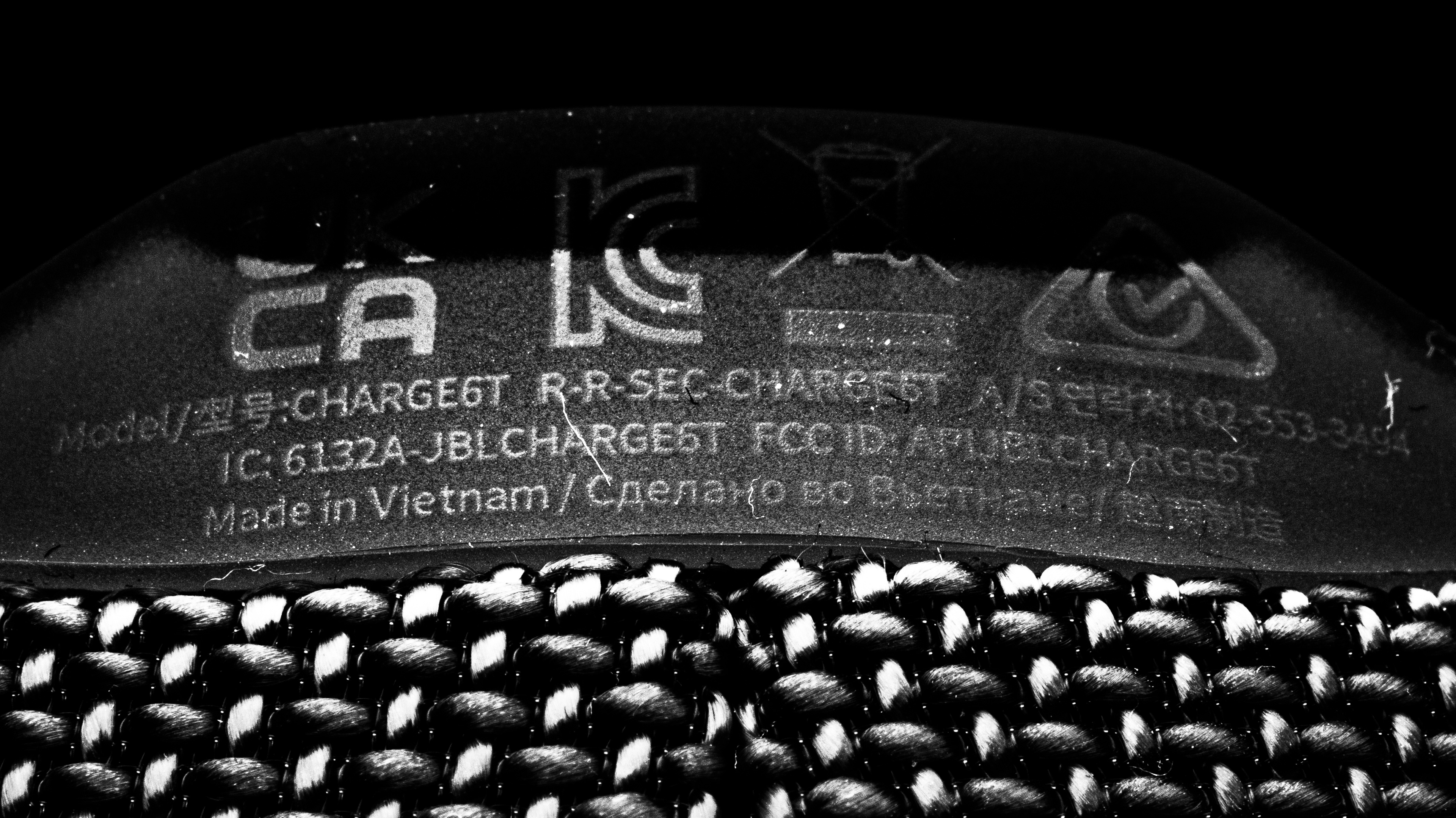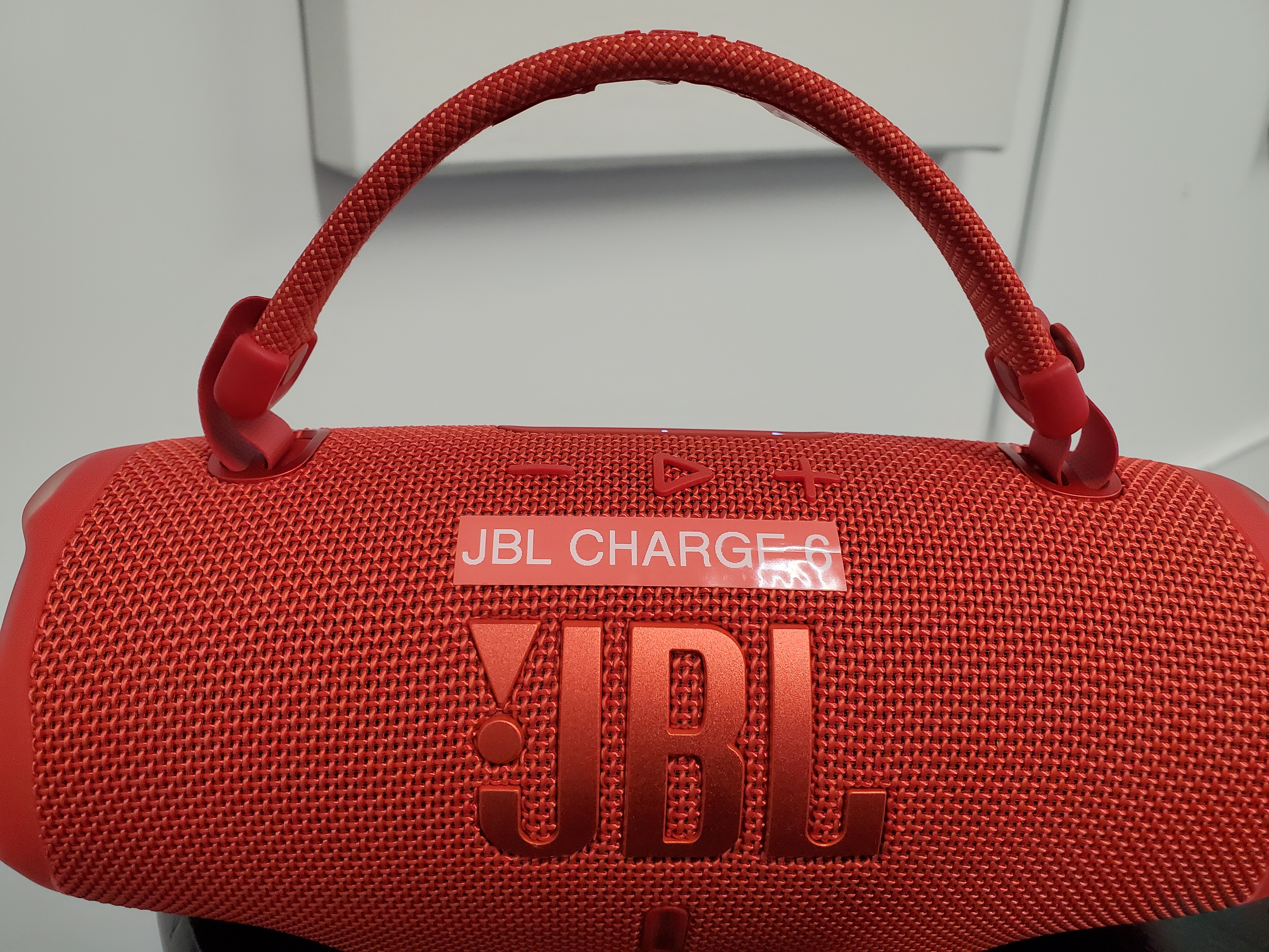 The JBL Charge 6 comes in nine colorways: 'White,' 'Blue,' 'Black,' 'Red,' 'Purple,' 'Funky,' 'Pink, 'Sand,' and 'Squad' (a camouflage-style colorway). We tested the 'Red' variant, and this is its label.