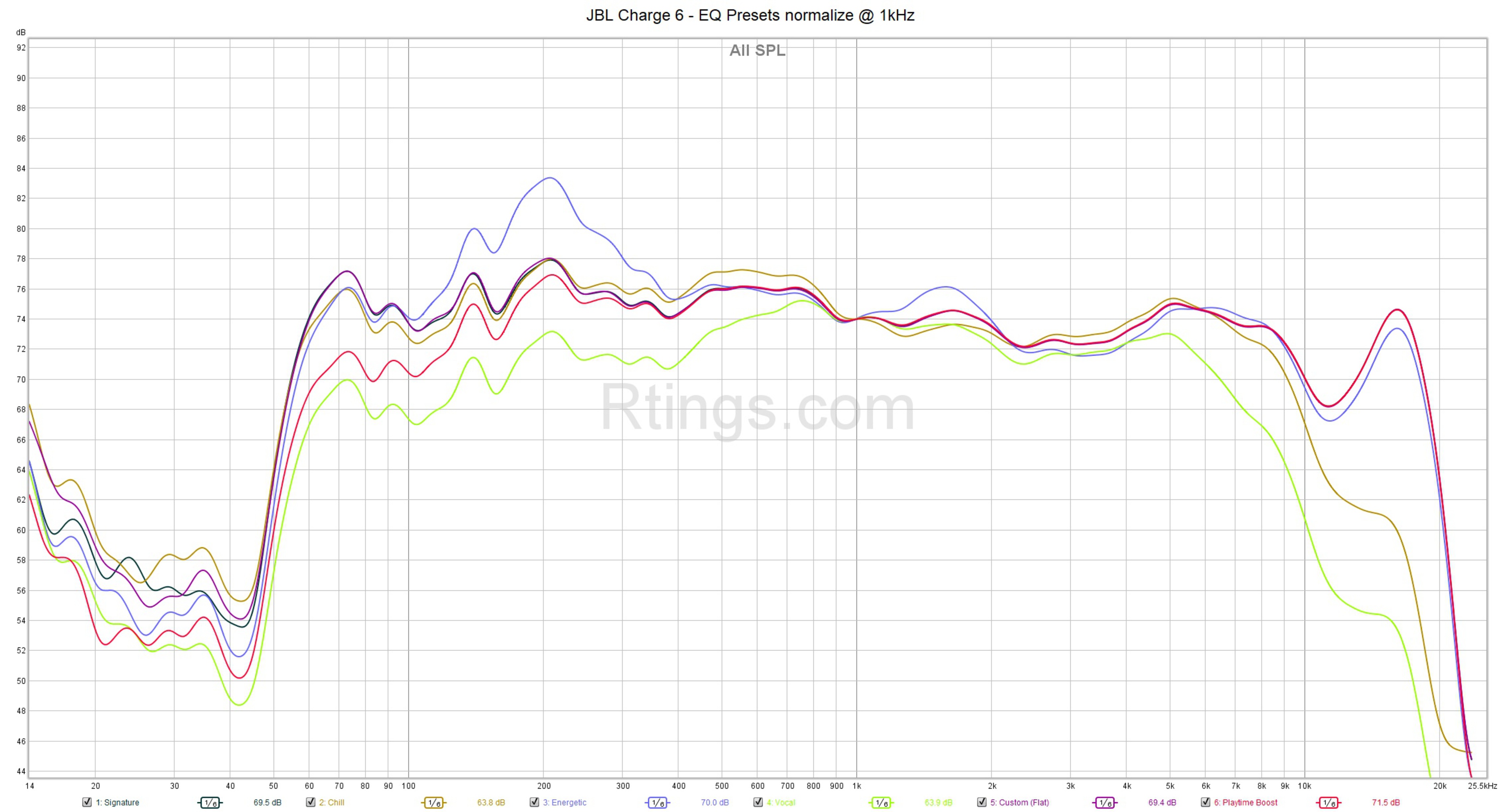 The JBL Portable App is very good. It works on both Android and iOS and adds useful functionality to your speaker. The app also lets you perform the usual functions, such as software updates and factory resets. Here's a video of the app. There's a 7-band graphic EQ that lets you tailor its sound to your liking and save your settings as a Custom preset, along with four factory presets (Signature, Chill, Energetic, and Vocal). You can also enable Playtime Boost, which extends the battery by reducing the level of the bass frequencies, as this graph of the various sound presets shows.