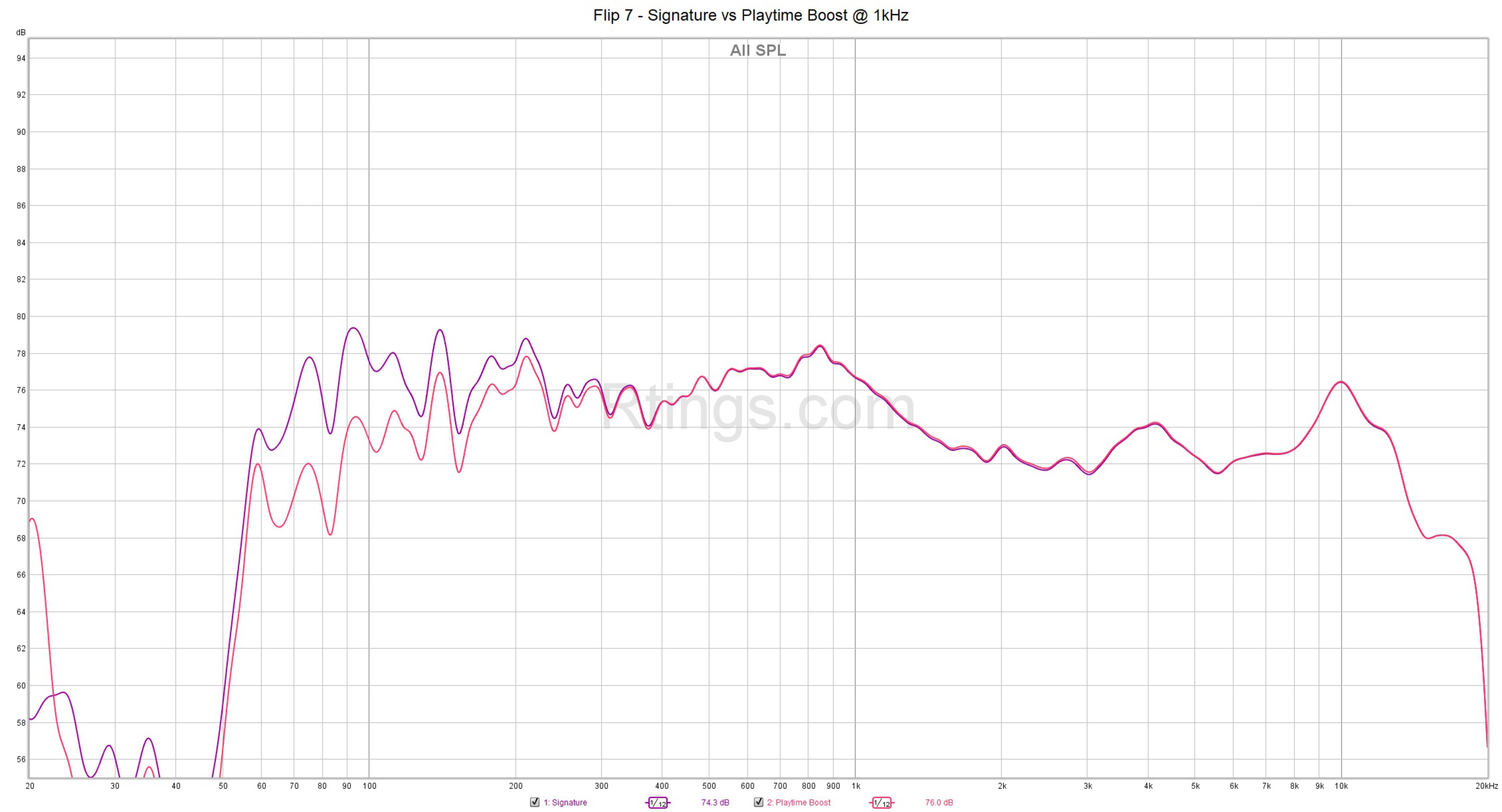 The JBL Flip 7 has middling battery performance. While it's advertised to reach 14 hours of playback, we measured 5.6 hours using our standard test. There's a battery-conserving function called PlayTime Boost, advertised to extend the battery by two hours, and it does this by altering the EQ (with less bass, as you can see here), and we measured 9.5 hours of battery life with this mode. Speaking of battery conservation, if you leave the speaker idle for 25 minutes, it'll automatically shut down. While the battery charges, you can still connect via Bluetooth and listen to the audio through the speaker.