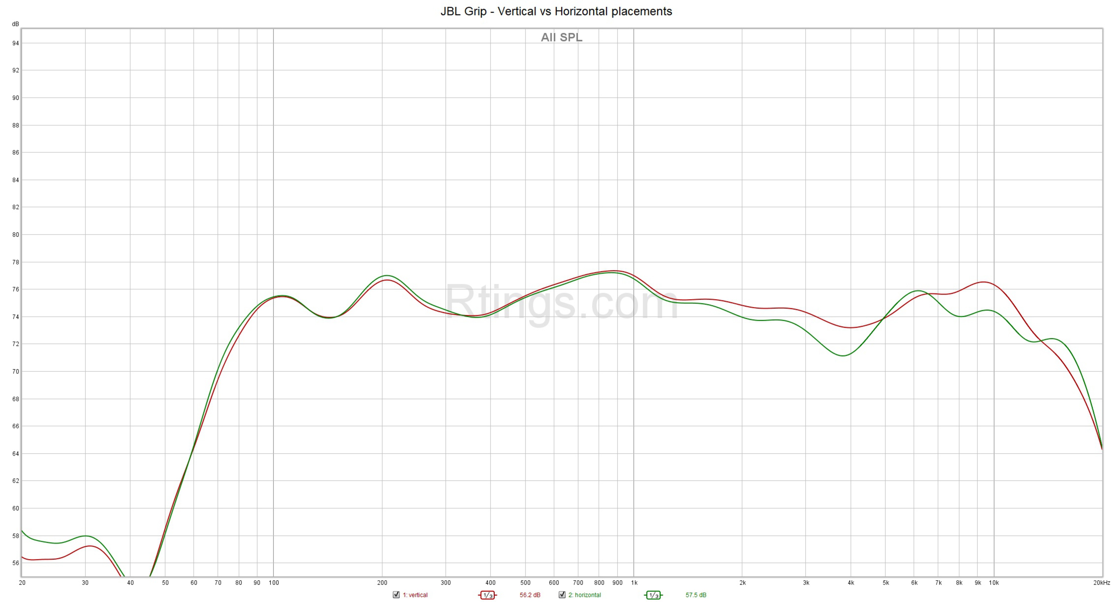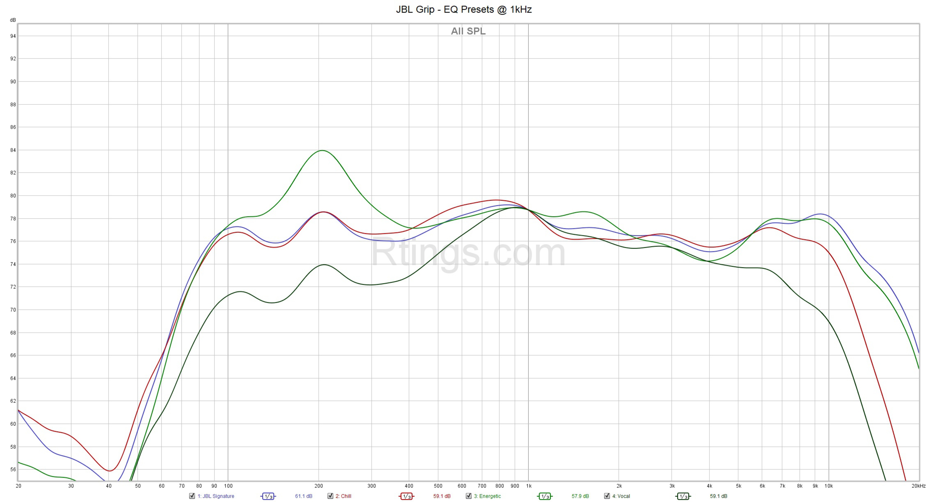 The JBL Grip has mediocre frequency response accuracy. Limited by its small size, the speaker doesn't have a full low-end, and emphasizes the mids and treble, resulting in a brighter overall tuning. We measured the default JBL 'Signature' EQ with the speaker upright, and the response works well for podcasts, audiobooks, and genres that aren't very bass-focused, like folk, ballads, and older pop music. There's still some low-end boom and punch to punctuate the beat, but you might miss the thump on 808 kicks in genres like hip-hop and EDM. The mids and treble are relatively balanced for clear vocals and acoustic guitar in songs like Grass by XTC. You can also select one of the EQ presets via the app to get an even more excited or laid-back sound.