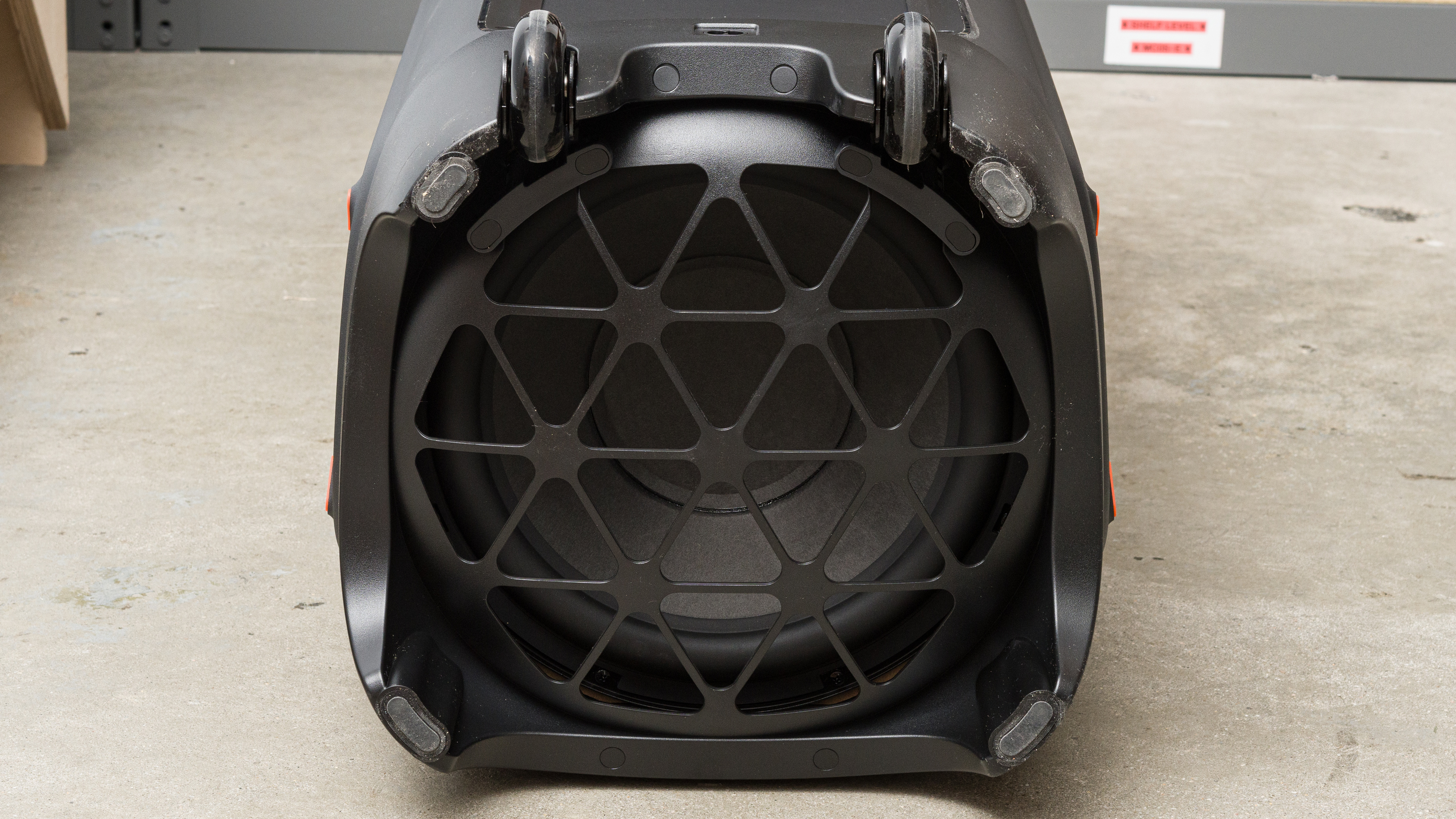 This speaker has a decent build quality. It's not the most premium feeling, but the materials feel good overall, giving it a solid and sturdy construction. It's mostly made of plastic, with metal grilles to help protect the drivers inside. Rubberized feet on the bottom of the speaker help hold it in place. The wheels roll well, too. The carrying handle isn't texturized, though, which makes it more difficult to grip, and it isn't the most comfortable to hold, especially if you're wheeling the speaker over a longer distance. Also, this speaker isn't rated for dust or water resistance, so exercise caution if you plan to use it near a water source.