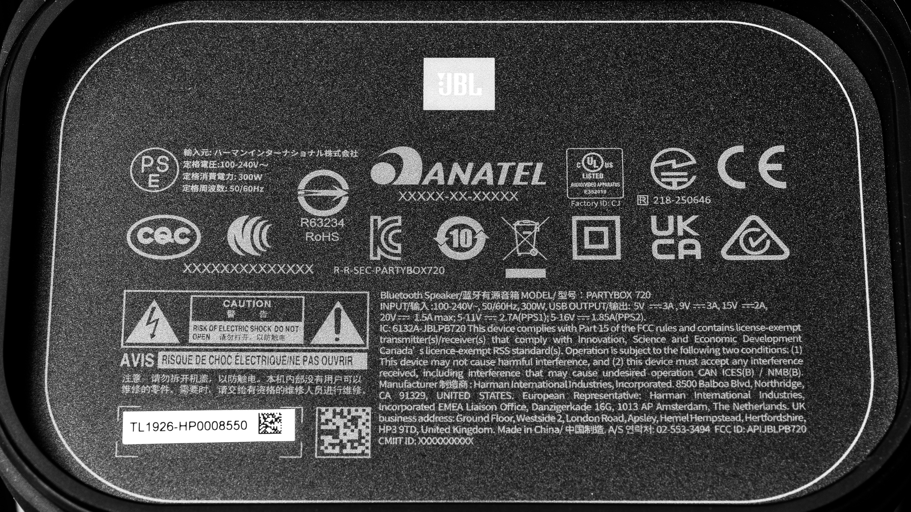 The JBL PartyBox 720 is available in 'Black,' and we took a picture of our unit's label. If you encounter another variant of this speaker, please let us know in the comments, and we'll update our review.